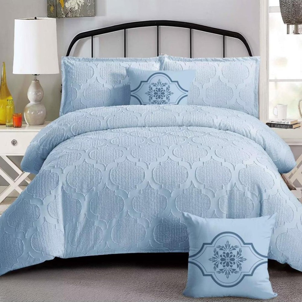 Lenjerie de pat dublu din finet satinat, 4 anotimpuri, cu smocuri brodate (tesatura din fabrica, ci nu imprimata, cu inaltime de 1 cm), confectionata din bumbac 100%, cu 6 piese. Materialul are un aspect lucios, cu smocuri brodate in relief, pentru o nota de eleganta si rafinament, facand astfel tesatura speciala atat prin calitate cat si prin design-ul sau unic.