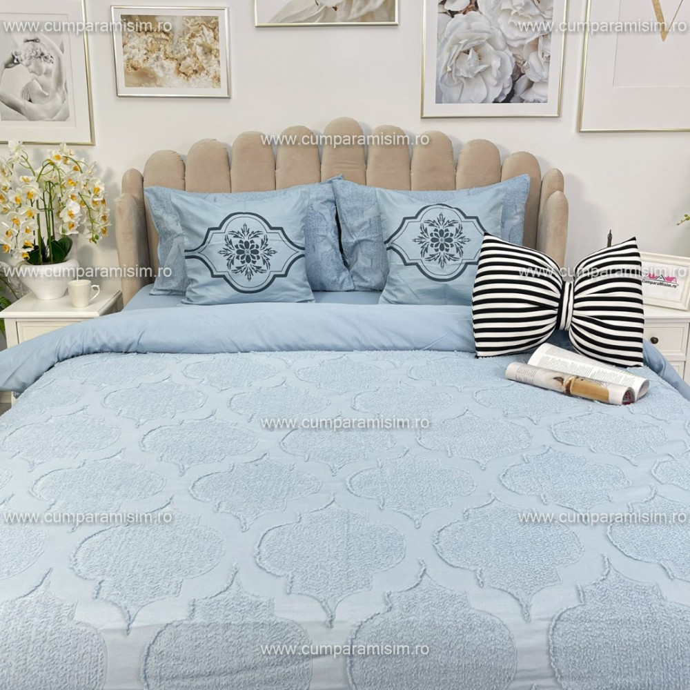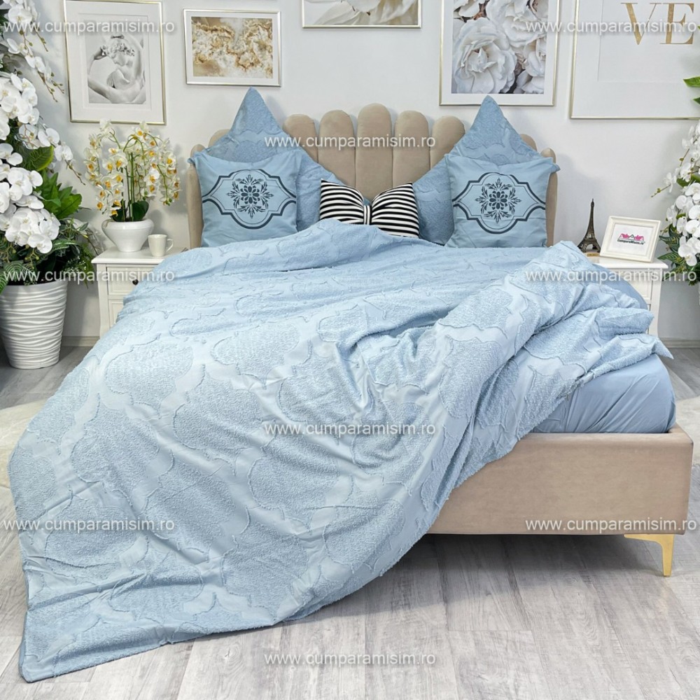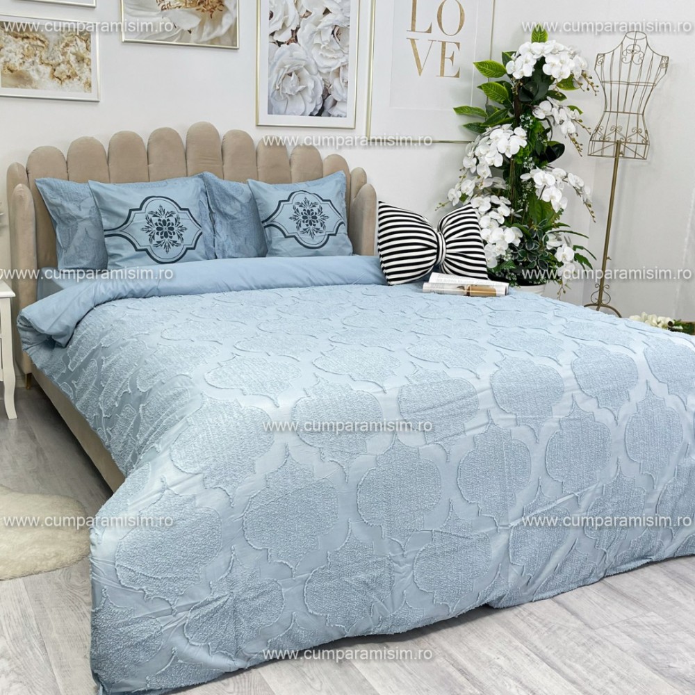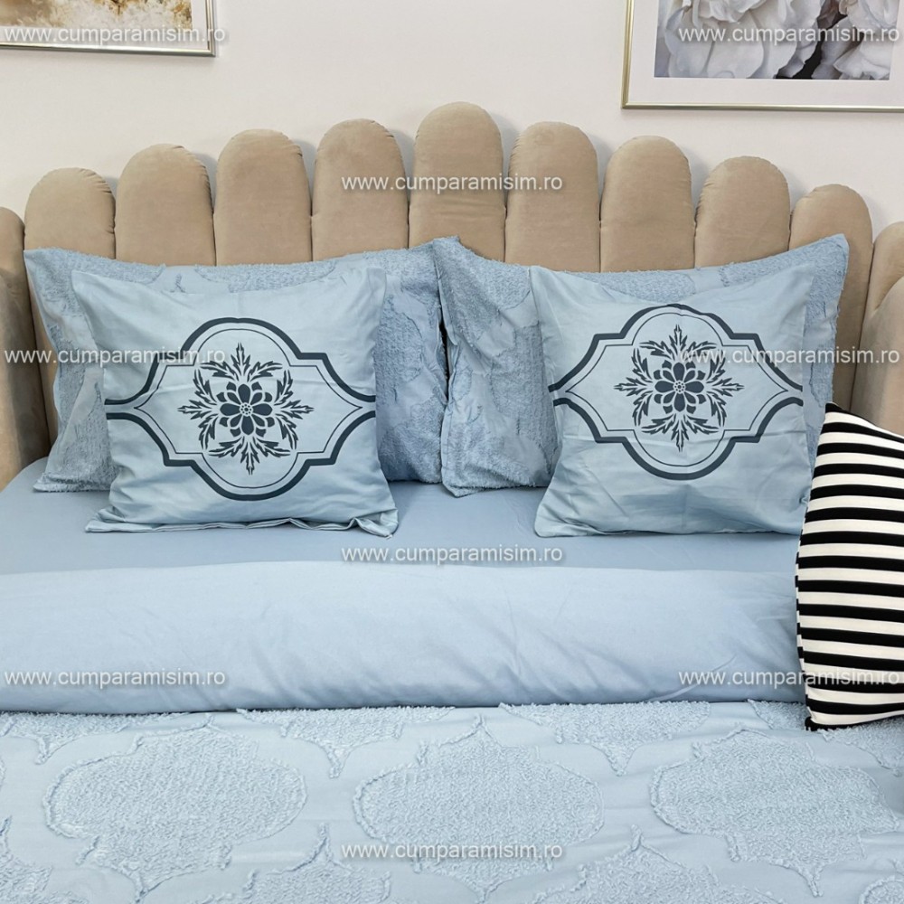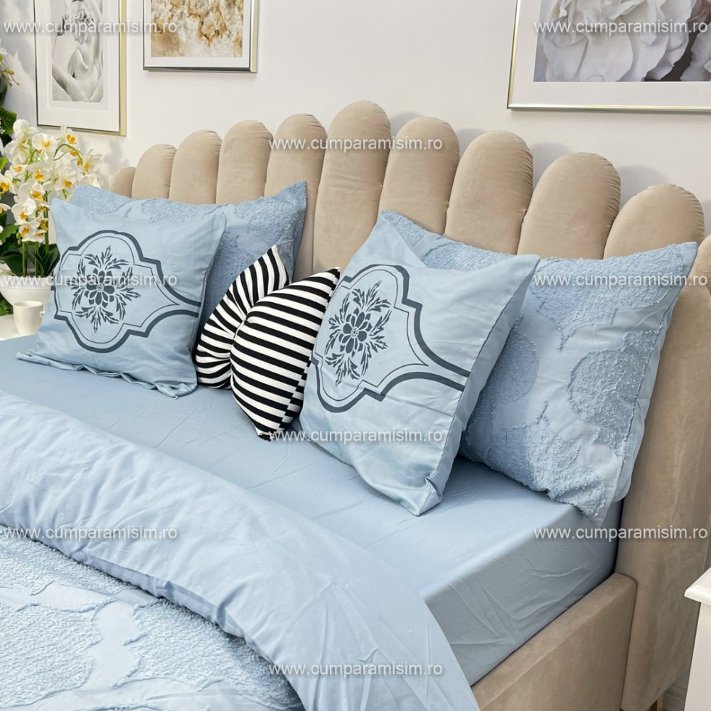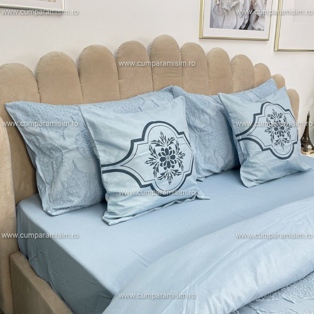 Lenjerie pat dublu, Finet Satinat Deluxe cu Smocuri Brodate, IDENTICA CU POZA, cu elastic, 4 anotimpuri, 6 piese, model royal, gri albastrui, Primavara Casa, cod produs: PRC406
