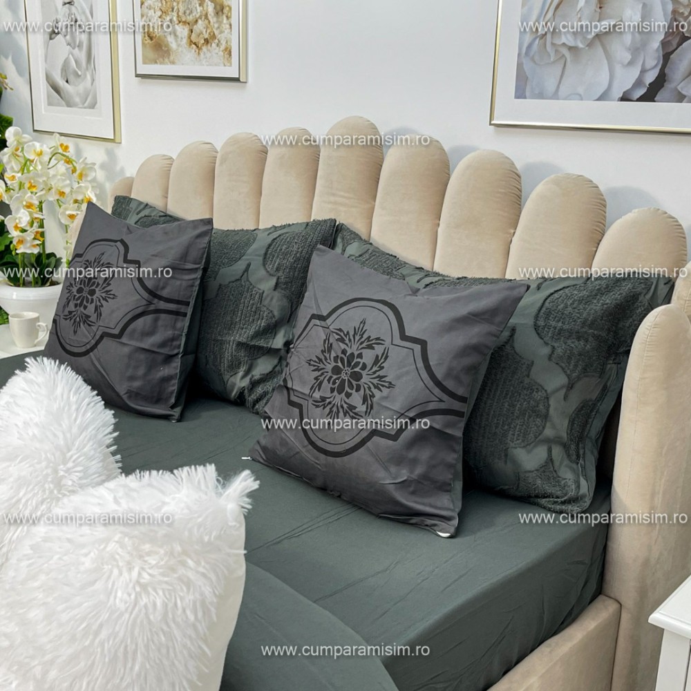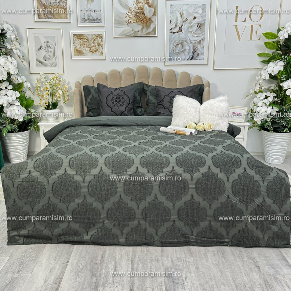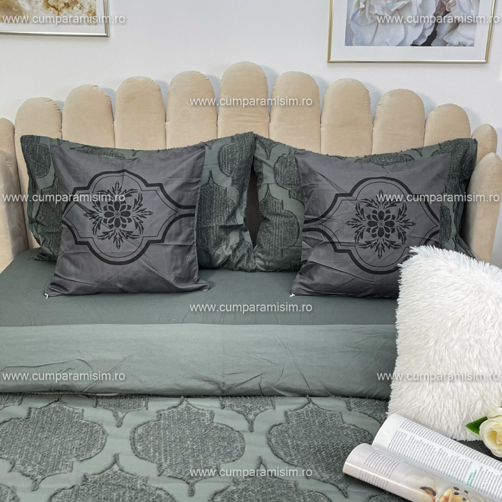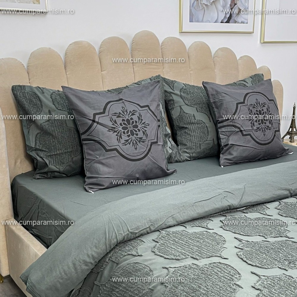 Lenjerie pat dublu, Finet Satinat Deluxe cu Smocuri Brodate, IDENTICA CU POZA, cu elastic, 4 anotimpuri, 6 piese, model royal, gri verzui, Primavara Casa, cod produs: PRC405