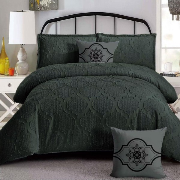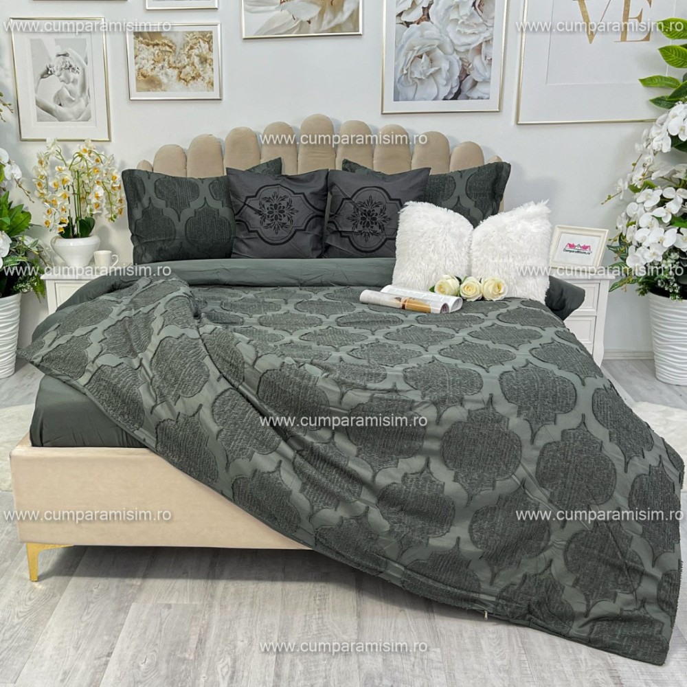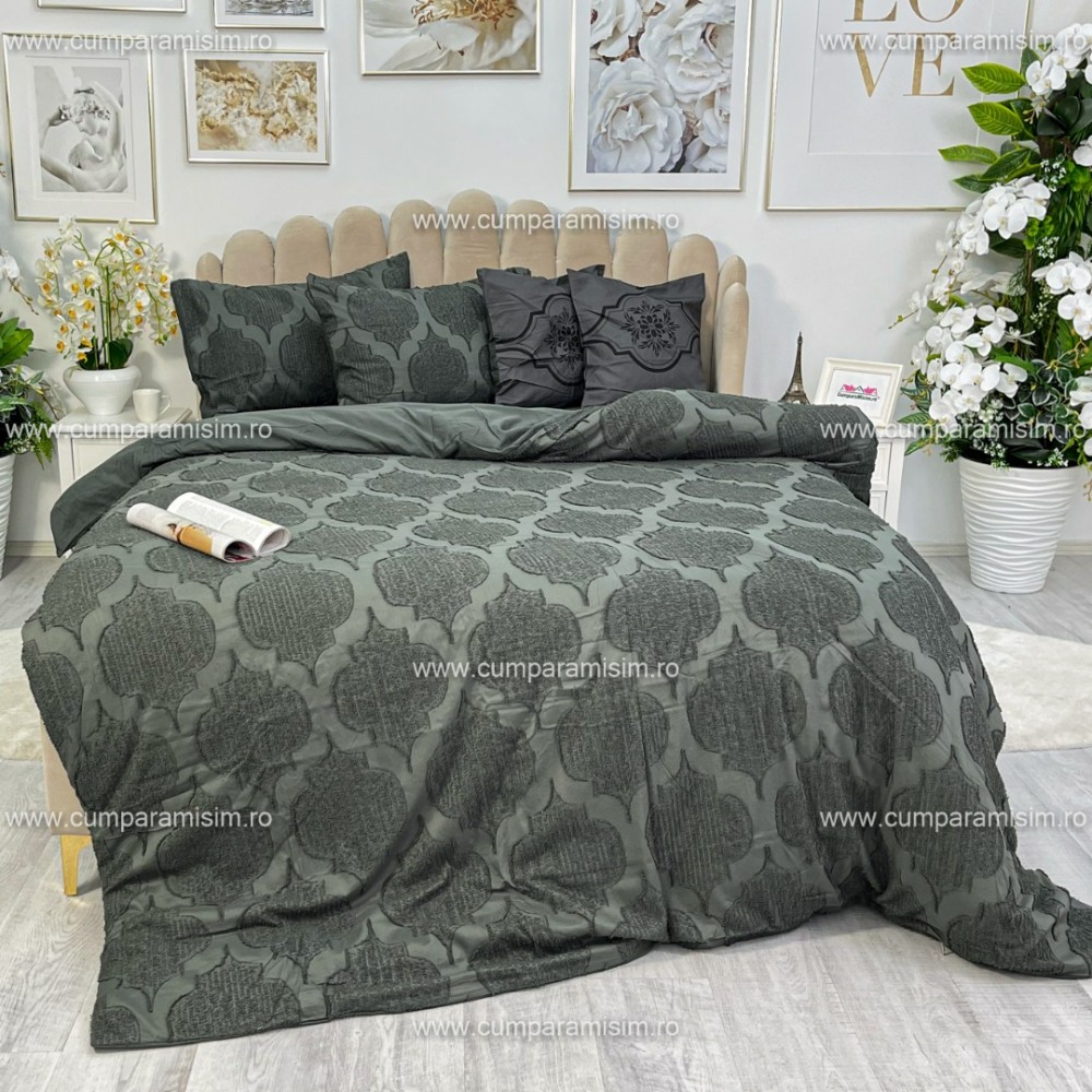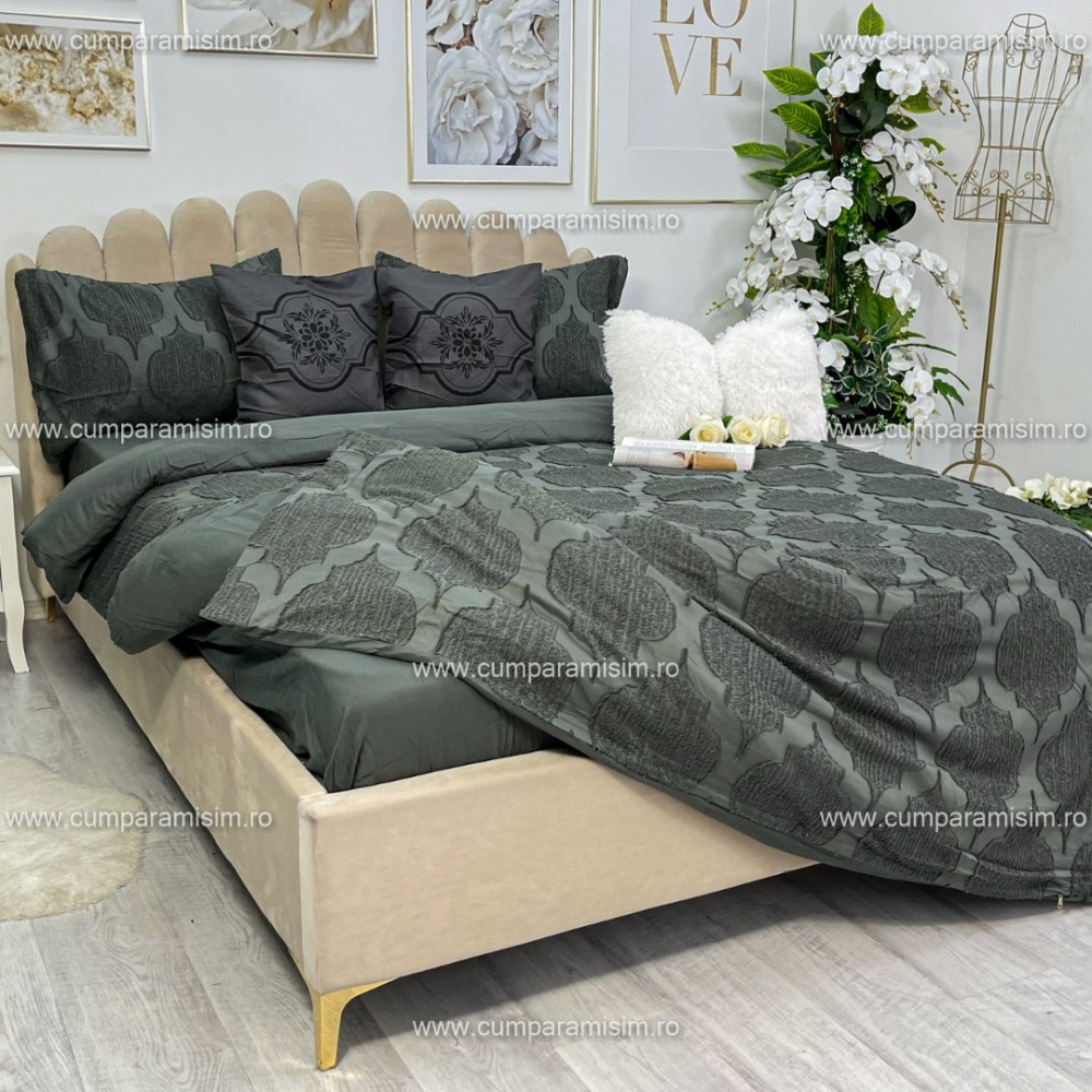 Lenjerie pat dublu, Finet Satinat Deluxe cu Smocuri Brodate, IDENTICA CU POZA, cu elastic, 4 anotimpuri, 6 piese, model royal, gri verzui, Primavara Casa, cod produs: PRC405