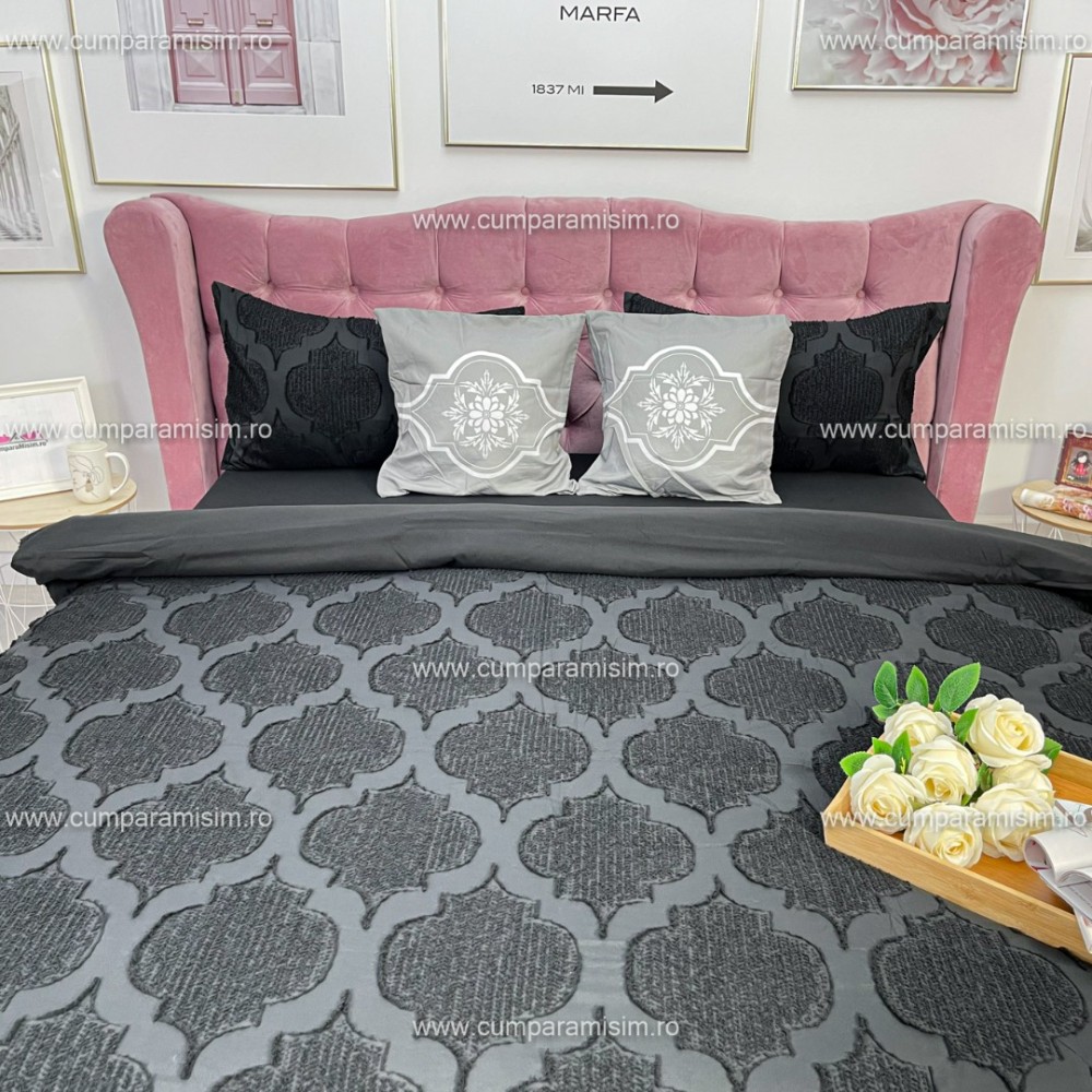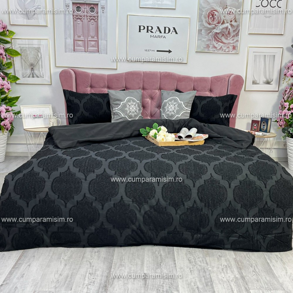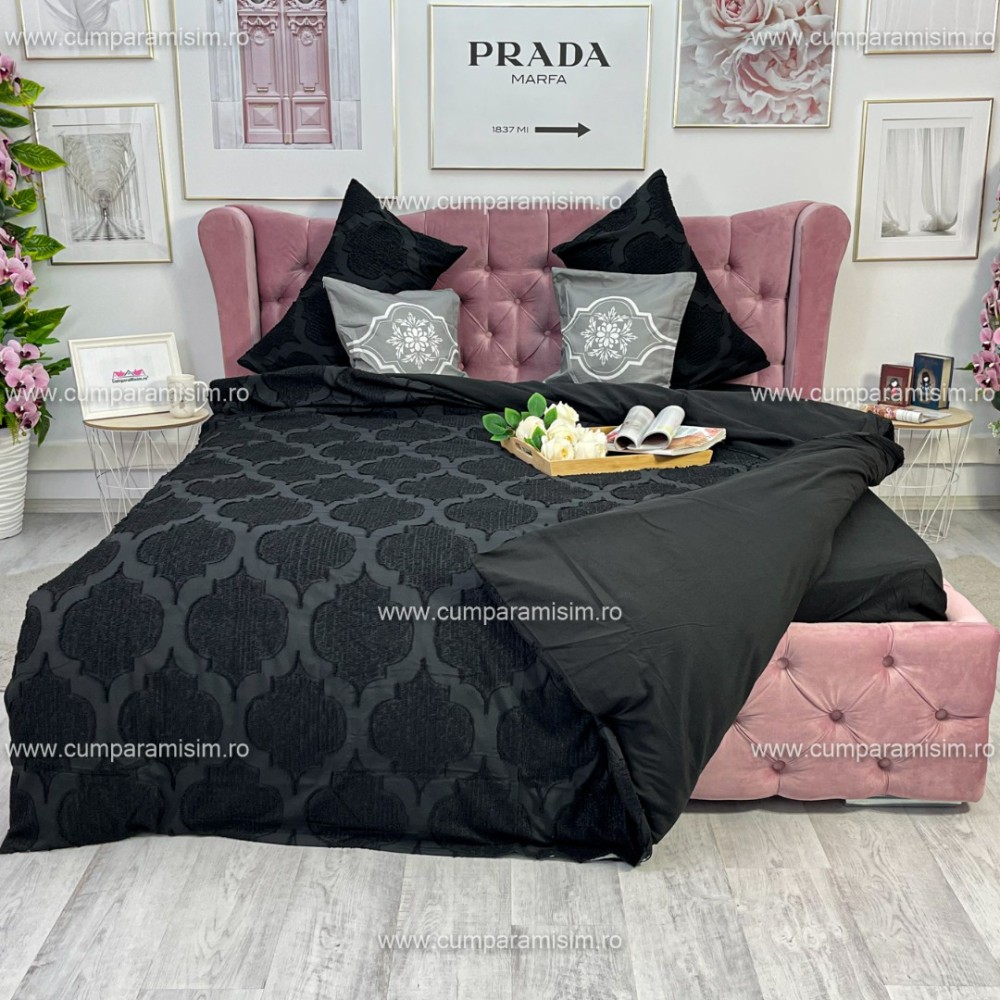 Lenjerie pat dublu, Finet Satinat Deluxe cu Smocuri Brodate, IDENTICA CU POZA, cu elastic, 4 anotimpuri, 6 piese, model royal, negru, Primavara Casa, cod produs: PRC410