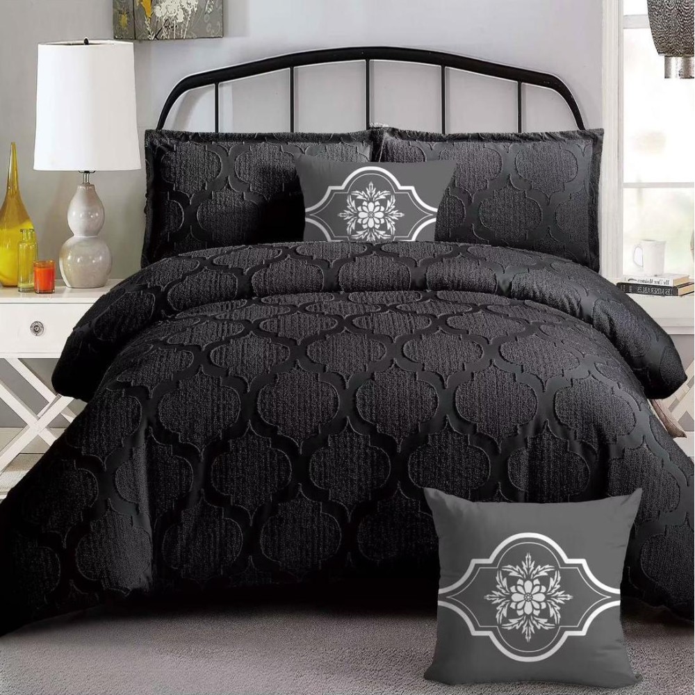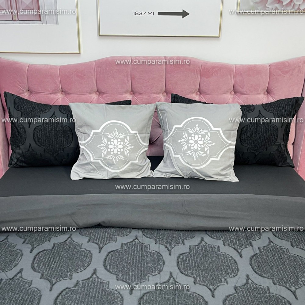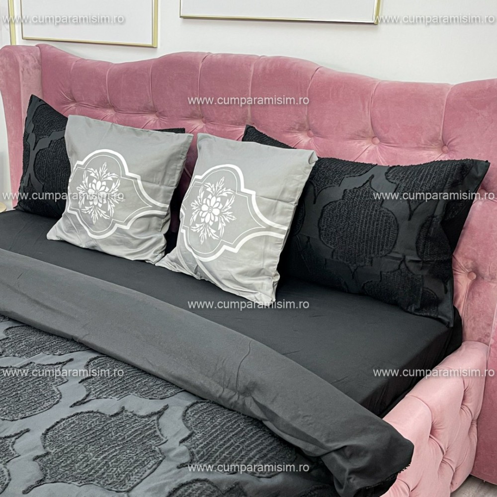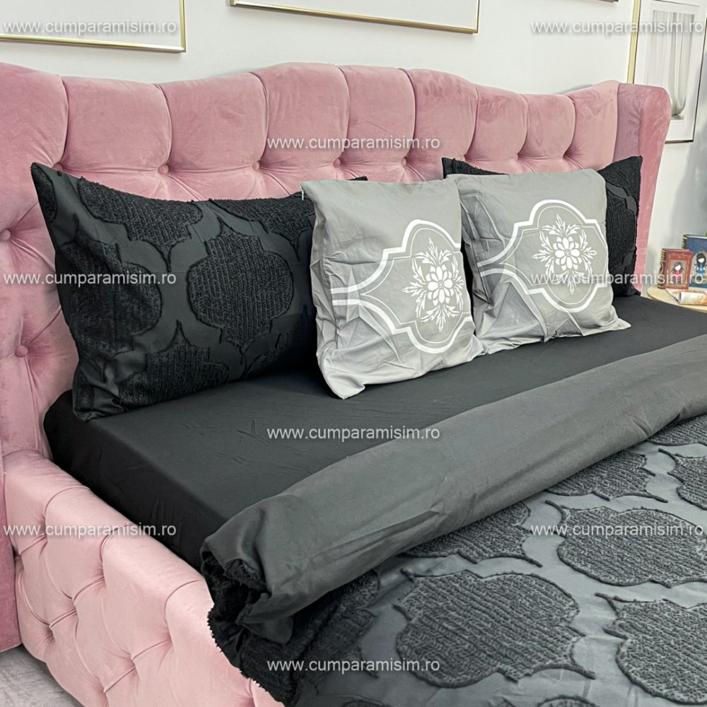 Lenjerie pat dublu, Finet Satinat Deluxe cu Smocuri Brodate, IDENTICA CU POZA, cu elastic, 4 anotimpuri, 6 piese, model royal, negru, Primavara Casa, cod produs: PRC410