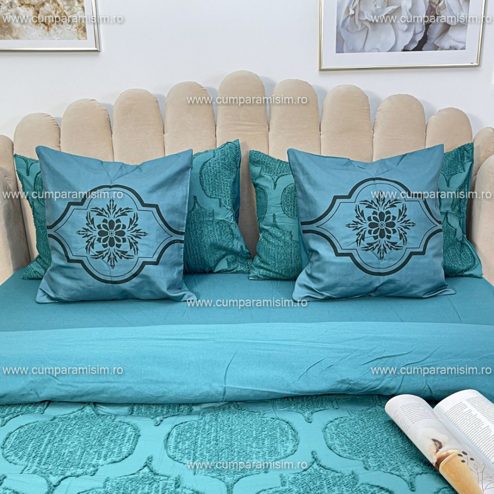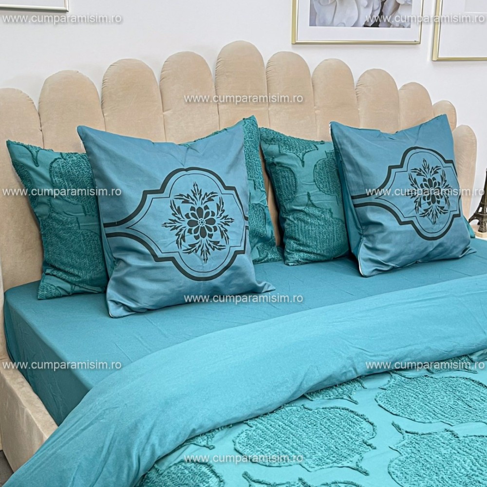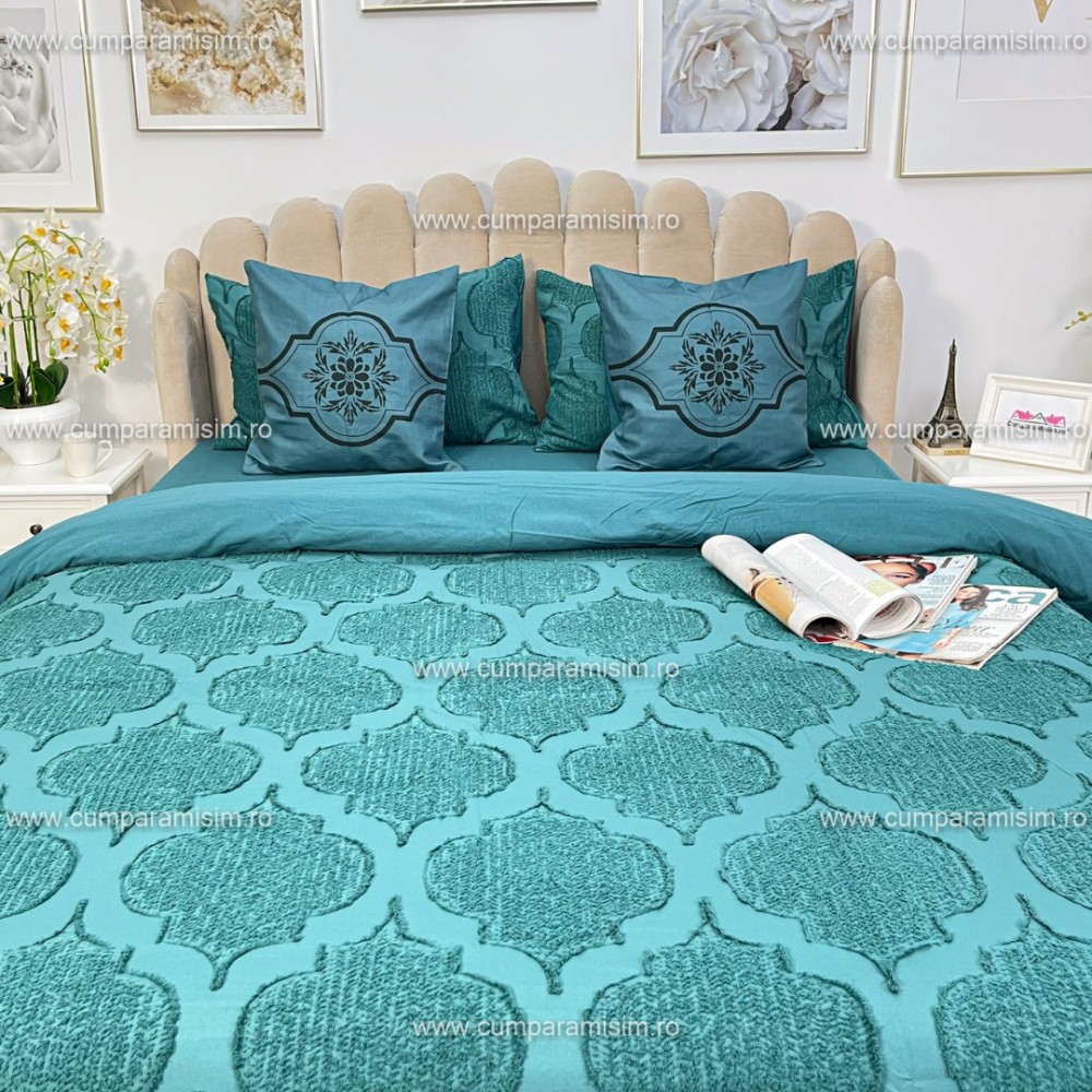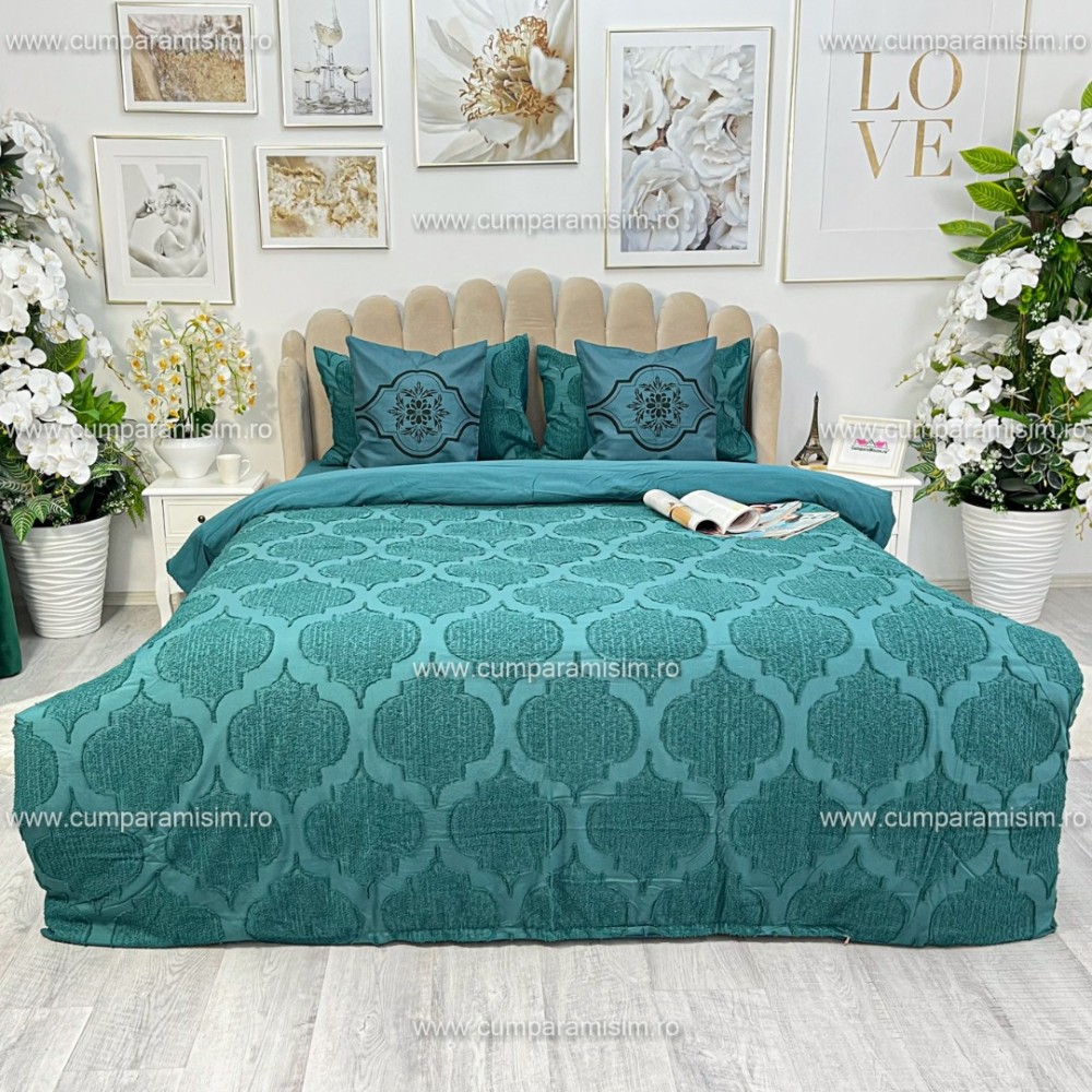 Lenjerie pat dublu, Finet Satinat Deluxe cu Smocuri Brodate, IDENTICA CU POZA, cu elastic, 4 anotimpuri, 6 piese, model royal, verde, Primavara Casa, cod produs: PRC408