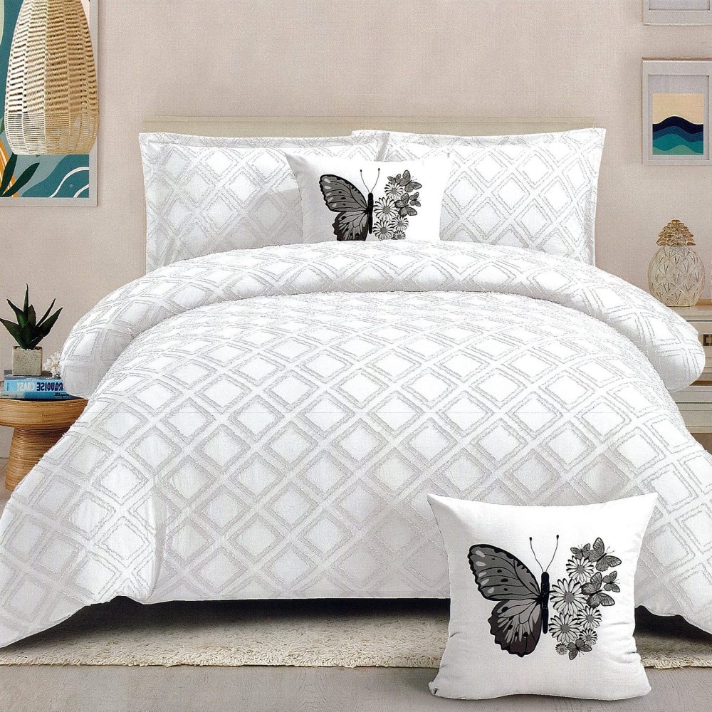 Lenjerie pat dublu, Finet Satinat Deluxe cu Smocuri Brodate, IDENTICA CU POZA, cu elastic, 4 anotimpuri, 6 piese, romburi, alb, Primavara Casa, cod produs: PRC450