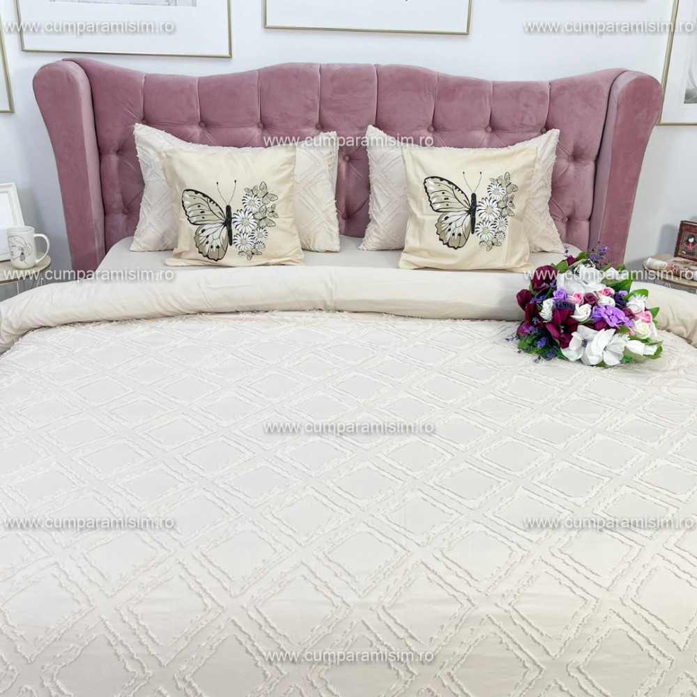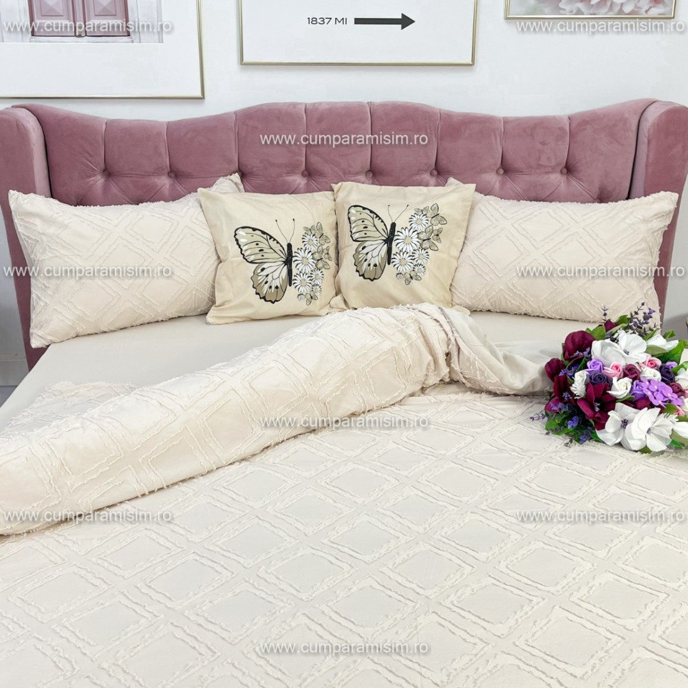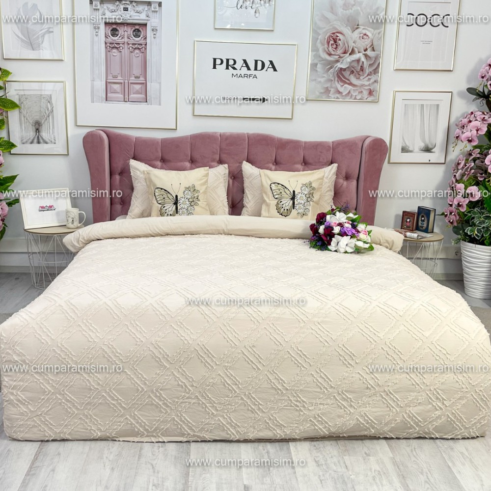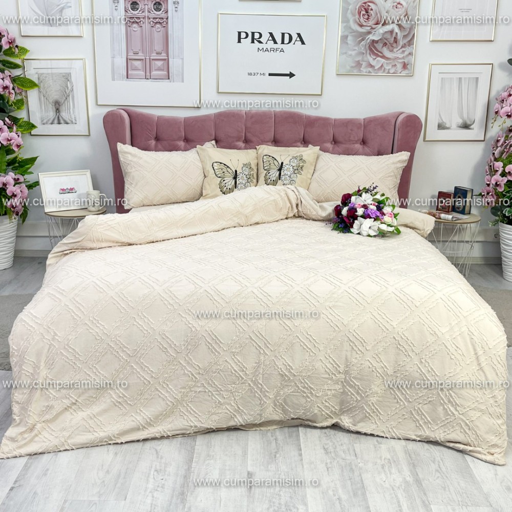 Lenjerie pat dublu, Finet Satinat Deluxe cu Smocuri Brodate, IDENTICA CU POZA, cu elastic, 4 anotimpuri, 6 piese, romburi, bej, Primavara Casa, cod produs: PRC454