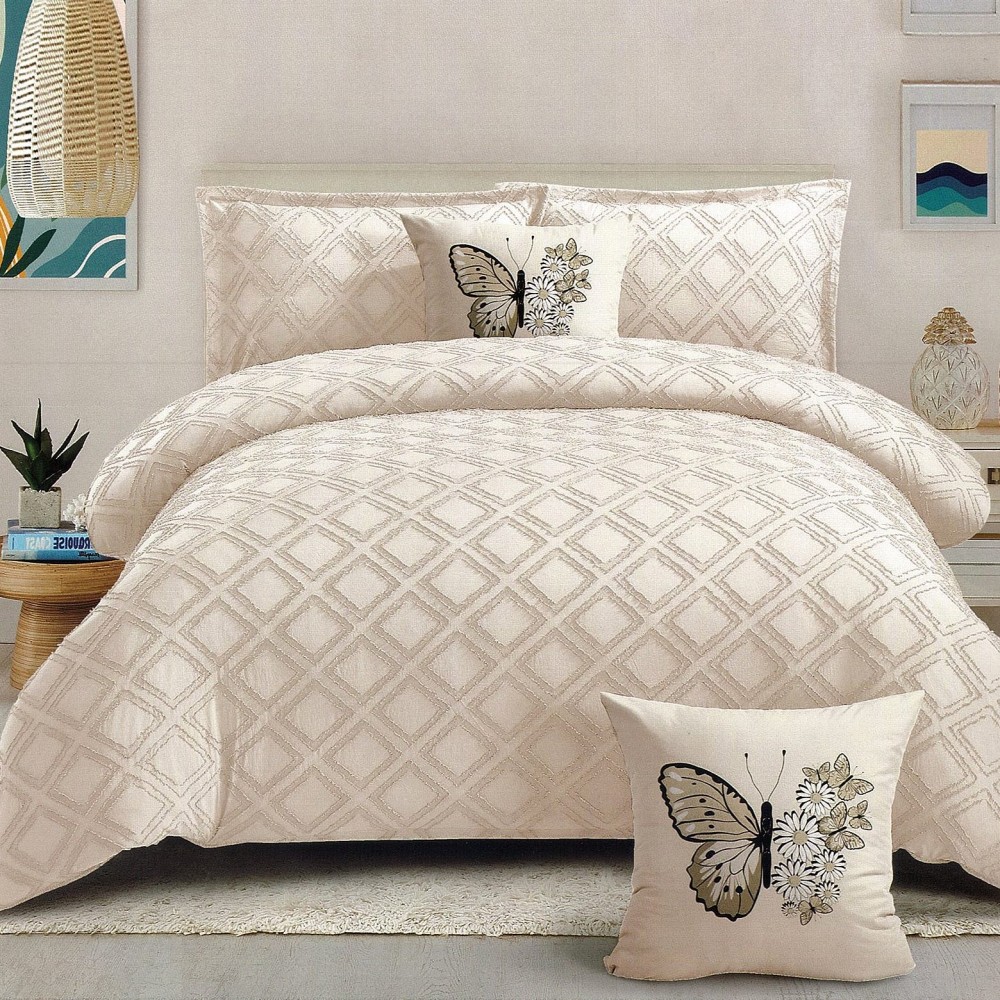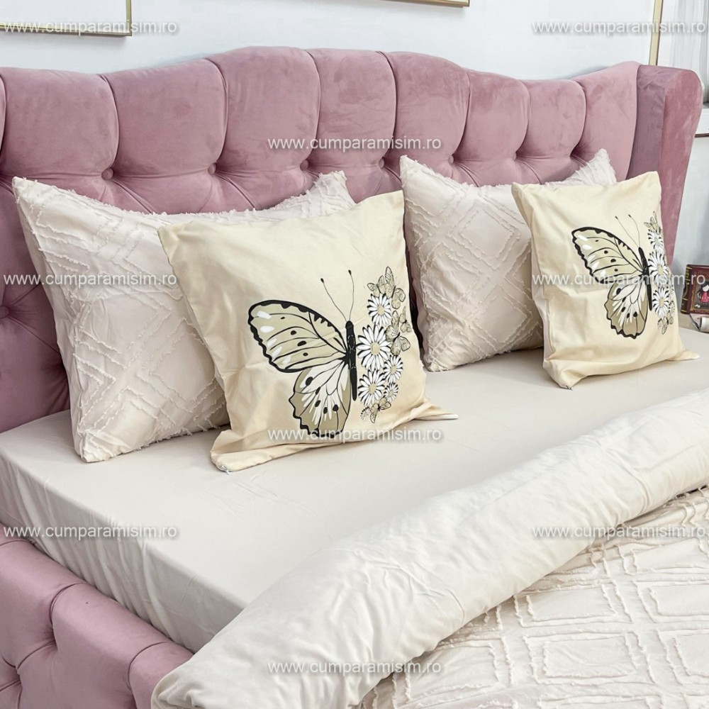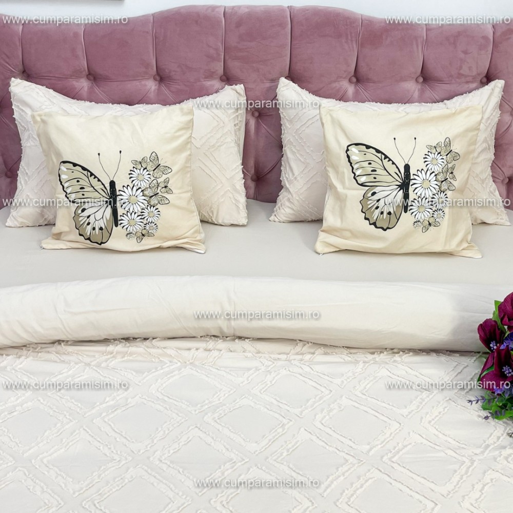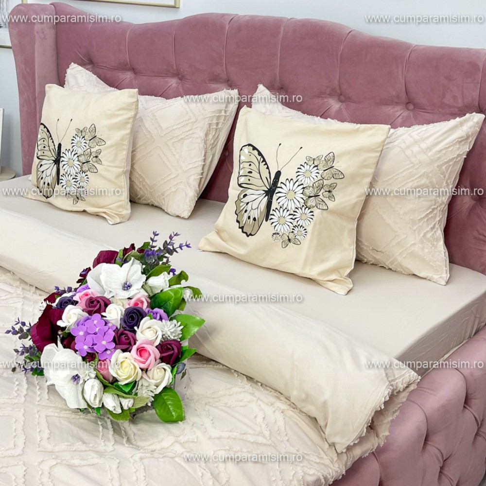 Lenjerie pat dublu, Finet Satinat Deluxe cu Smocuri Brodate, IDENTICA CU POZA, cu elastic, 4 anotimpuri, 6 piese, romburi, bej, Primavara Casa, cod produs: PRC454