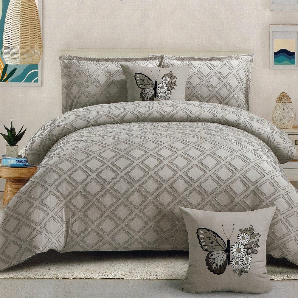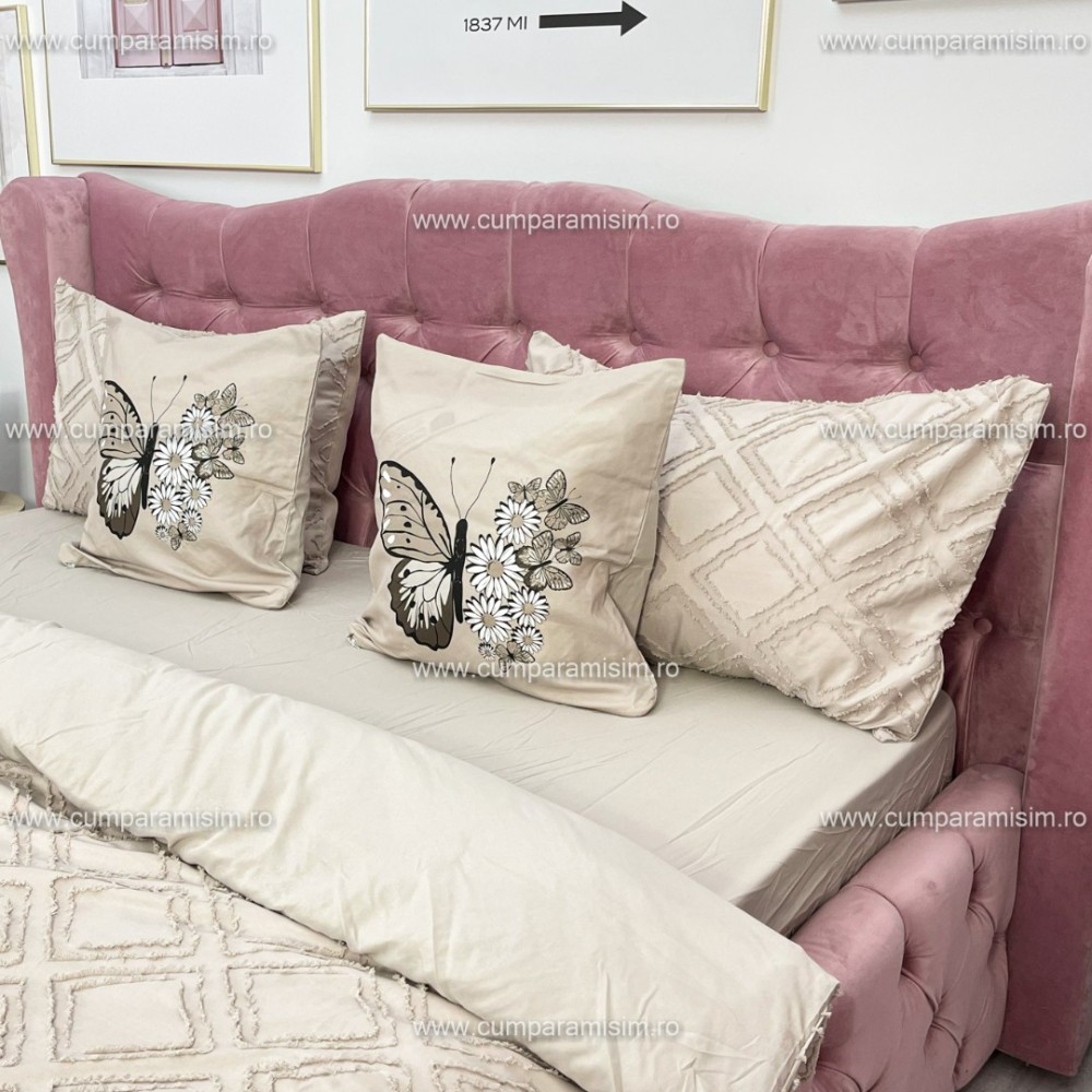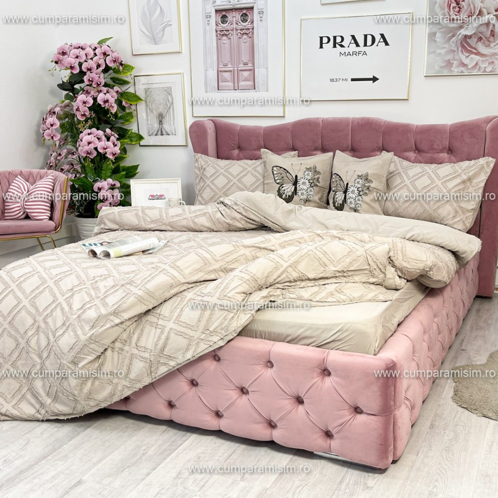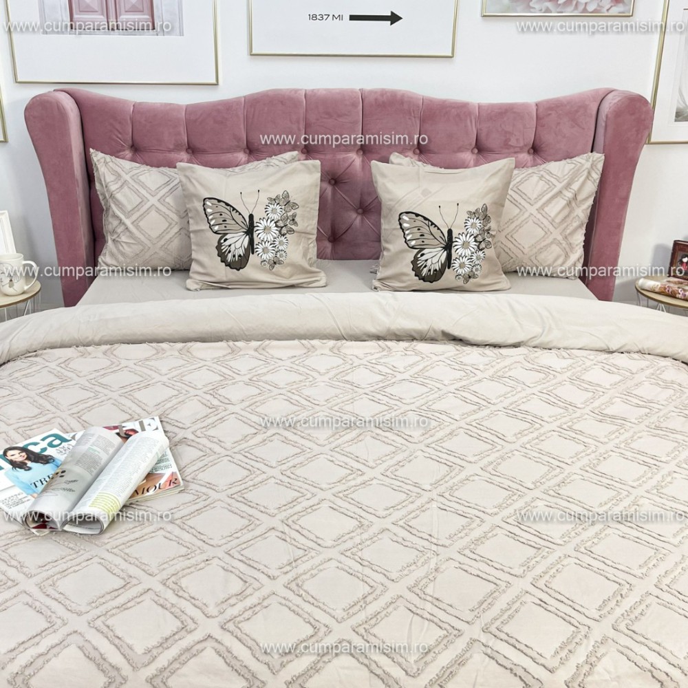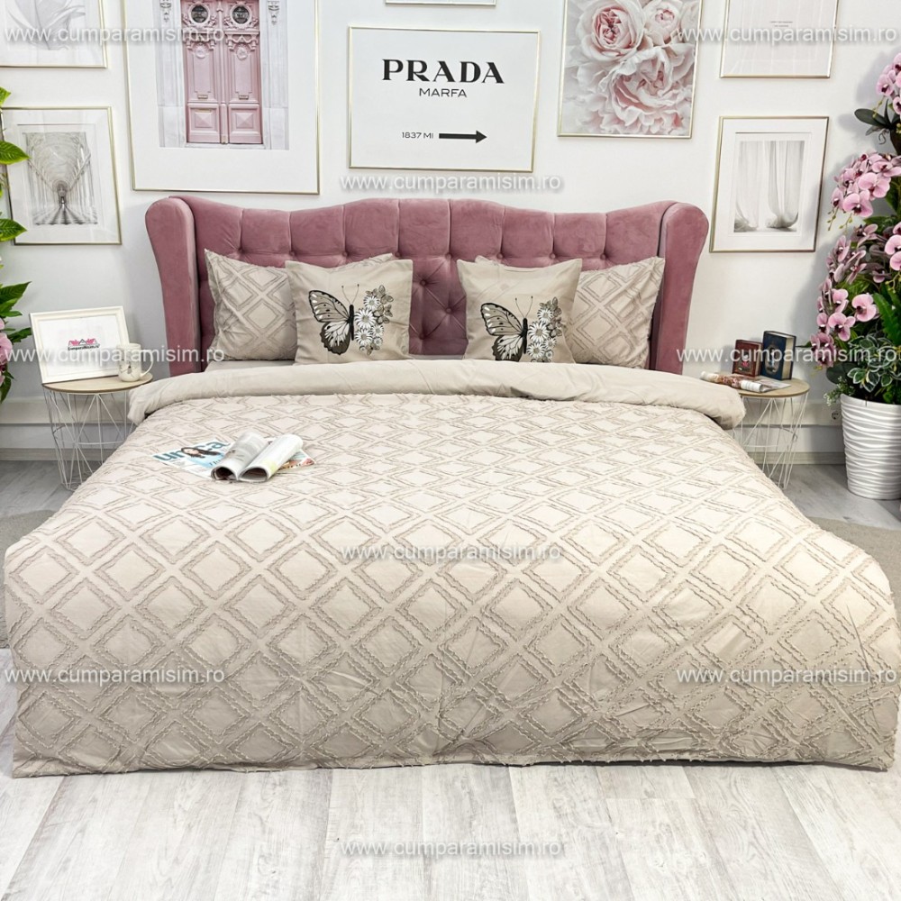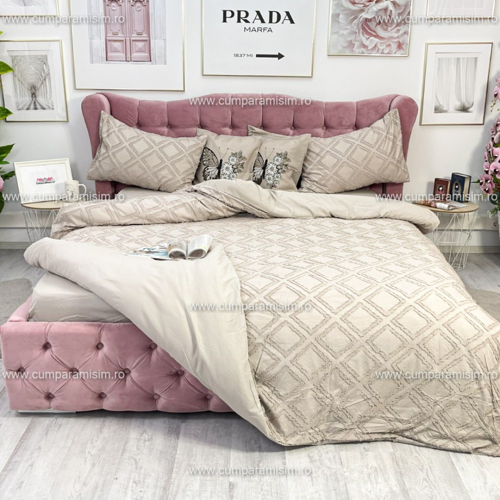 Lenjerie pat dublu, Finet Satinat Deluxe cu Smocuri Brodate, IDENTICA CU POZA, cu elastic, 4 anotimpuri, 6 piese, romburi, grej, Primavara Casa, cod produs: PRC460
