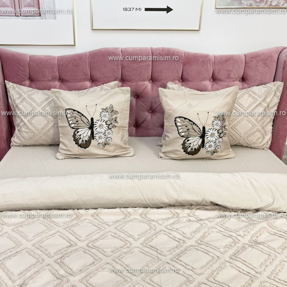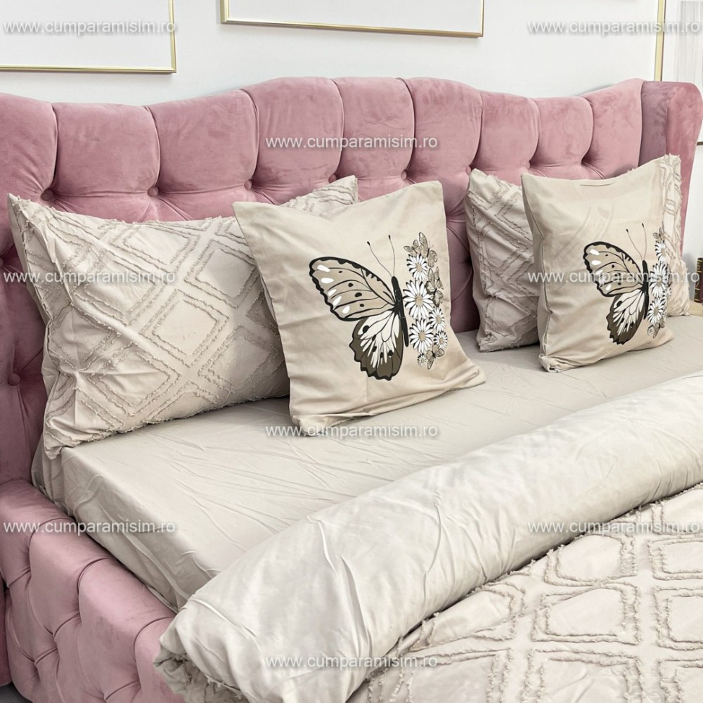 Lenjerie de pat dublu din finet satinat, 4 anotimpuri, cu smocuri brodate (tesatura din fabrica, ci nu imprimata, cu inaltime de 1 cm), confectionata din bumbac 100%, cu 6 piese. Materialul are un aspect lucios, cu smocuri brodate in relief, pentru o nota de eleganta si rafinament, facand astfel tesatura speciala atat prin calitate cat si prin design-ul sau unic.