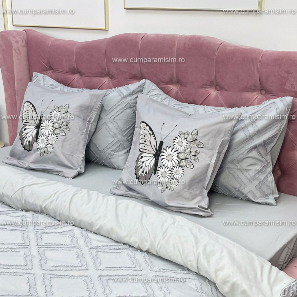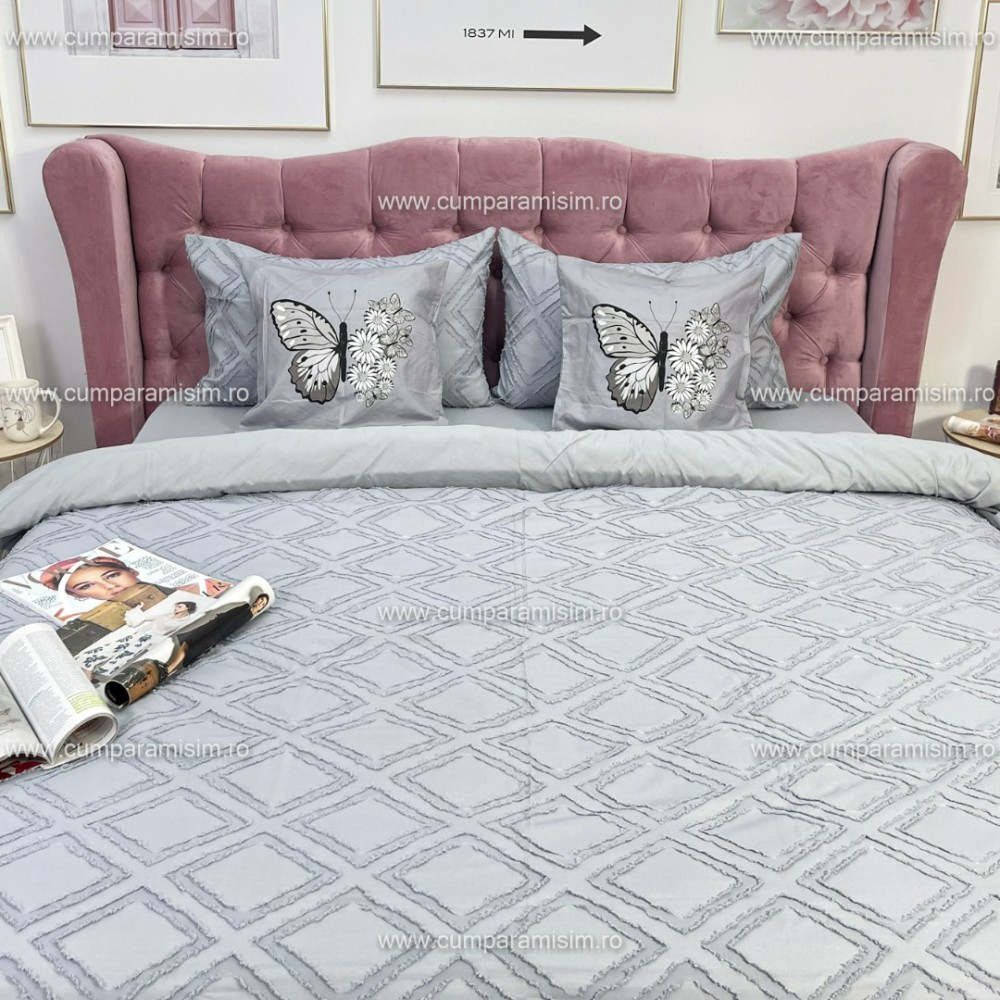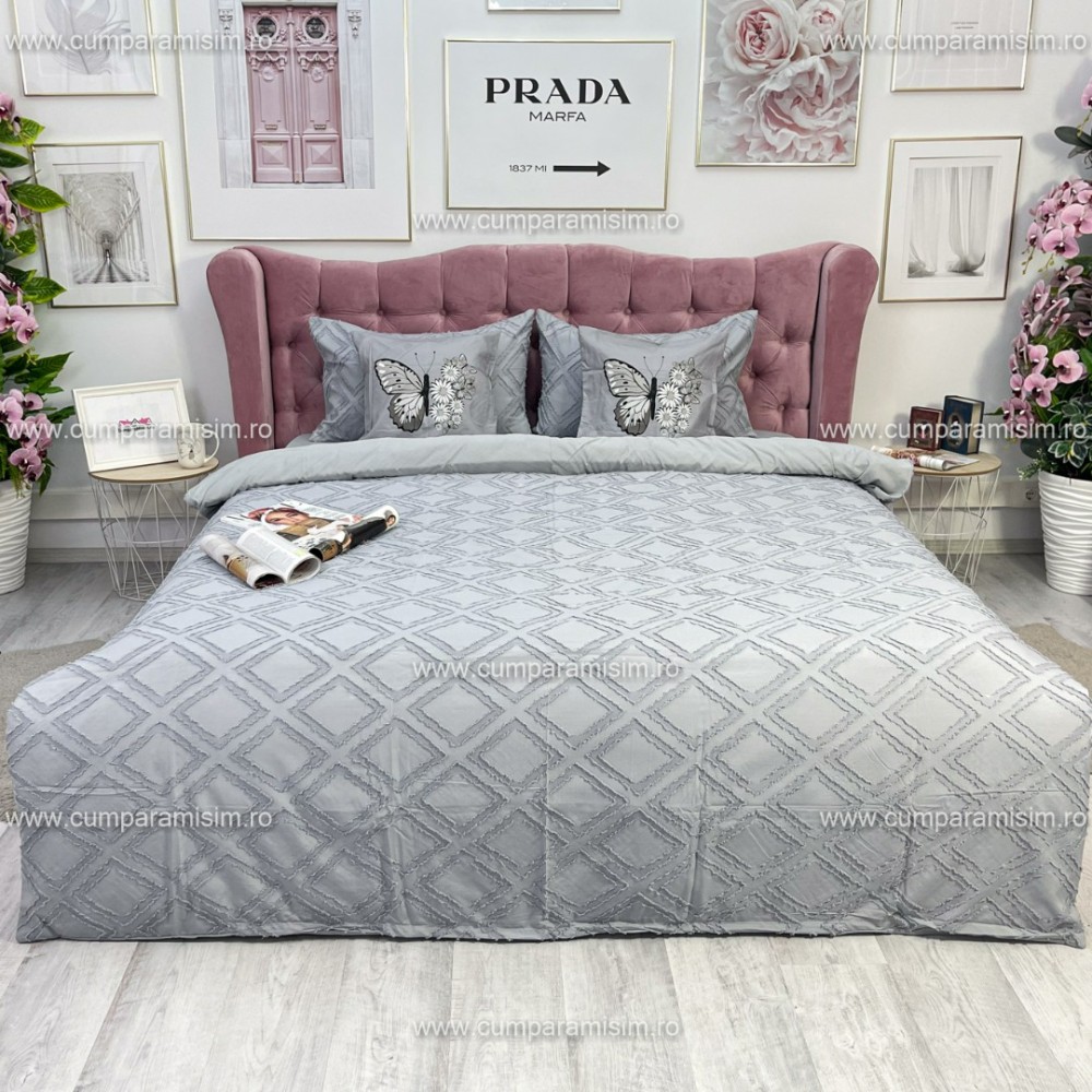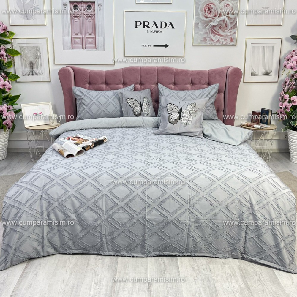 Lenjerie pat dublu, Finet Satinat Deluxe cu Smocuri Brodate, IDENTICA CU POZA, cu elastic, 4 anotimpuri, 6 piese, romburi, gri deschis, Primavara Casa, cod produs: PRC457