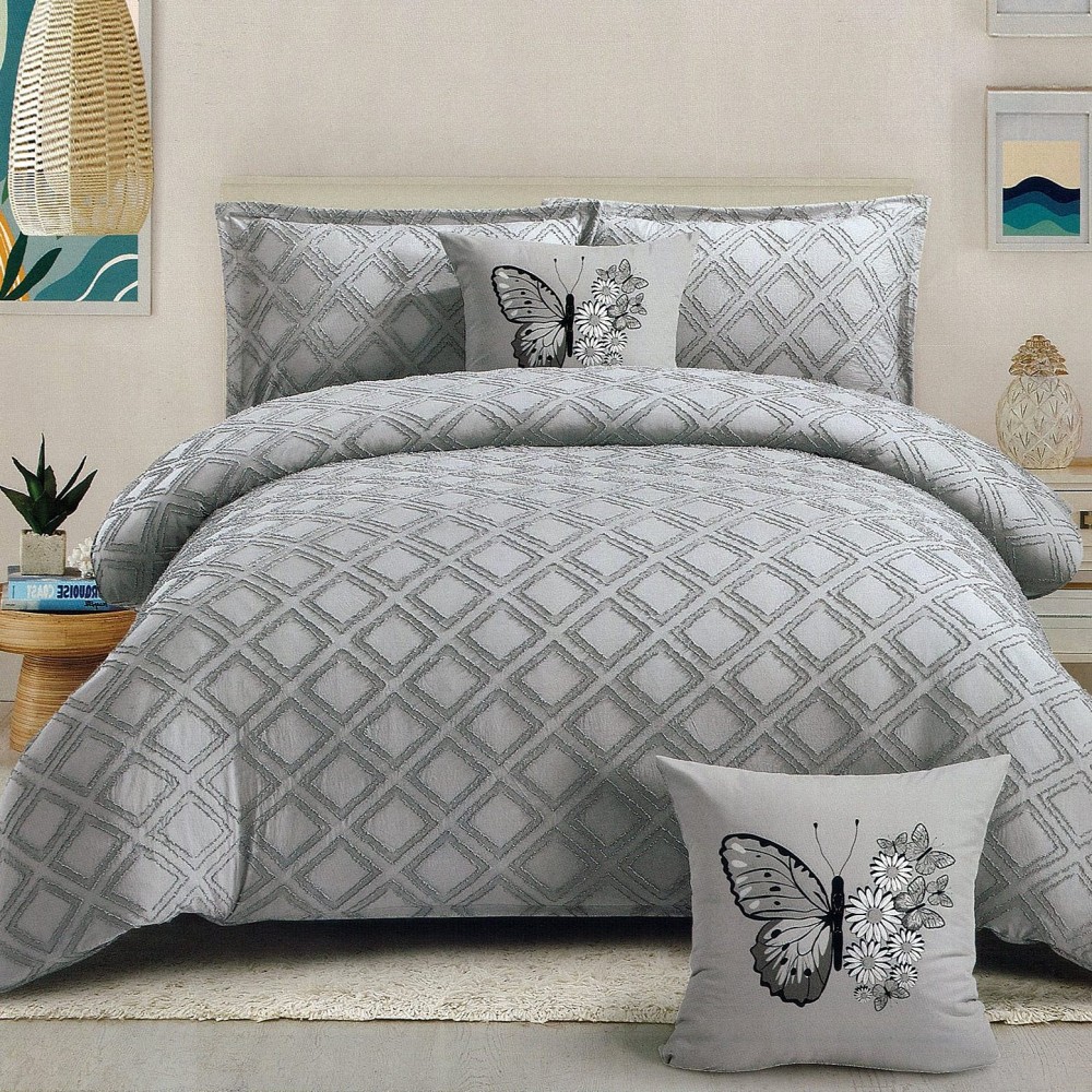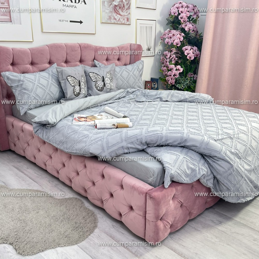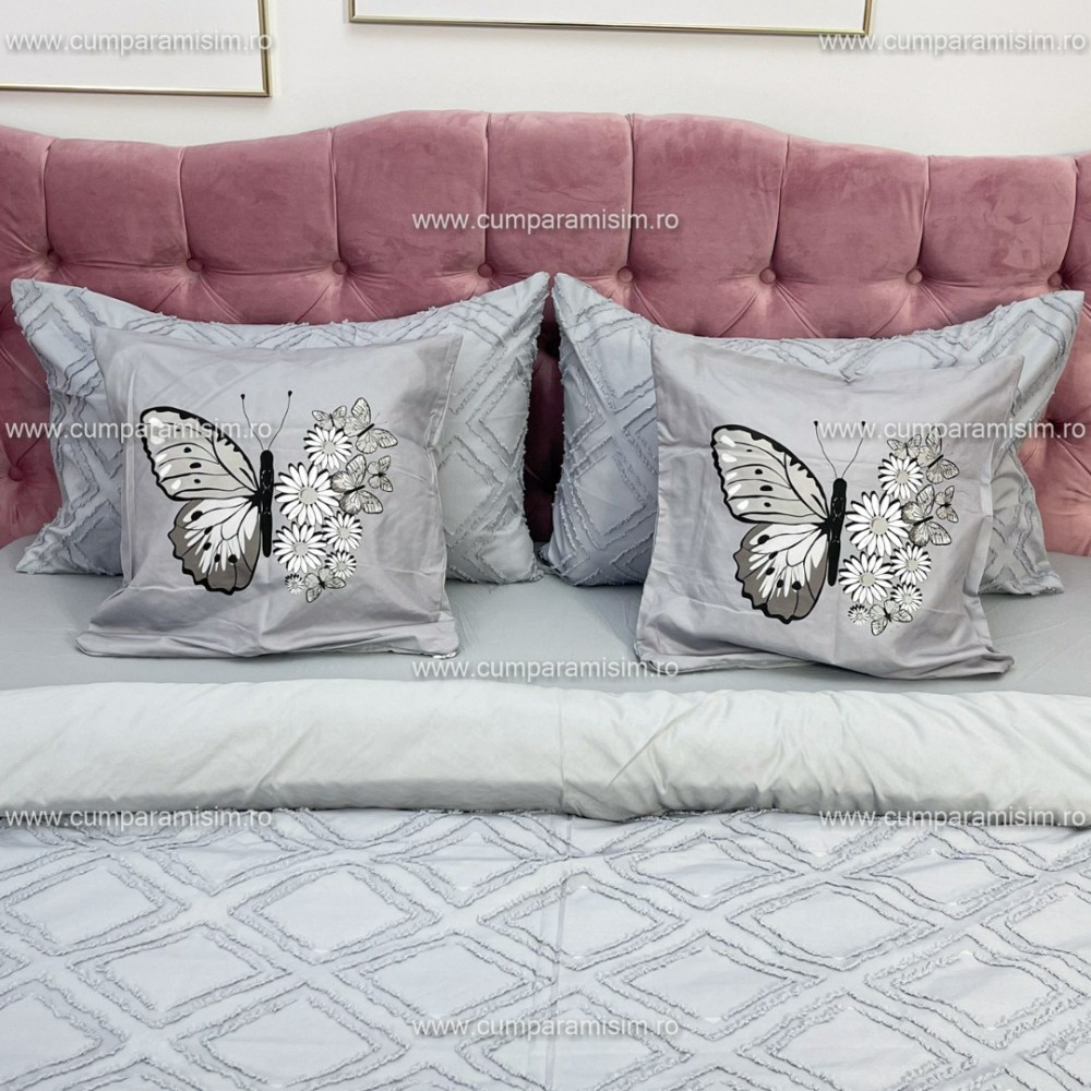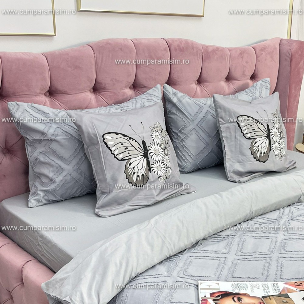 Lenjerie pat dublu, Finet Satinat Deluxe cu Smocuri Brodate, IDENTICA CU POZA, cu elastic, 4 anotimpuri, 6 piese, romburi, gri deschis, Primavara Casa, cod produs: PRC457