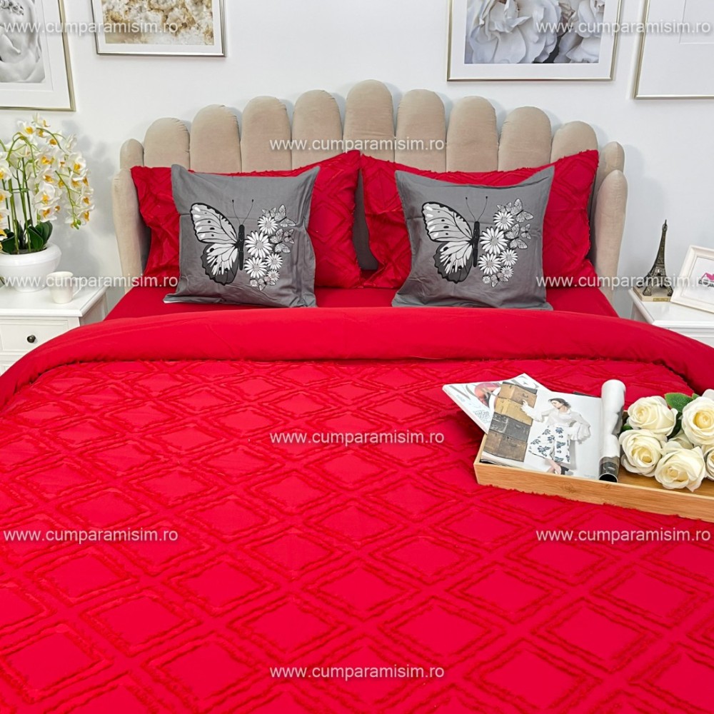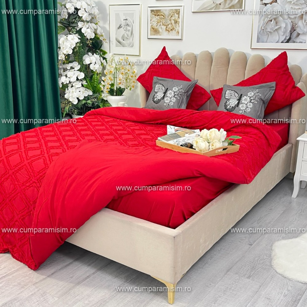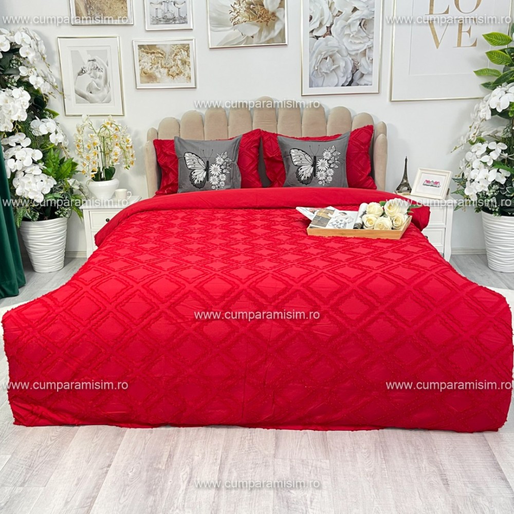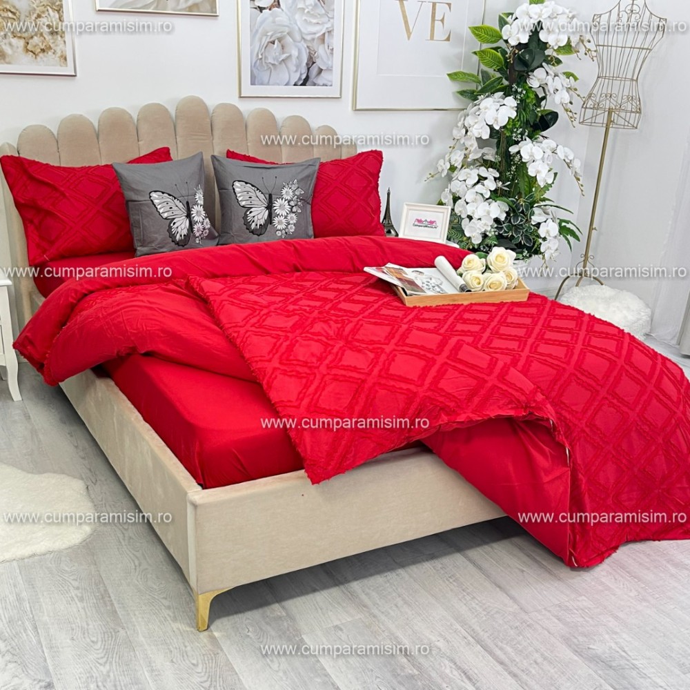 Lenjerie pat dublu, Finet Satinat Deluxe cu Smocuri Brodate, IDENTICA CU POZA, cu elastic, 4 anotimpuri, 6 piese, romburi, rosu, Primavara Casa, cod produs: PRC456