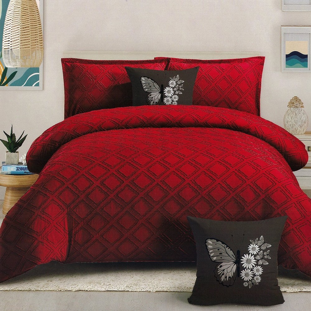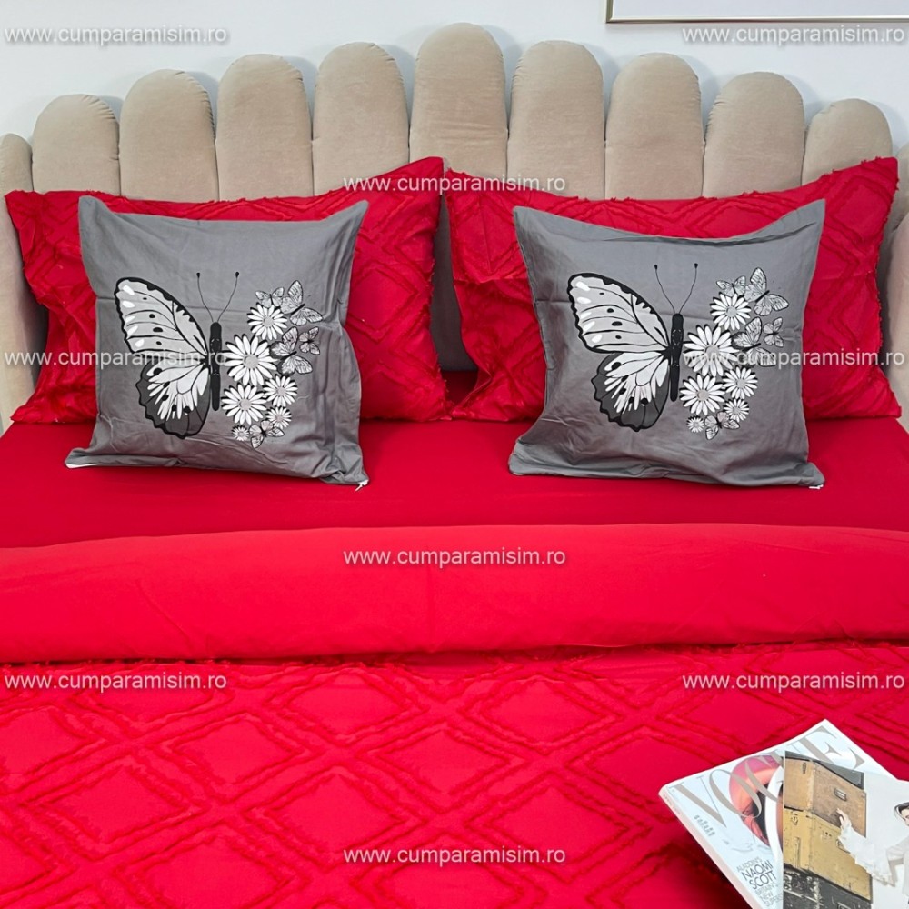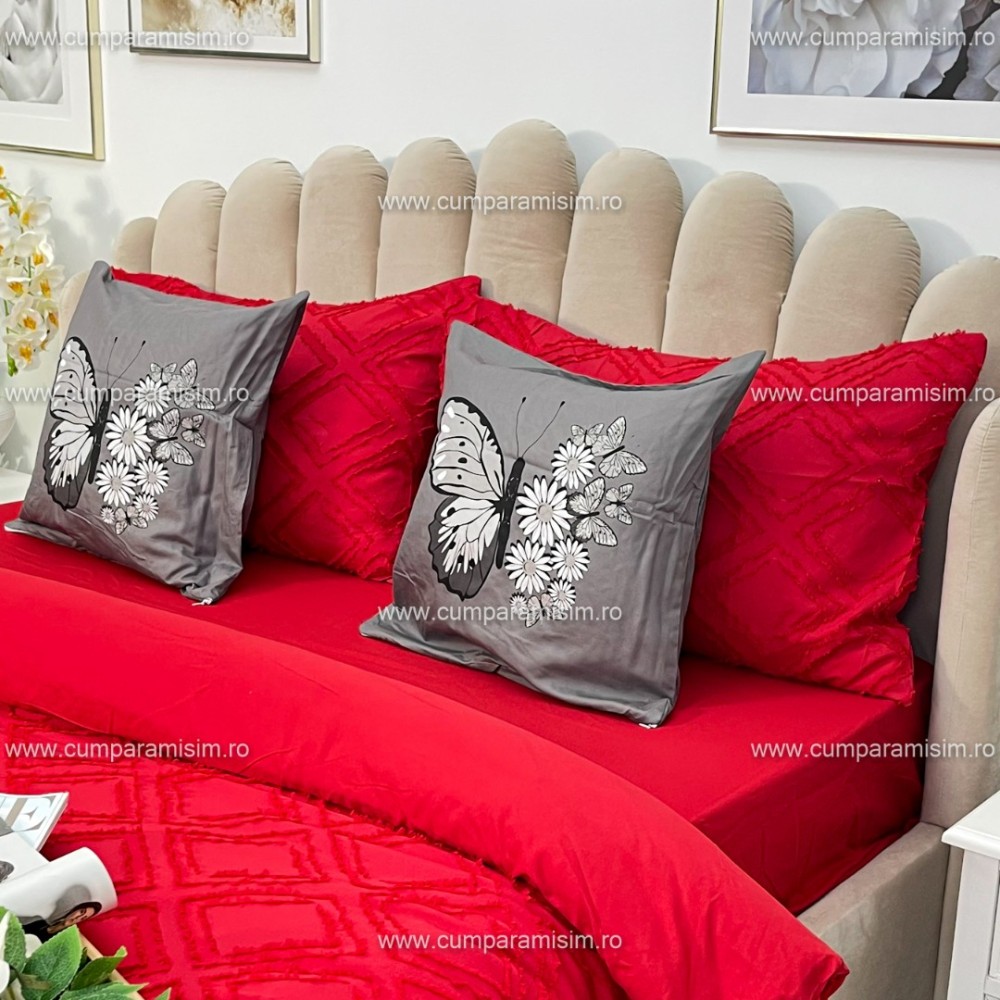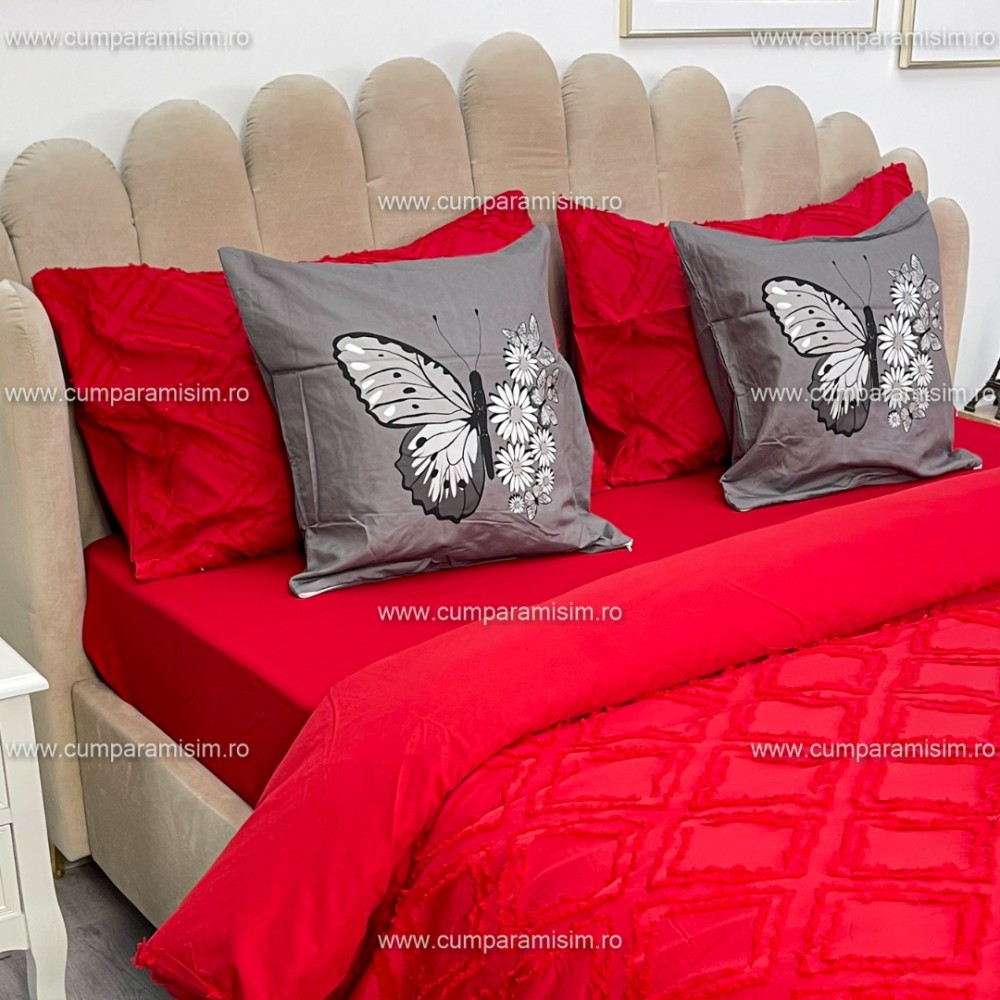 Lenjerie pat dublu, Finet Satinat Deluxe cu Smocuri Brodate, IDENTICA CU POZA, cu elastic, 4 anotimpuri, 6 piese, romburi, rosu, Primavara Casa, cod produs: PRC456