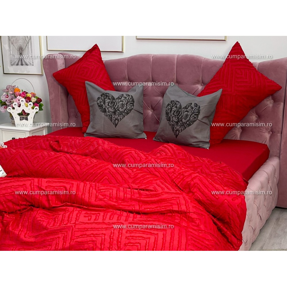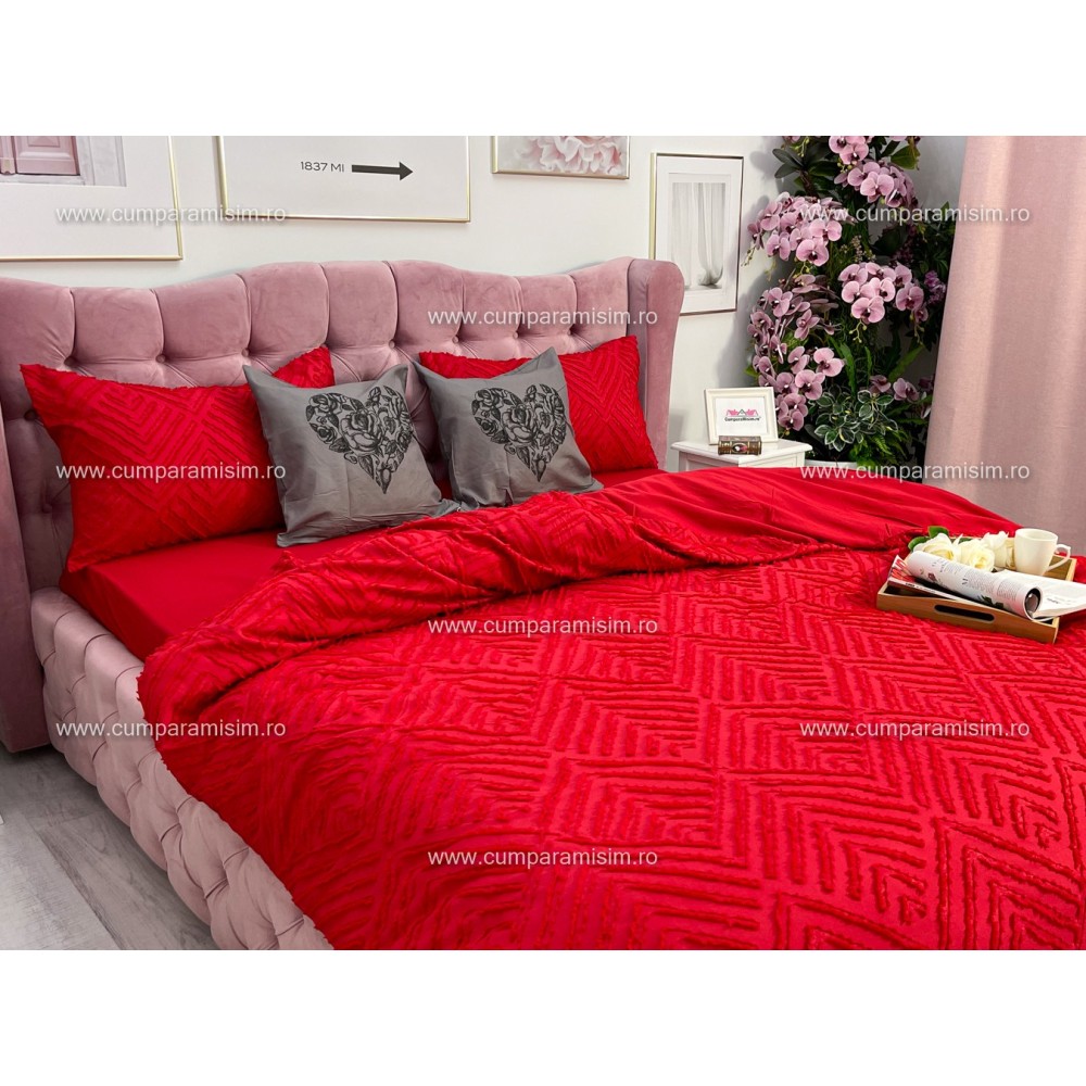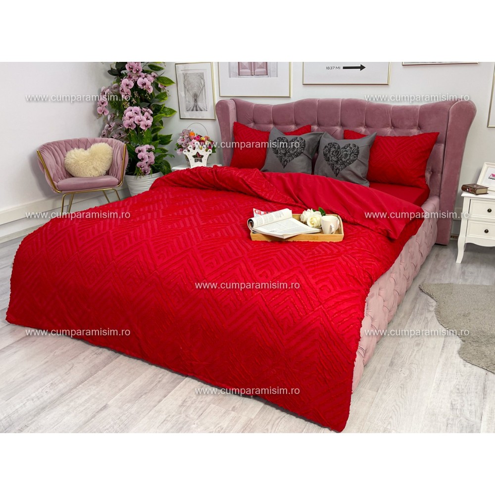 Lenjerie pat dublu, Finet Satinat Deluxe cu Smocuri Brodate, IDENTICA CU POZA, cu elastic, 4 anotimpuri, 6 piese, rosu, Primavara Casa, cod produs: PRC111