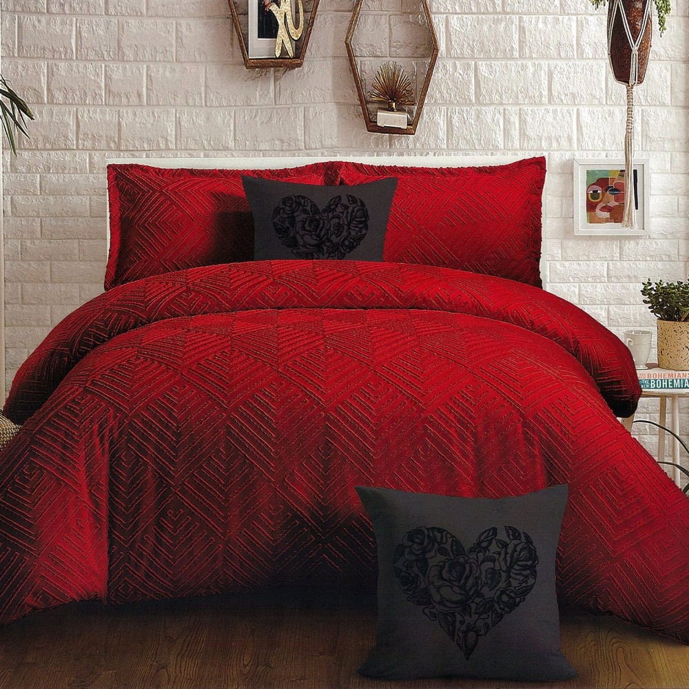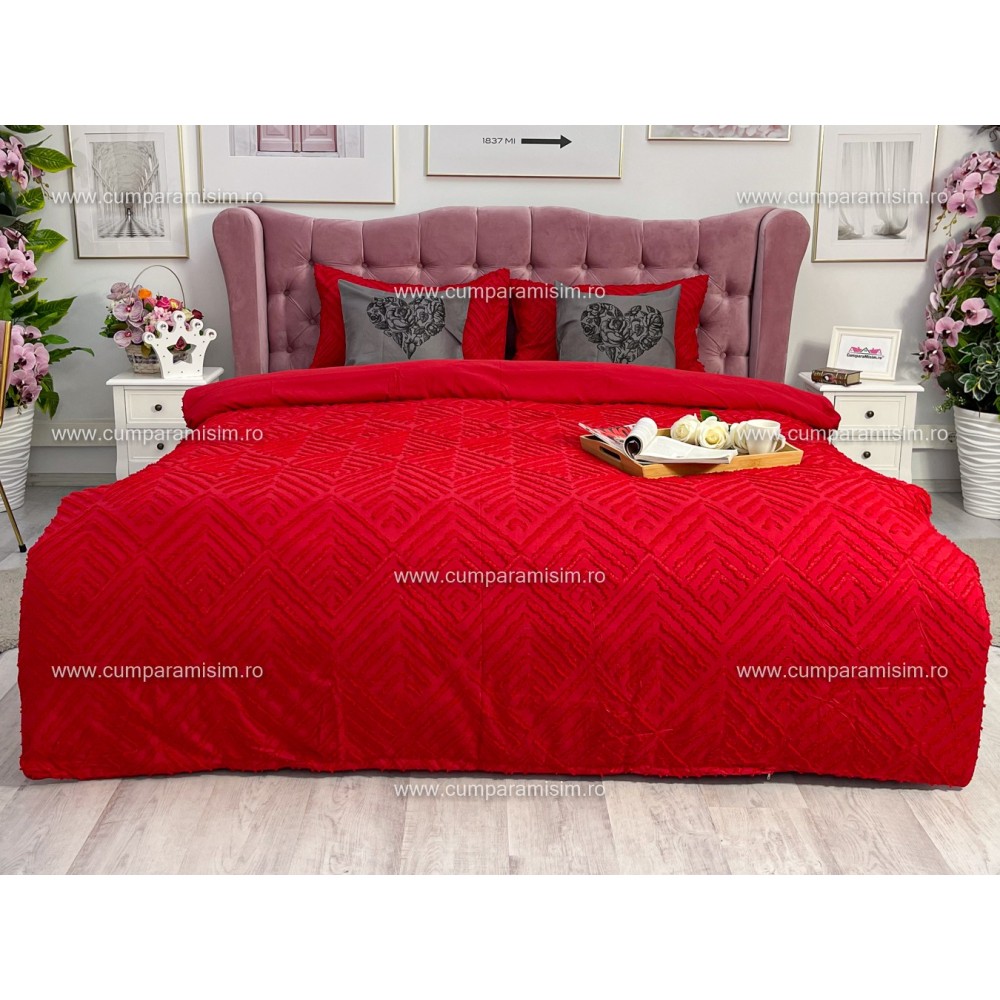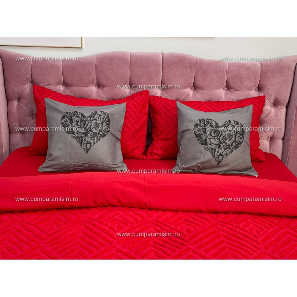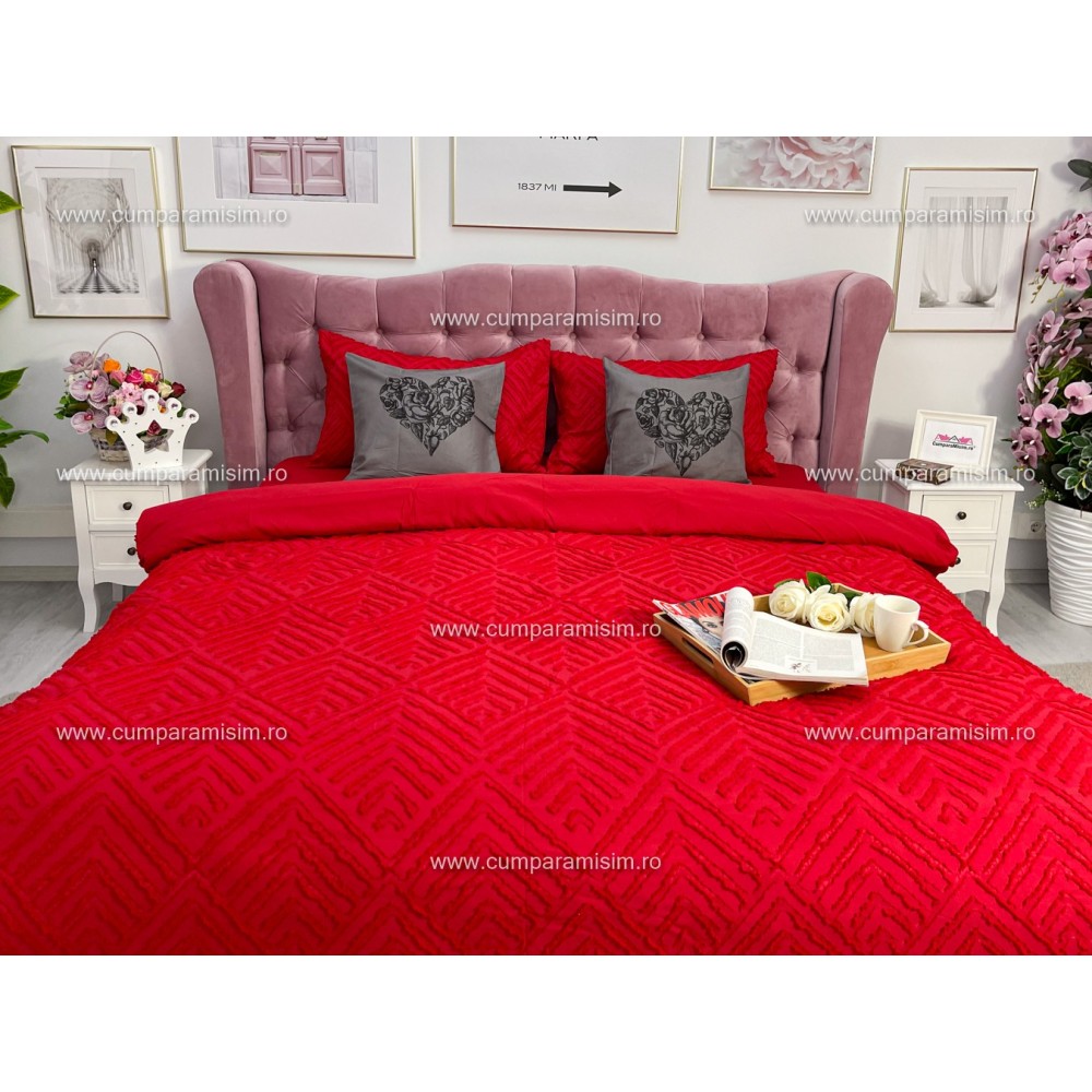 Lenjerie pat dublu, Finet Satinat Deluxe cu Smocuri Brodate, IDENTICA CU POZA, cu elastic, 4 anotimpuri, 6 piese, rosu, Primavara Casa, cod produs: PRC111