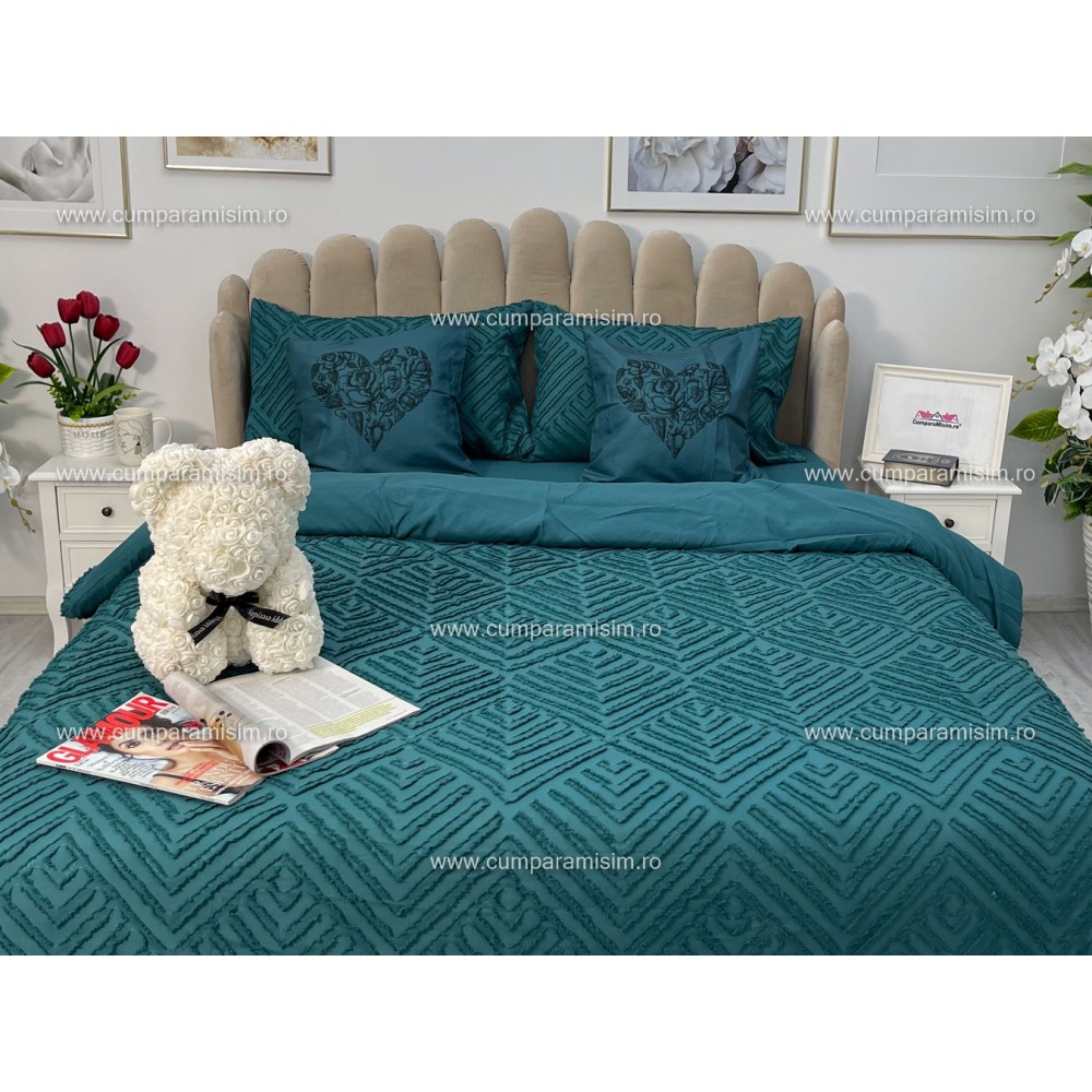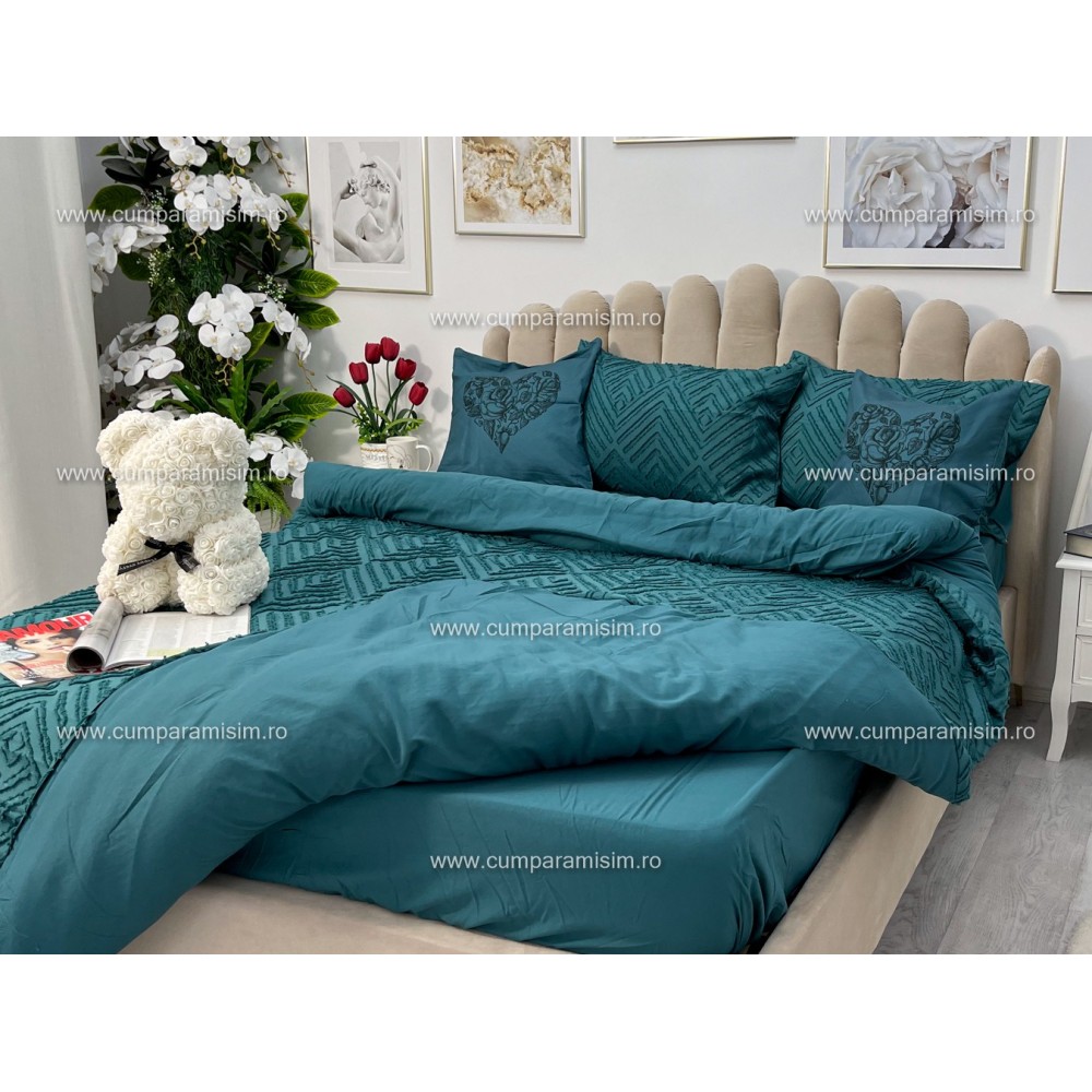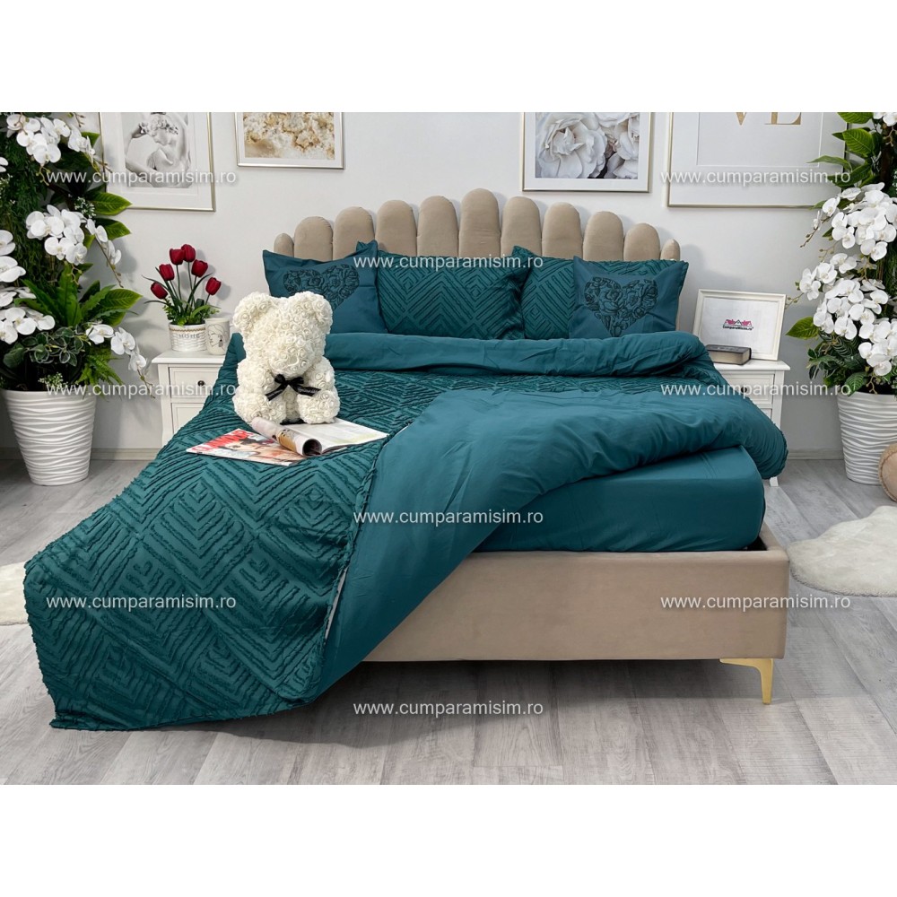 Lenjerie pat dublu, Finet Satinat Deluxe cu Smocuri Brodate, IDENTICA CU POZA, cu elastic, 4 anotimpuri, 6 piese, verde smarald, Primavara Casa, cod produs: PRC107