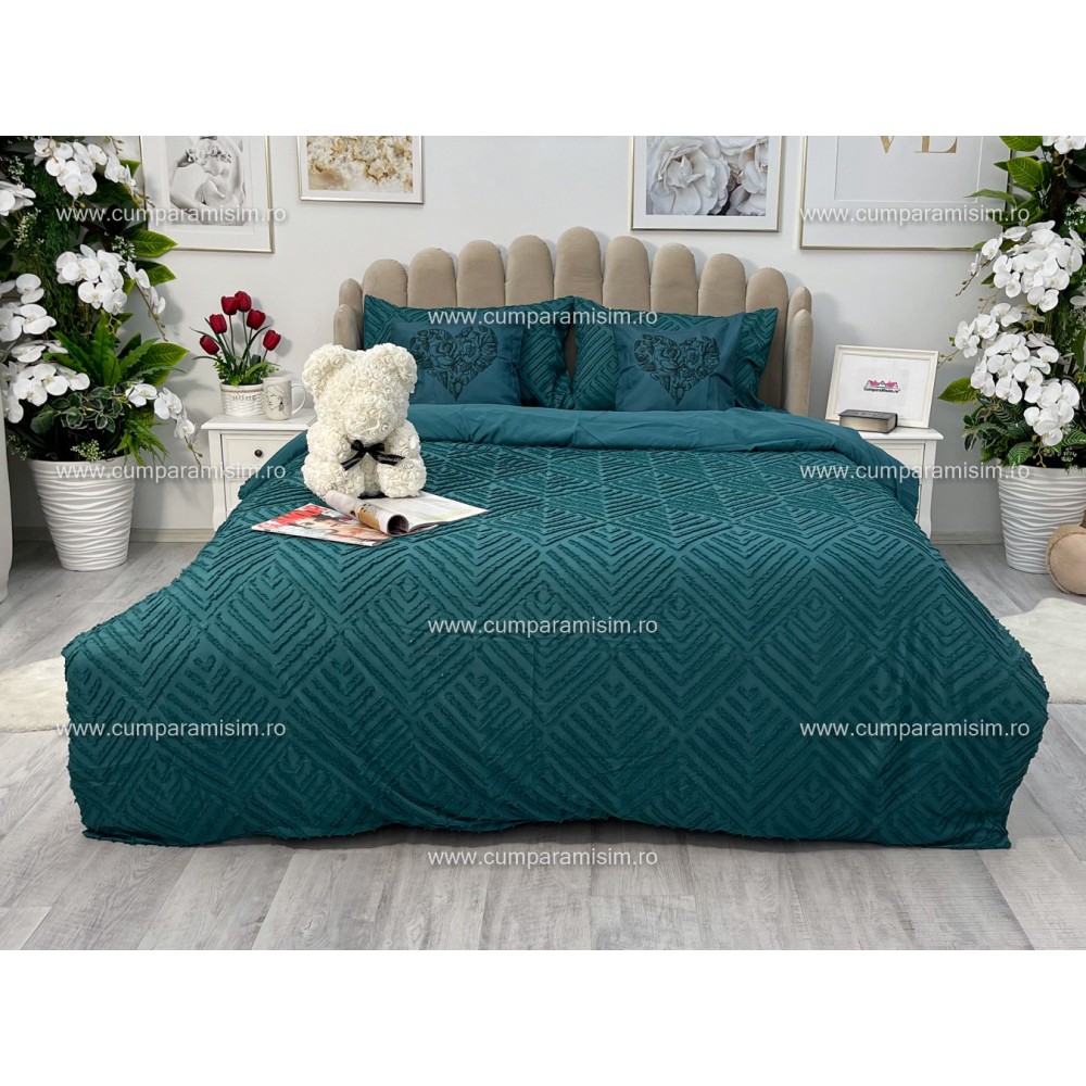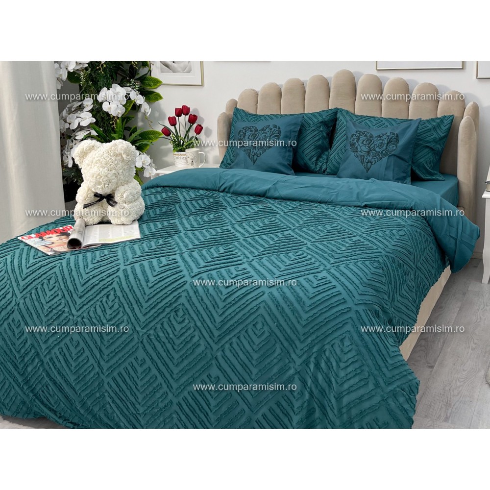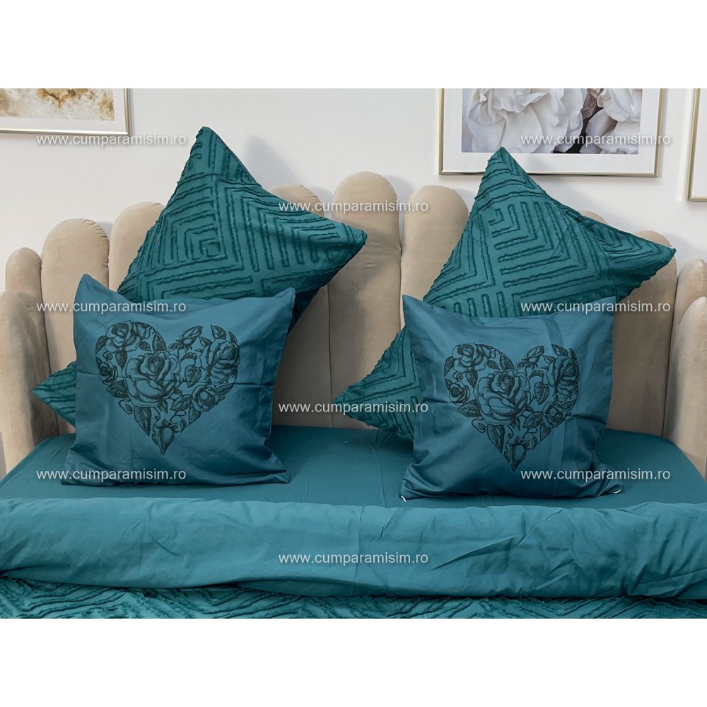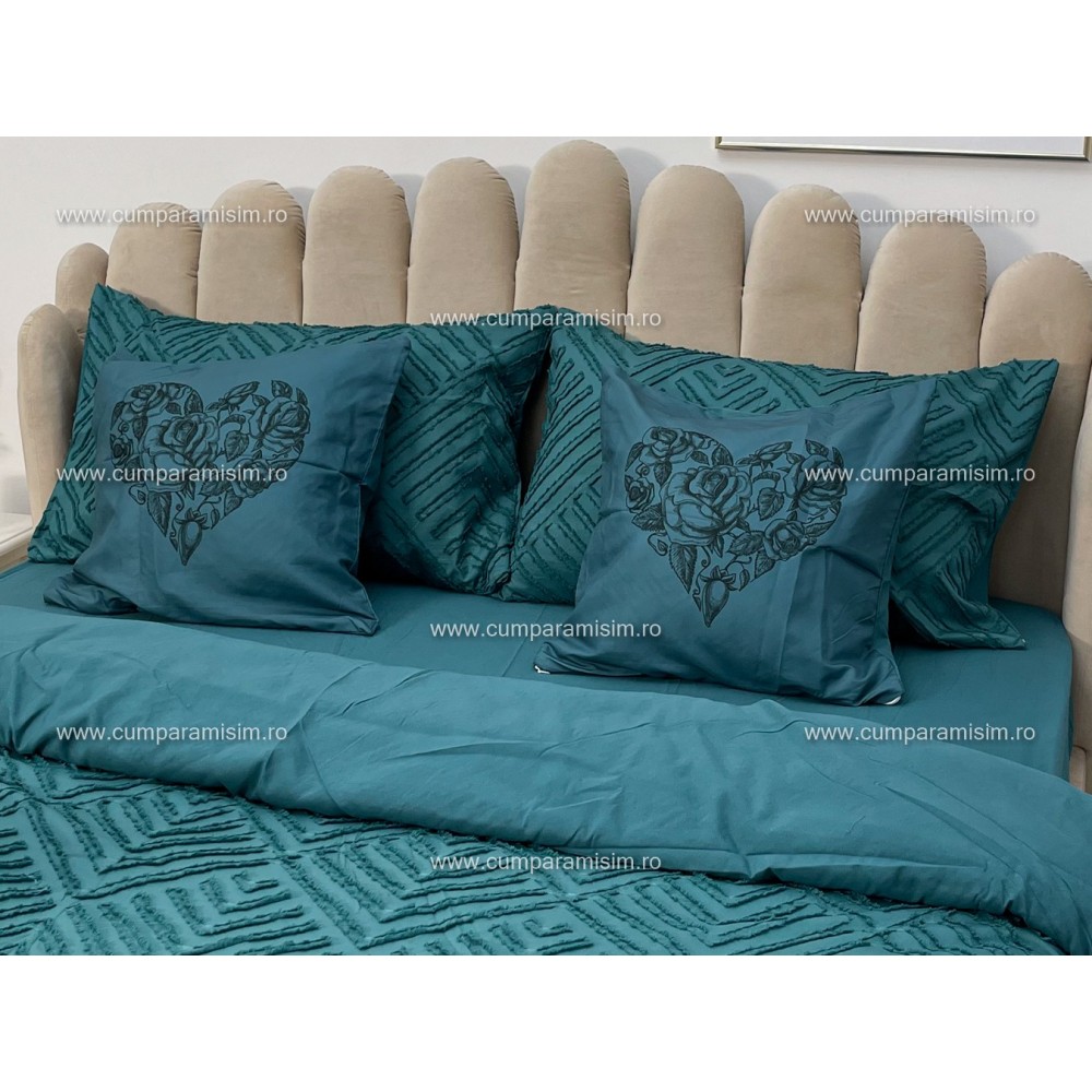 Lenjerie pat dublu, Finet Satinat Deluxe cu Smocuri Brodate, IDENTICA CU POZA, cu elastic, 4 anotimpuri, 6 piese, verde smarald, Primavara Casa, cod produs: PRC107