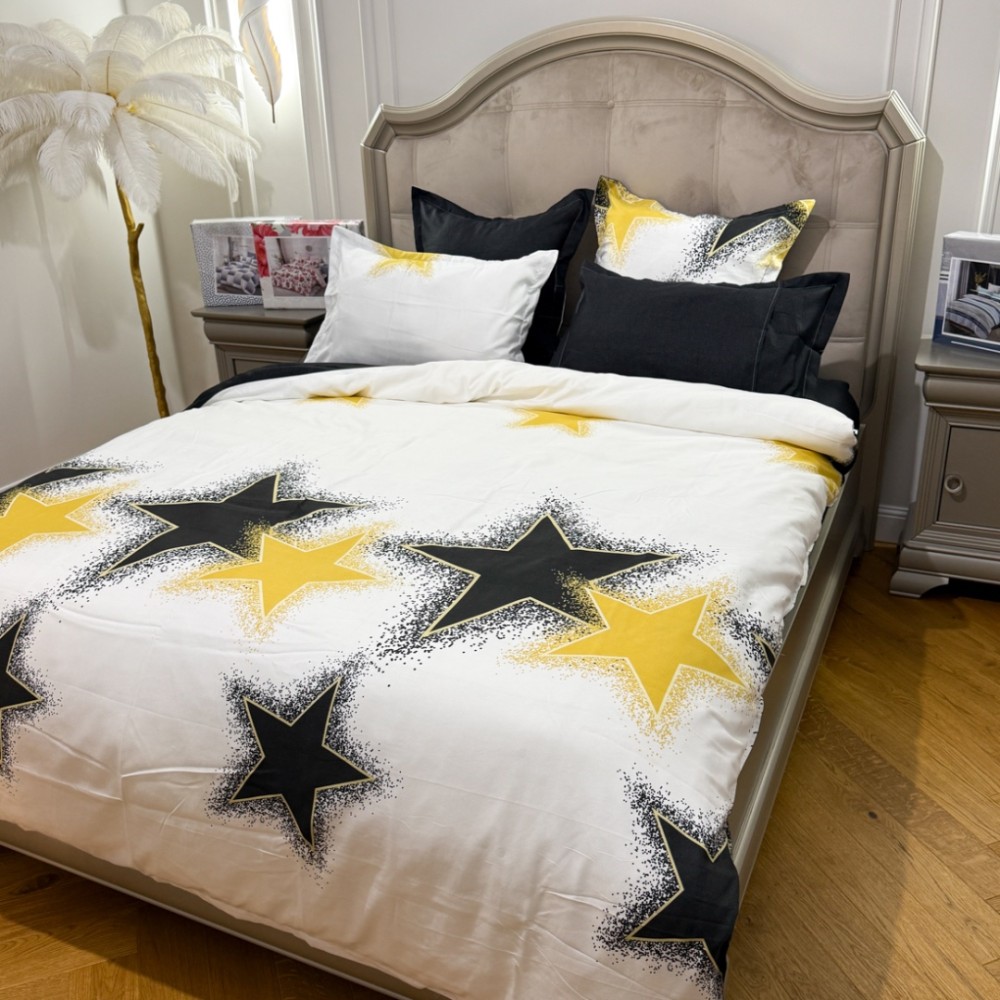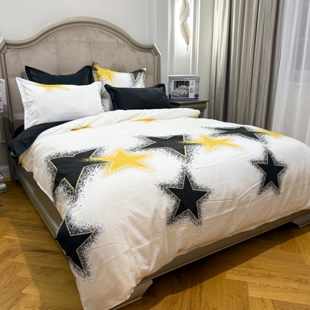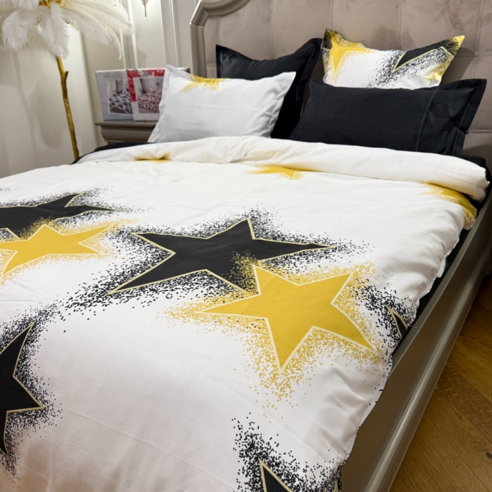 Lenjerie Pat Dublu, FINET, 6 piese, Alb, Galben, Negru, Stelute, Primavara Casa, cod produs: PRM-FN-A6015