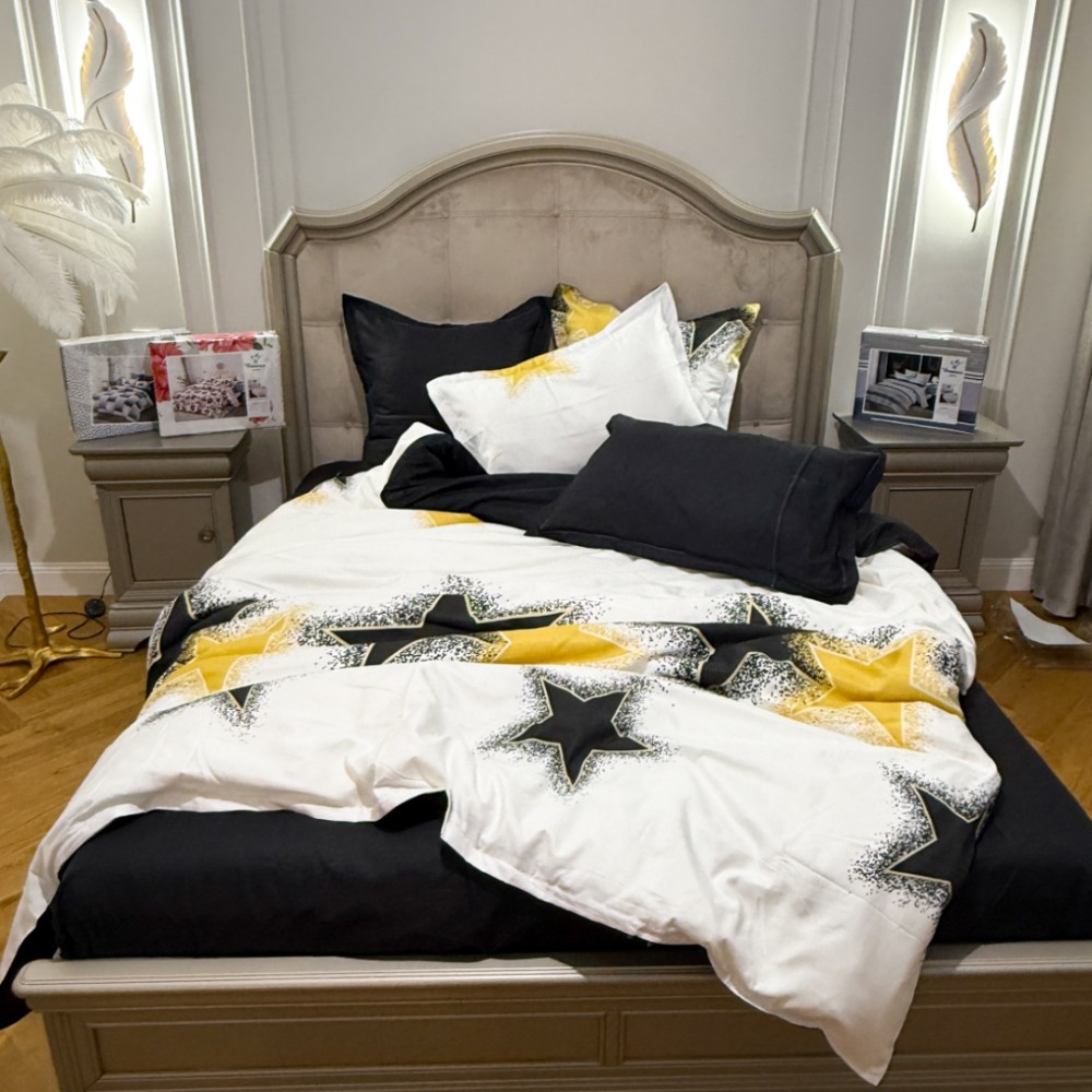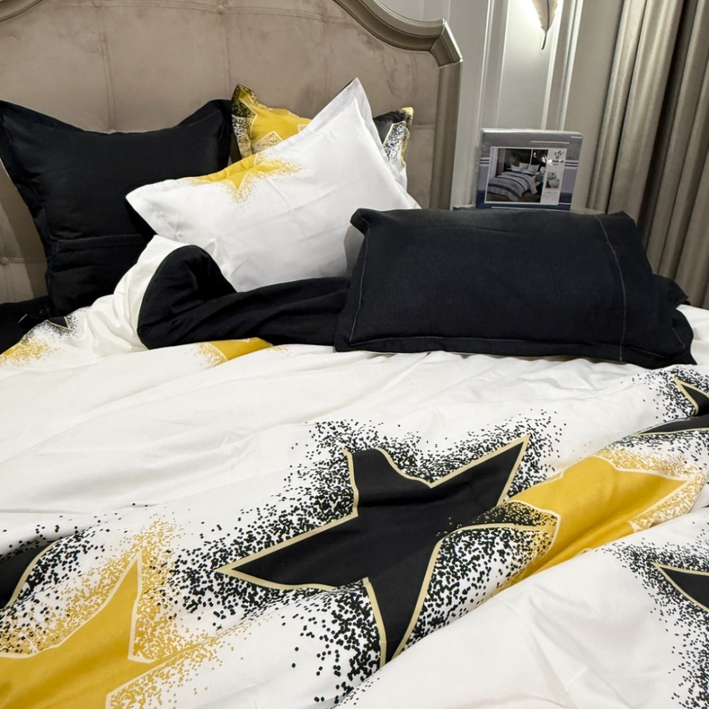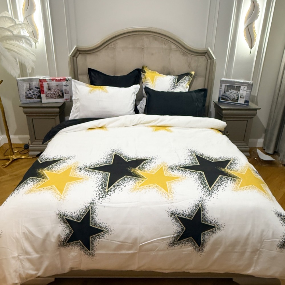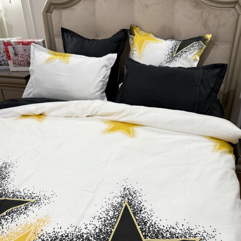 Lenjerie Pat Dublu, FINET, 6 piese, Alb, Galben, Negru, Stelute, Primavara Casa, cod produs: PRM-FN-A6015