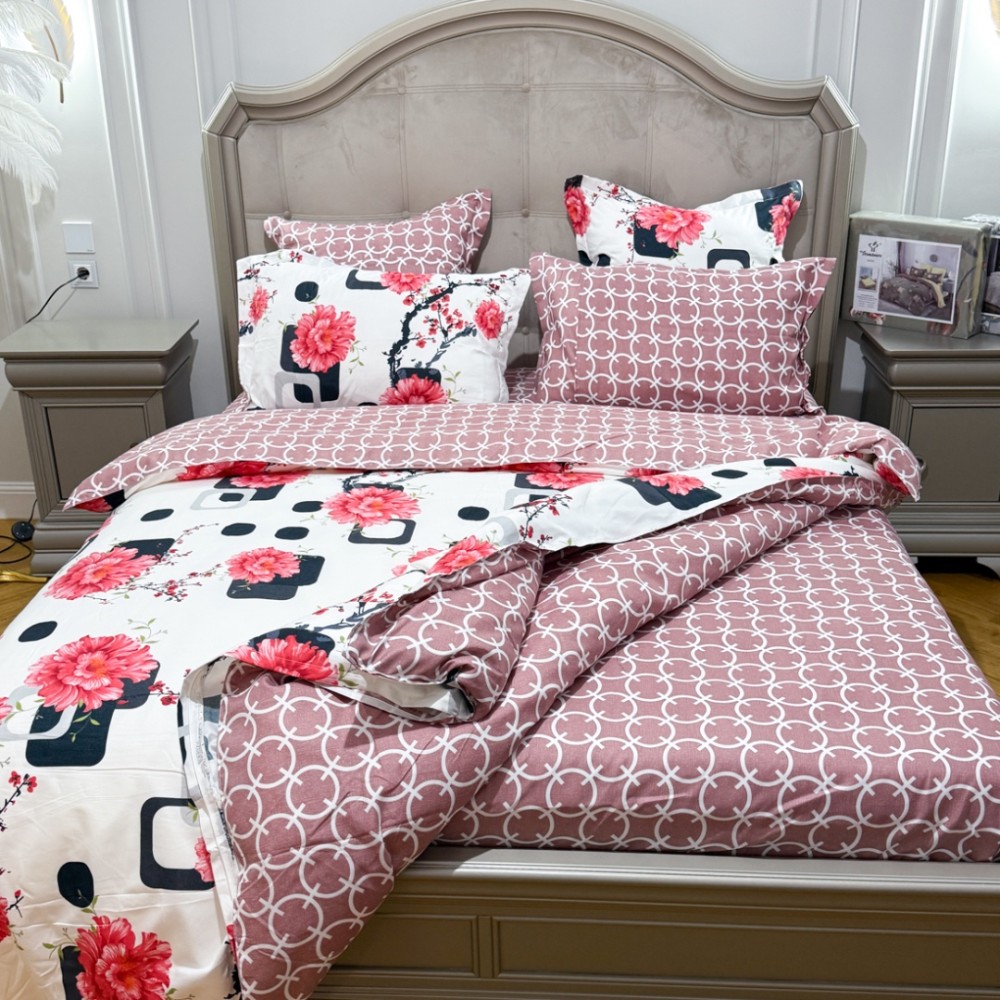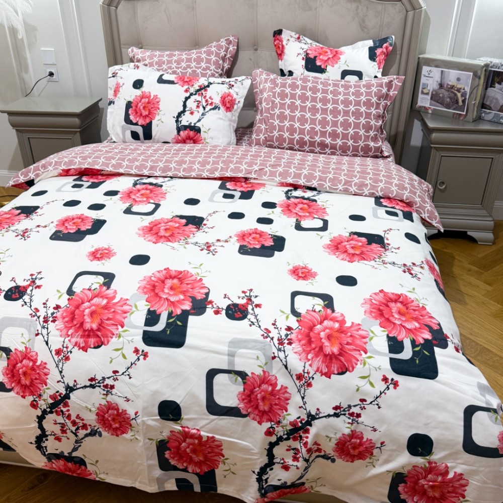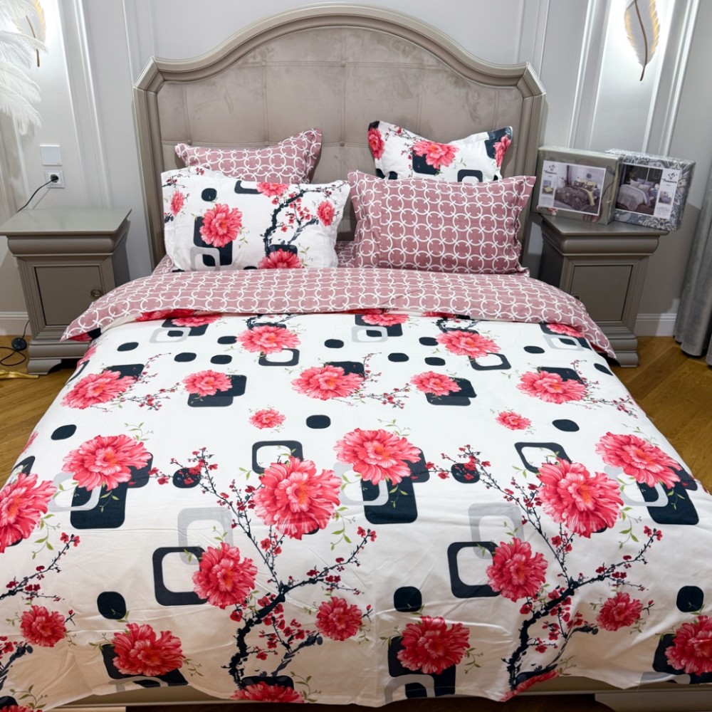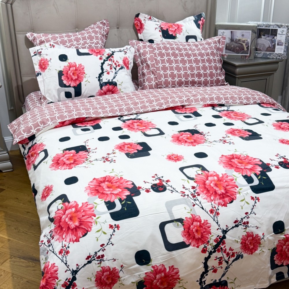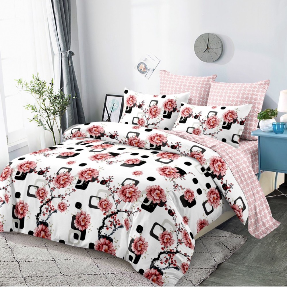 Lenjerie Pat Dublu, FINET, 6 piese, Alb, Roz, Negru, Flori, Patratele, Primavara Casa, cod produs: PRM-FN-A6008