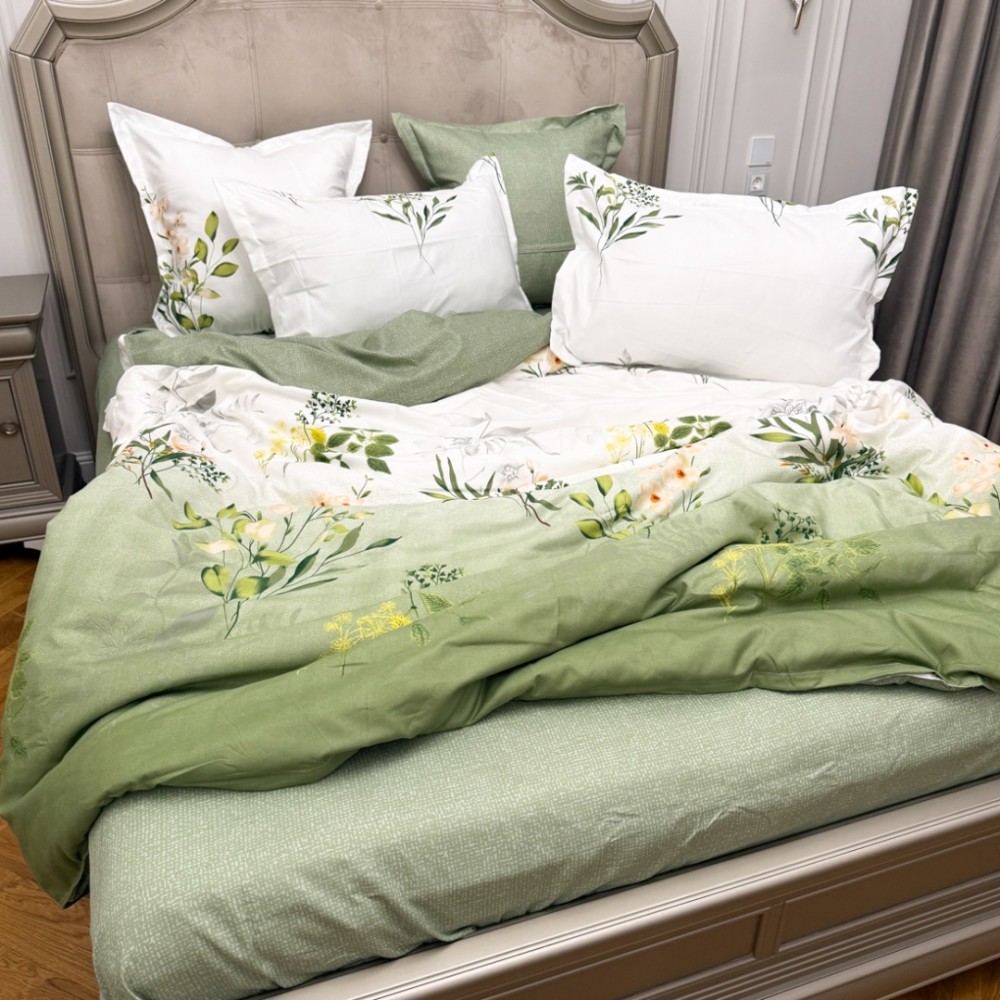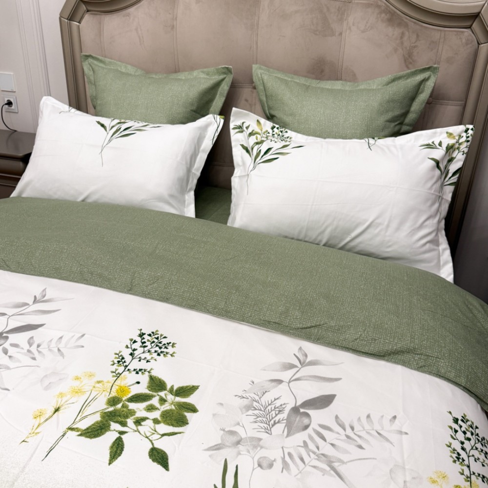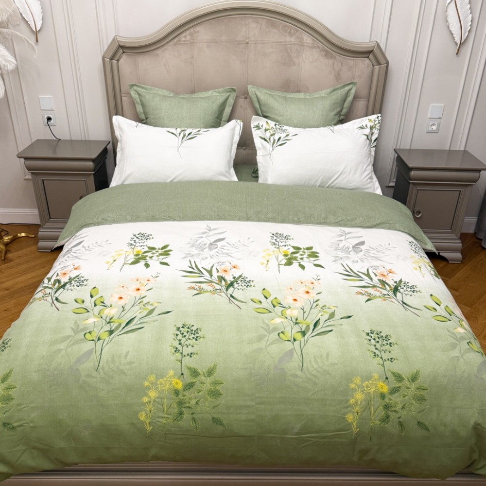 Lenjerie Pat Dublu, FINET, 6 piese, Verde Salvie, Flori, Frunze, Primavara Casa, cod produs: PRM-FN-A6020