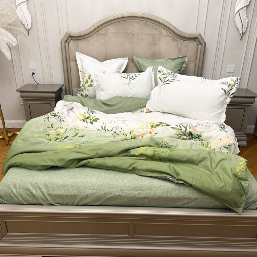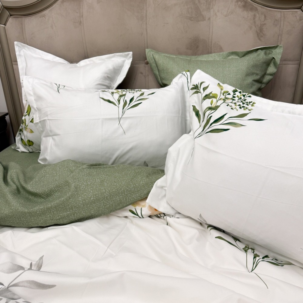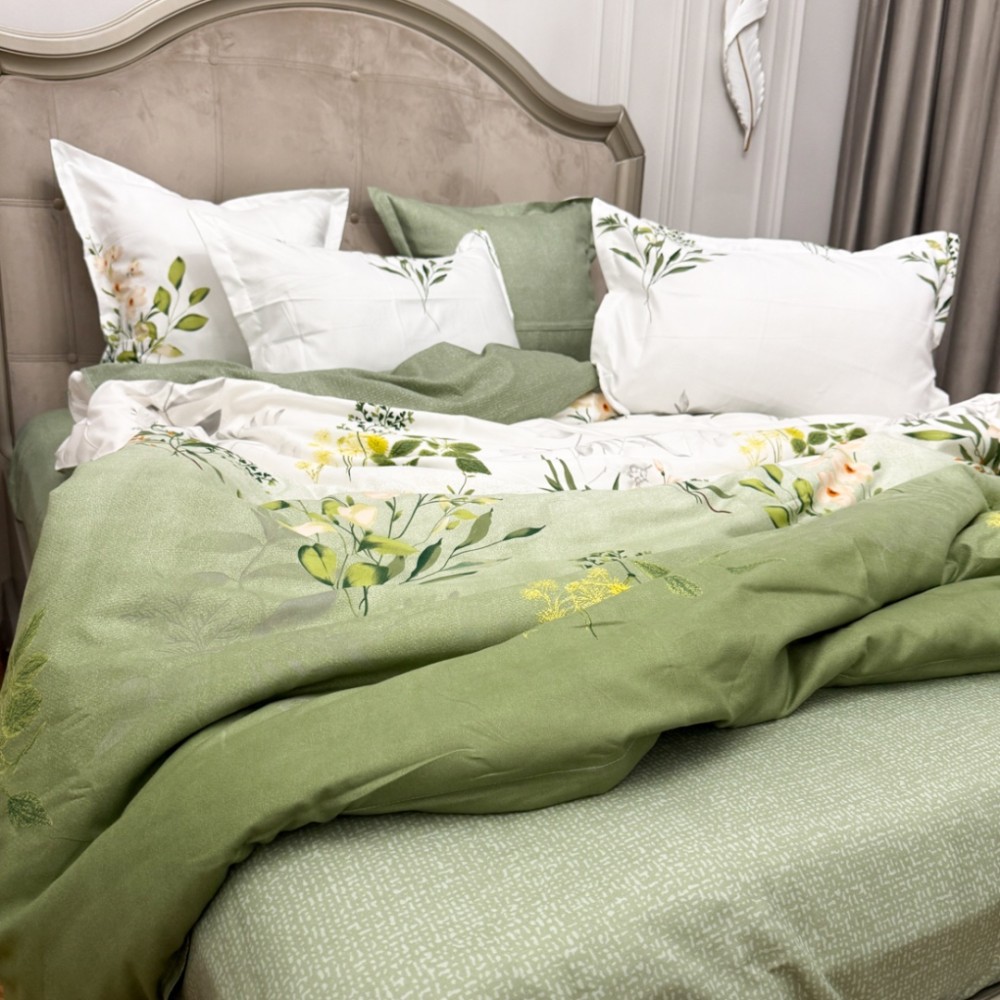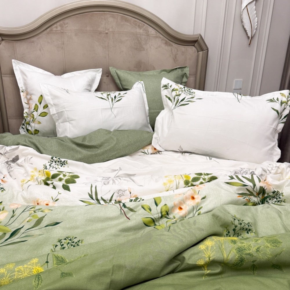 Lenjerie Pat Dublu, FINET, 6 piese, Verde Salvie, Flori, Frunze, Primavara Casa, cod produs: PRM-FN-A6020