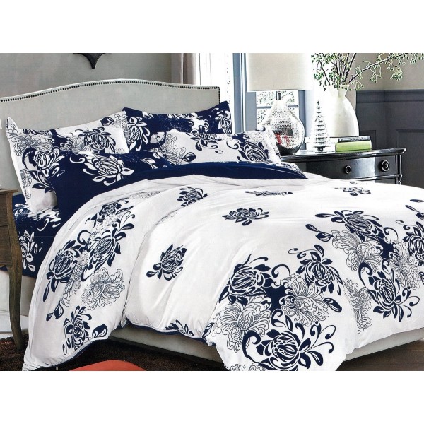 Lenjerie pat dublu, Pucioasa Romania, 4 piese, Bumbac Satinat Superior, Alb-Albastru, floral, Ralex Pucioasa, cod produs: RXE112