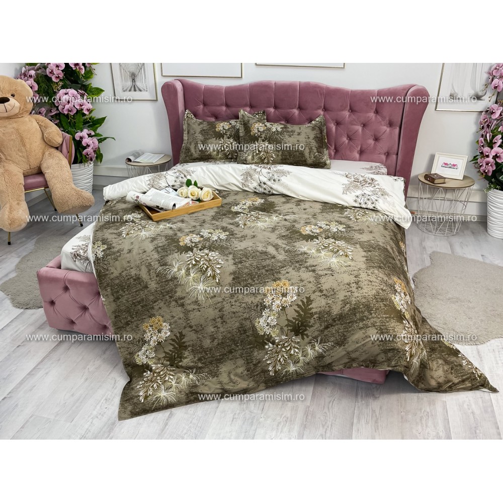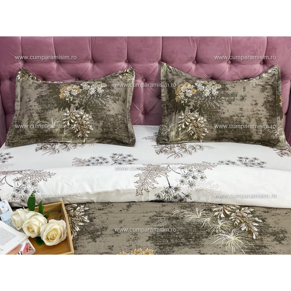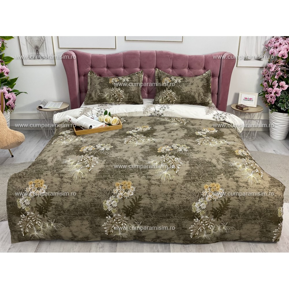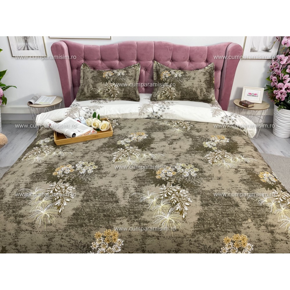 Lenjerie pat dublu, Pucioasa Romania, 4 piese, Bumbac Satinat Superior, Maro, flori, Ralex Pucioasa, cod produs: RXE110