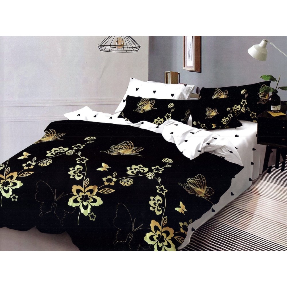 Lenjerie pat dublu, Pucioasa Romania, 4 piese, Bumbac Satinat Superior, Negru-Auriu, flori, fluturi, Ralex Pucioasa, cod produs: RXE113