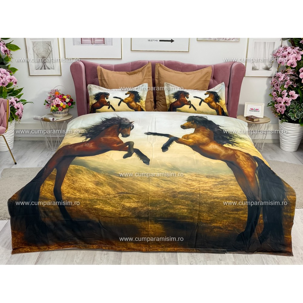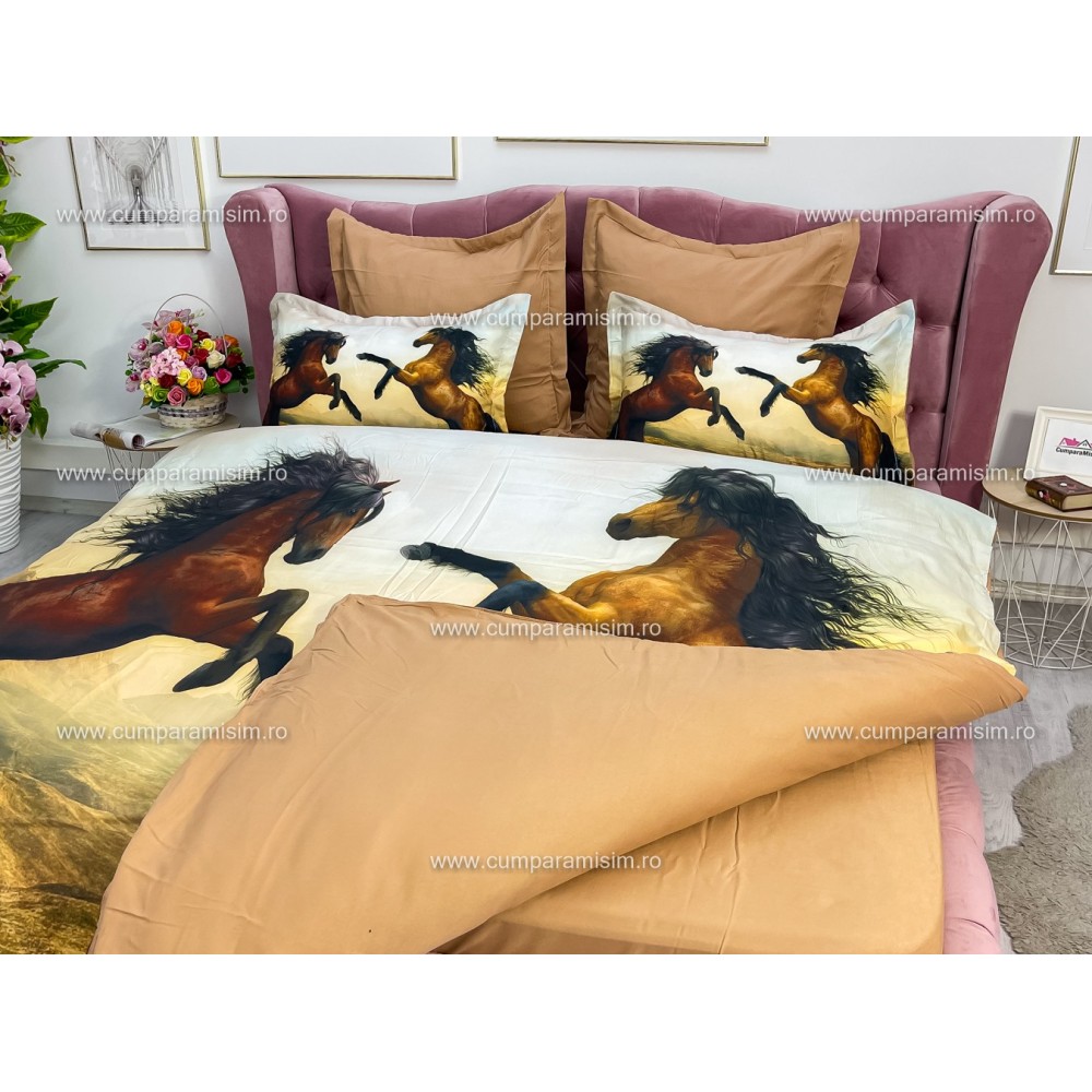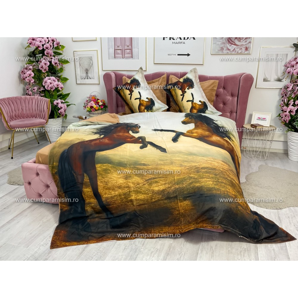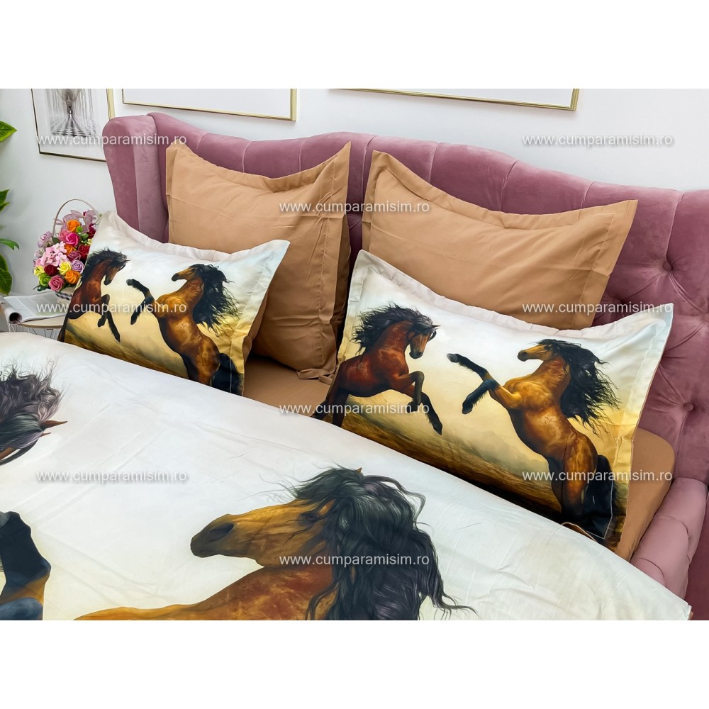 Lenjerie pat dublu, Ralex Pucioasa, 6 piese, Bumbac Finet, imprimeu 3D, IDENTIC CU POZA, Maro, cai, cod produs: RXF358