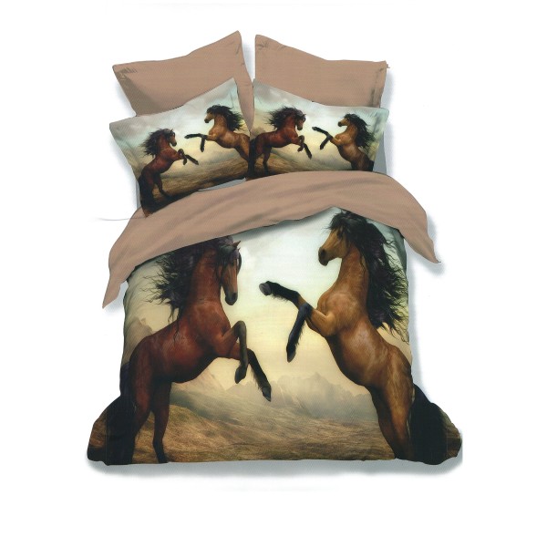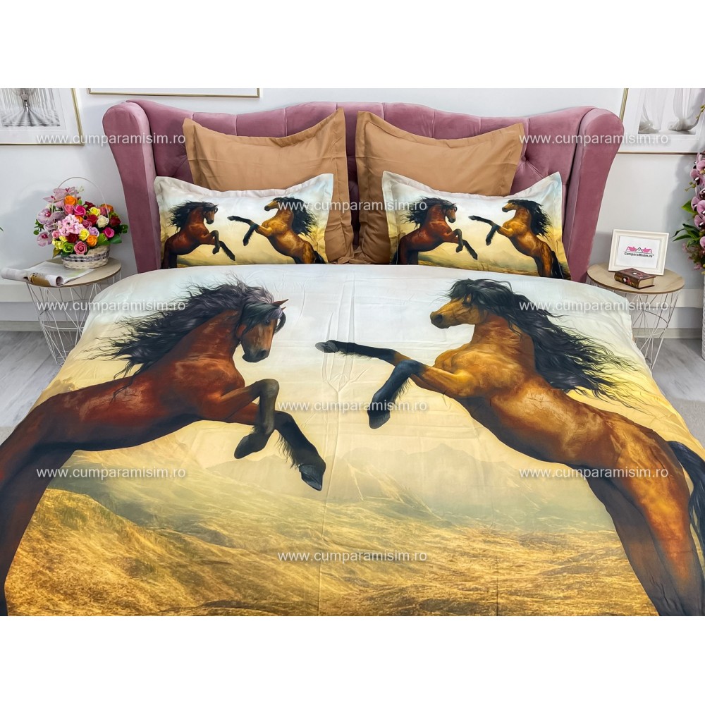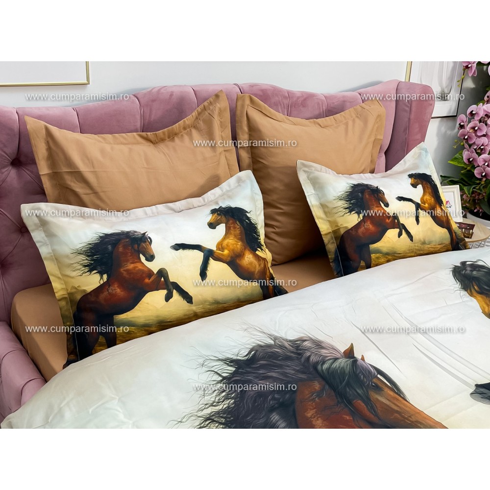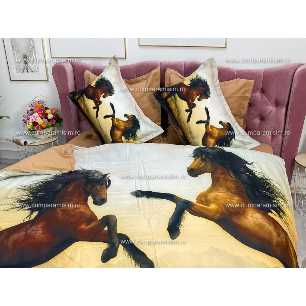 Lenjerie pat dublu, Ralex Pucioasa, 6 piese, Bumbac Finet, imprimeu 3D, IDENTIC CU POZA, Maro, cai, cod produs: RXF358