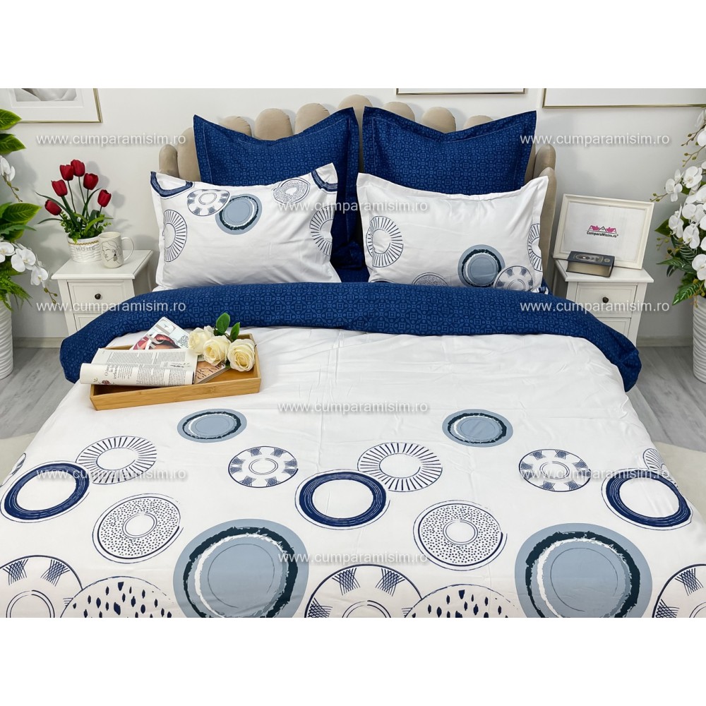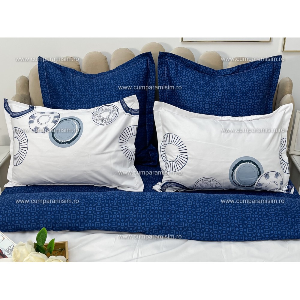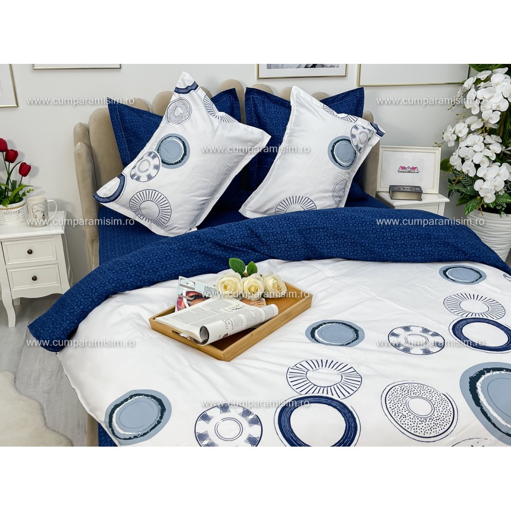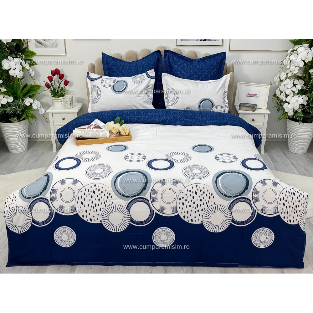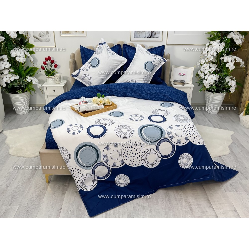 Lenjerie pat dublu, Ralex Pucioasa, Bumbac Finet, 6 piese, Alb-Bleumarin, cercuri, cod produs: RXF233