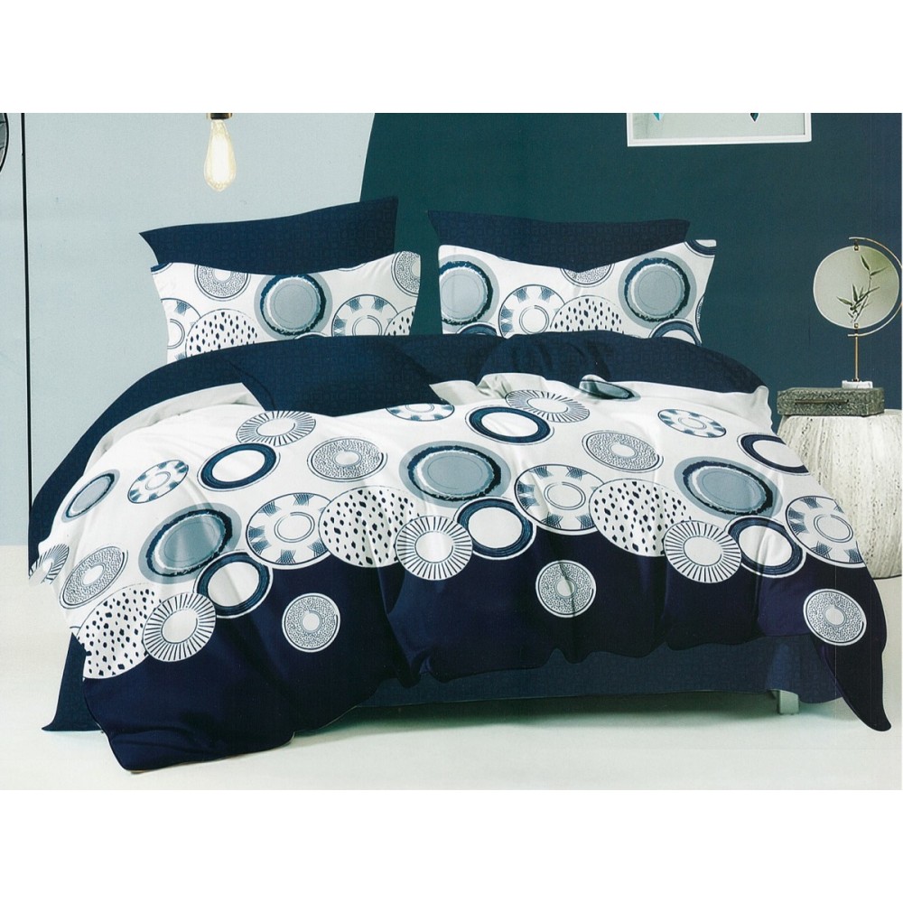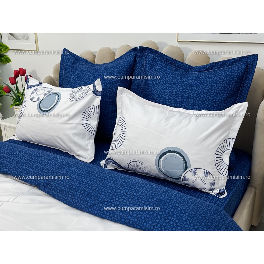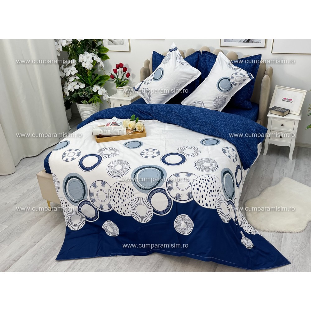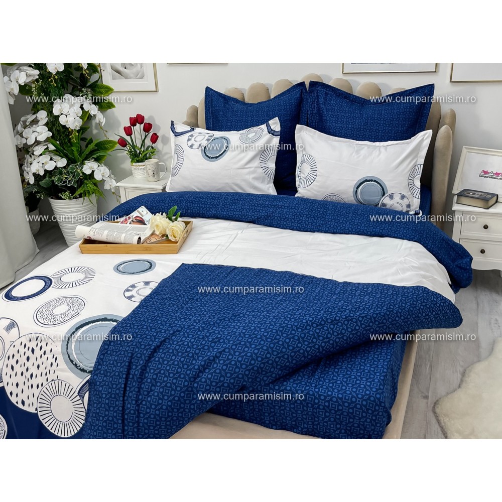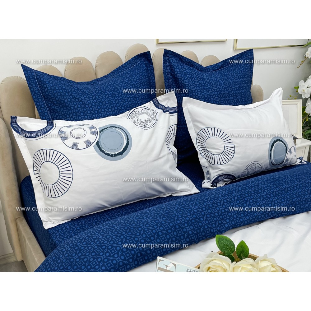Lenjerie pat dublu, Ralex Pucioasa, Bumbac Finet, 6 piese, Alb-Bleumarin, cercuri, cod produs: RXF233