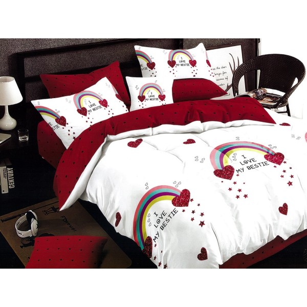 Lenjerie pat dublu, Ralex Pucioasa, Bumbac Finet, 6 piese, Alb-Rosu, curcubeu, inimioare, stelute, cod produs: RXF214