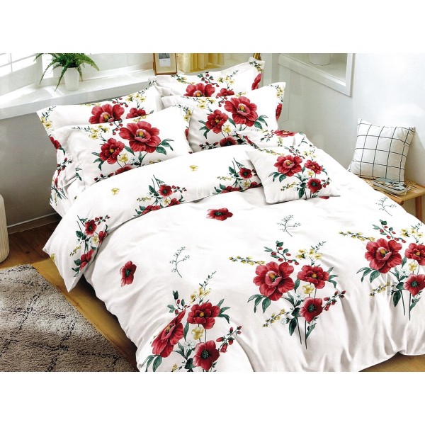 Lenjerie pat dublu, Ralex Pucioasa, Bumbac Finet, 6 piese, Alb-Rosu, flori, cod produs: RXF210
