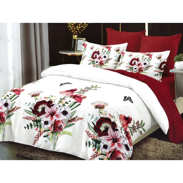 Lenjerie pat dublu, Ralex Pucioasa, Bumbac Finet, 6 piese, Alb-Rosu, flori, fluturi, cod produs: RXF203