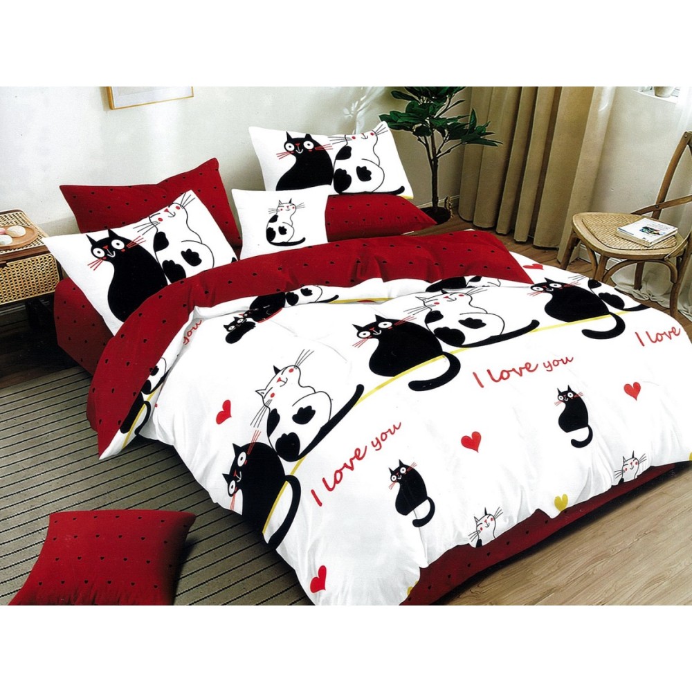 Lenjerie pat dublu, Ralex Pucioasa, Finet, 6 piese, Alb-Rosu, pisici, inimioare, cod produs: RXF196