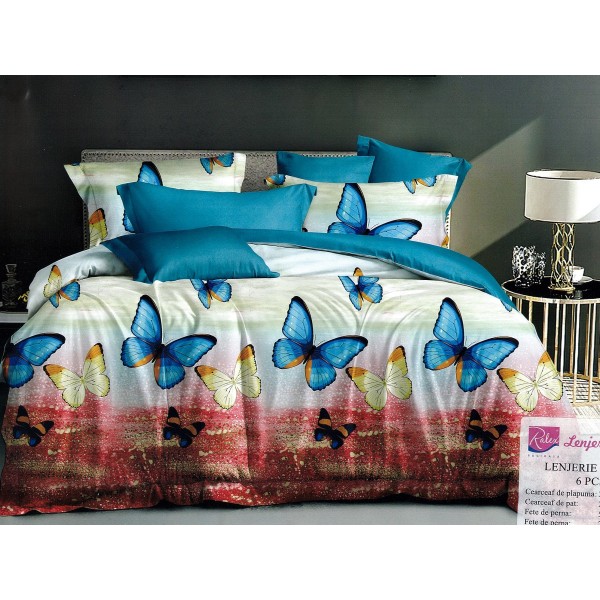 Lenjerie pat dublu, Ralex Pucioasa, Finet, 6 piese, Bleu-Rosu, fluturi, cod produs: RXF211