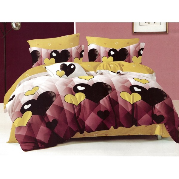 Lenjerie pat dublu, Ralex Pucioasa, Finet, 6 piese, Galben-Visiniu, inimioare, cod produs: RXF232