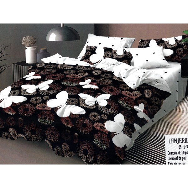Lenjerie pat dublu, Ralex Pucioasa, Finet, 6 piese, Negru-Alb, fluturi, cod produs: RXF200