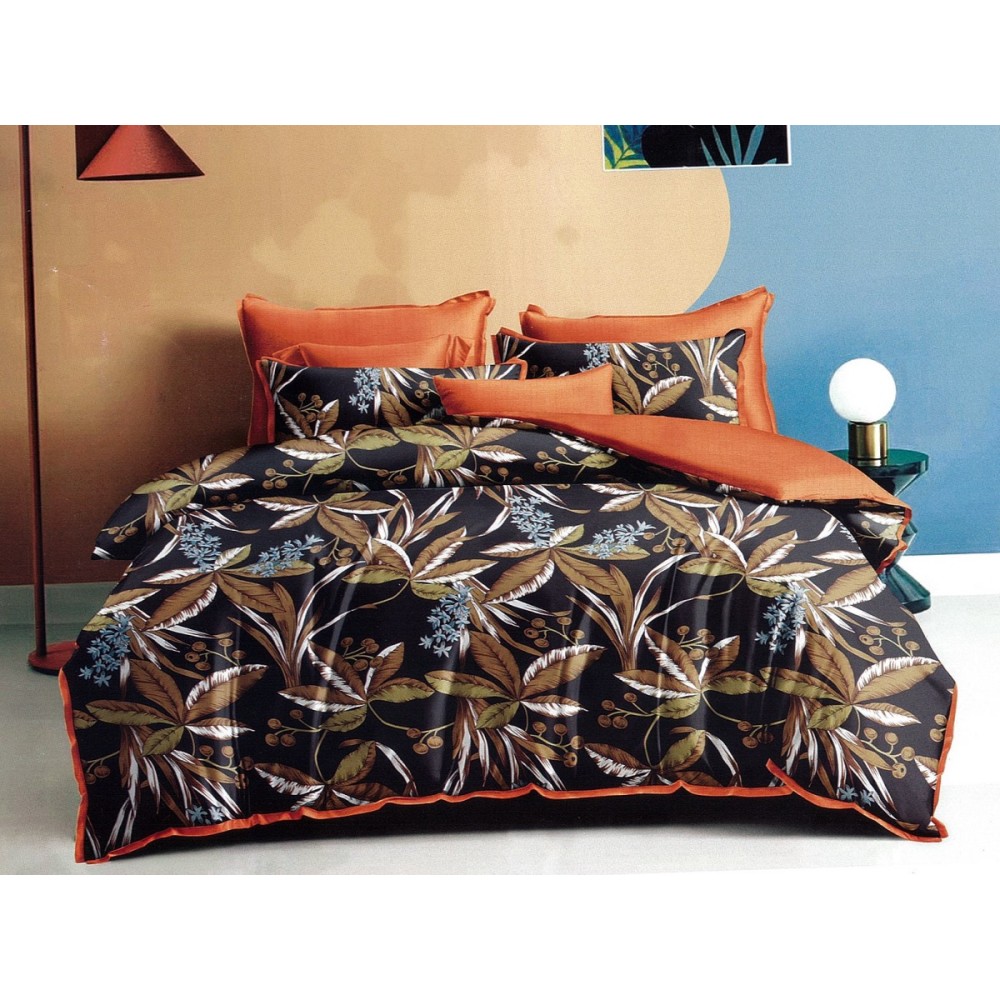 Lenjerie pat dublu, Ralex Pucioasa, Finet, 6 piese, Negru-Caramiziu, frunze, cod produs: RXF195