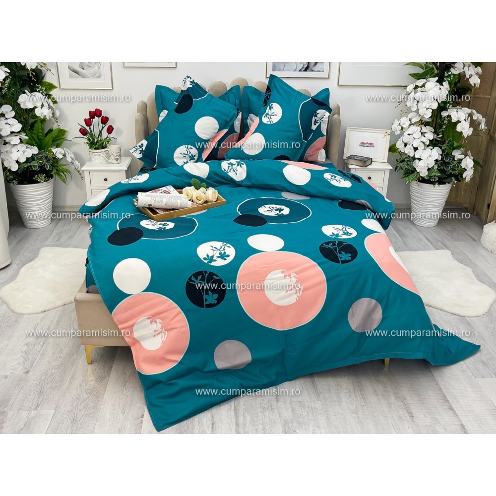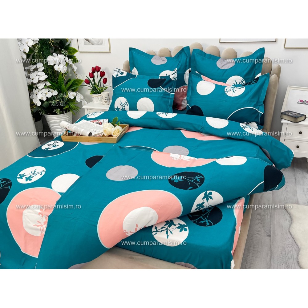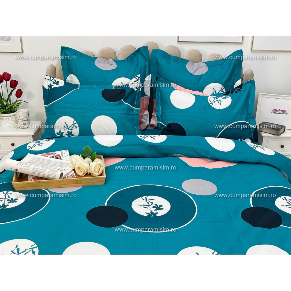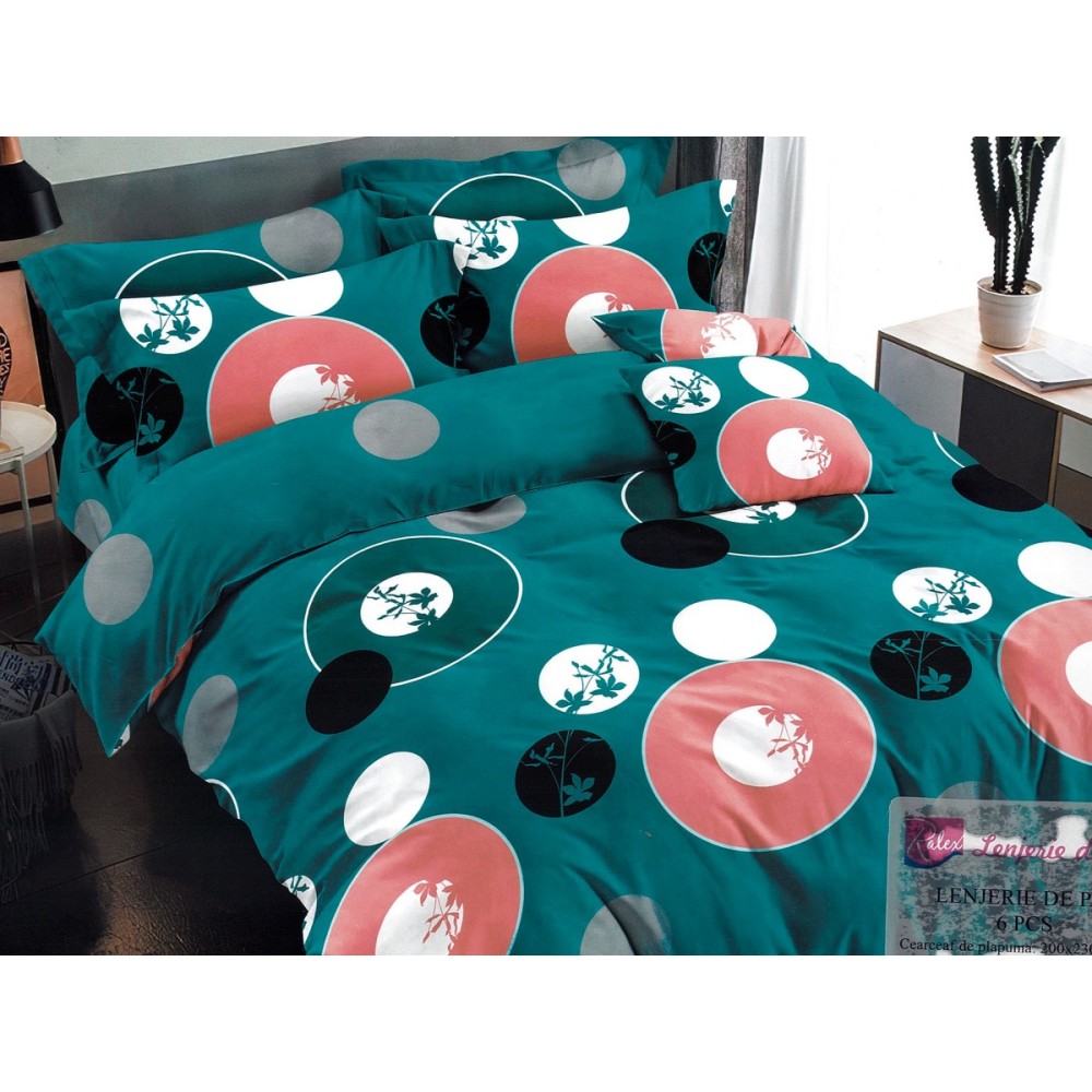 Lenjerie pat dublu, Ralex Pucioasa, Finet, 6 piese, Verde, cercuri, buline, frunze, cod produs: RXF216