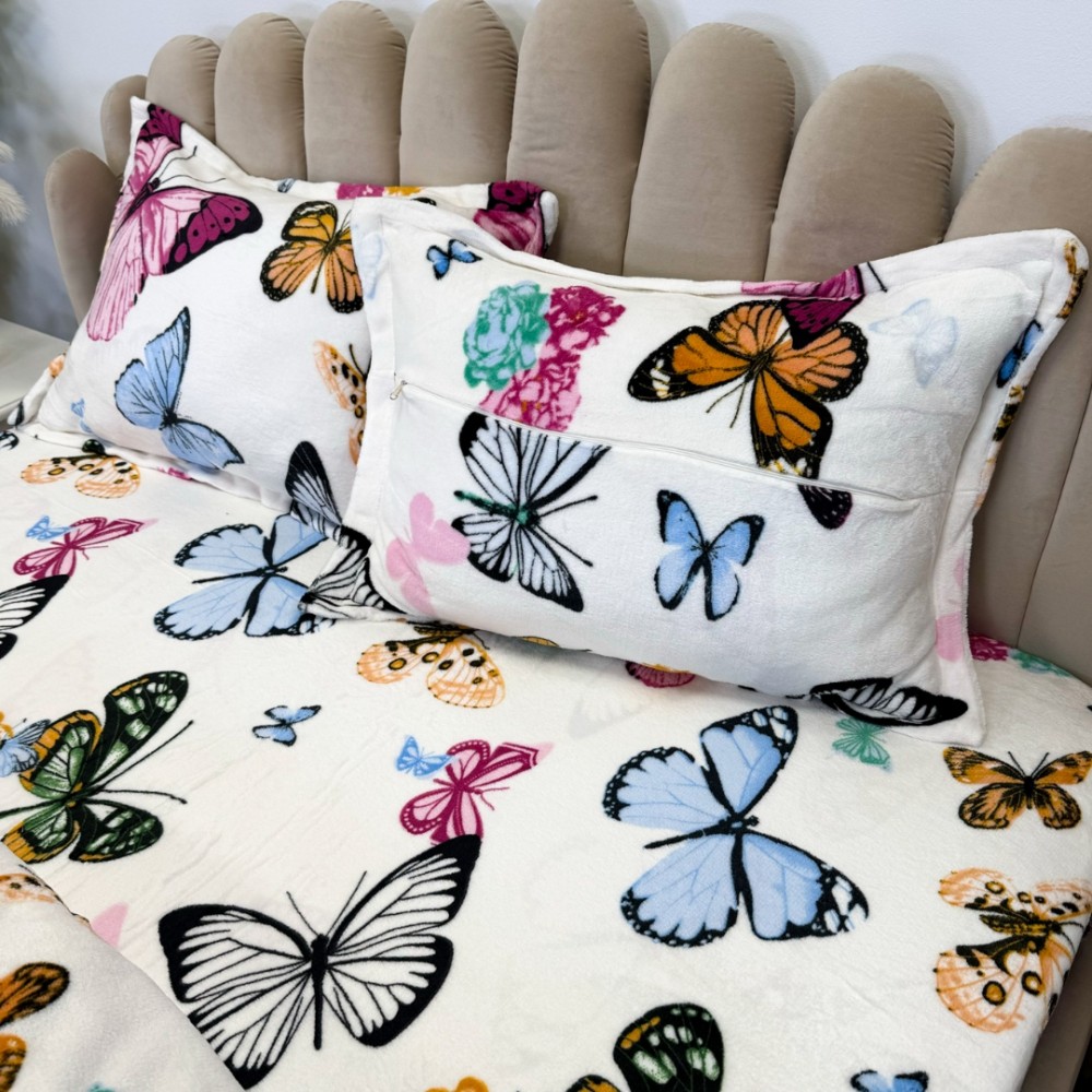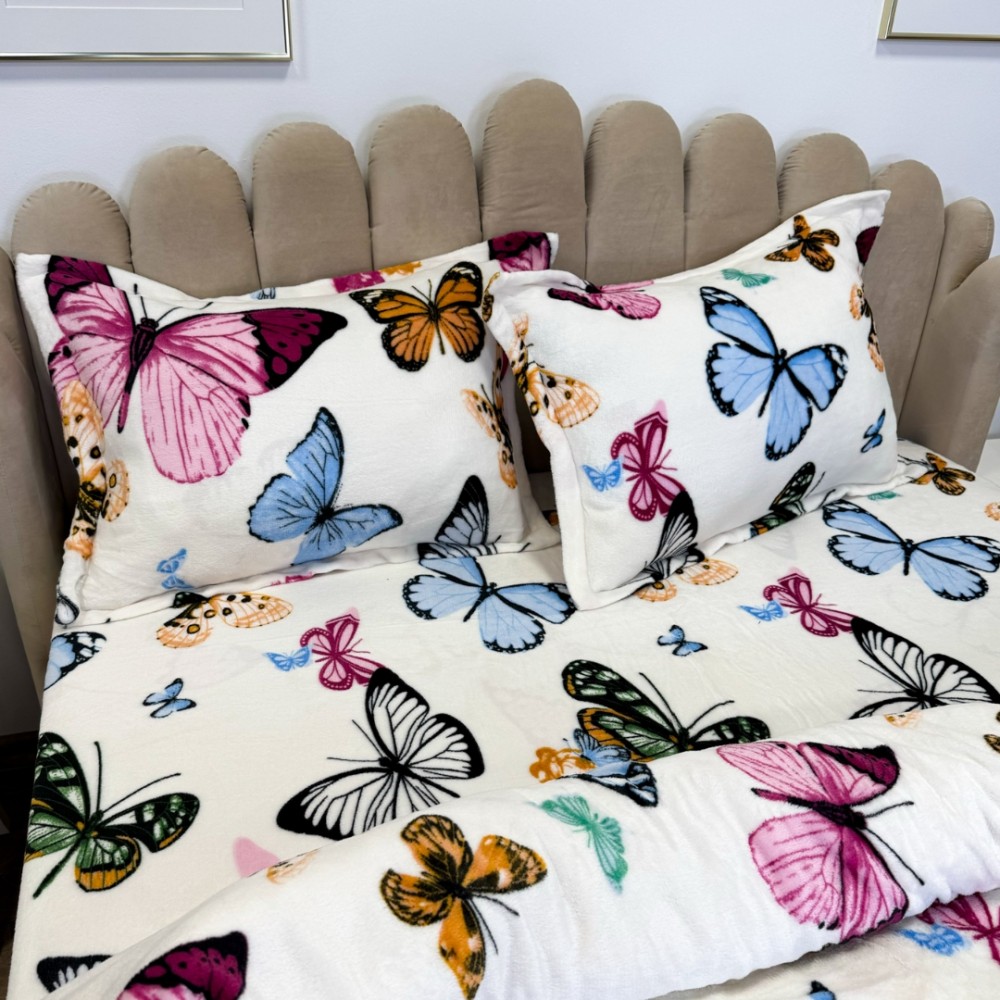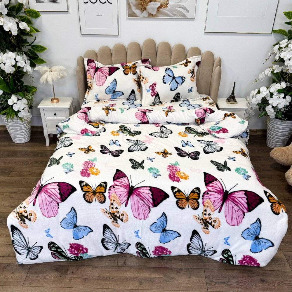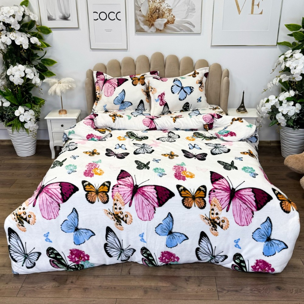 Lenjerie pat dublu, Super Pufoasa COCOLINO, 4 piese, Alb, Multicolor, fluturi, cod produs: LEC3