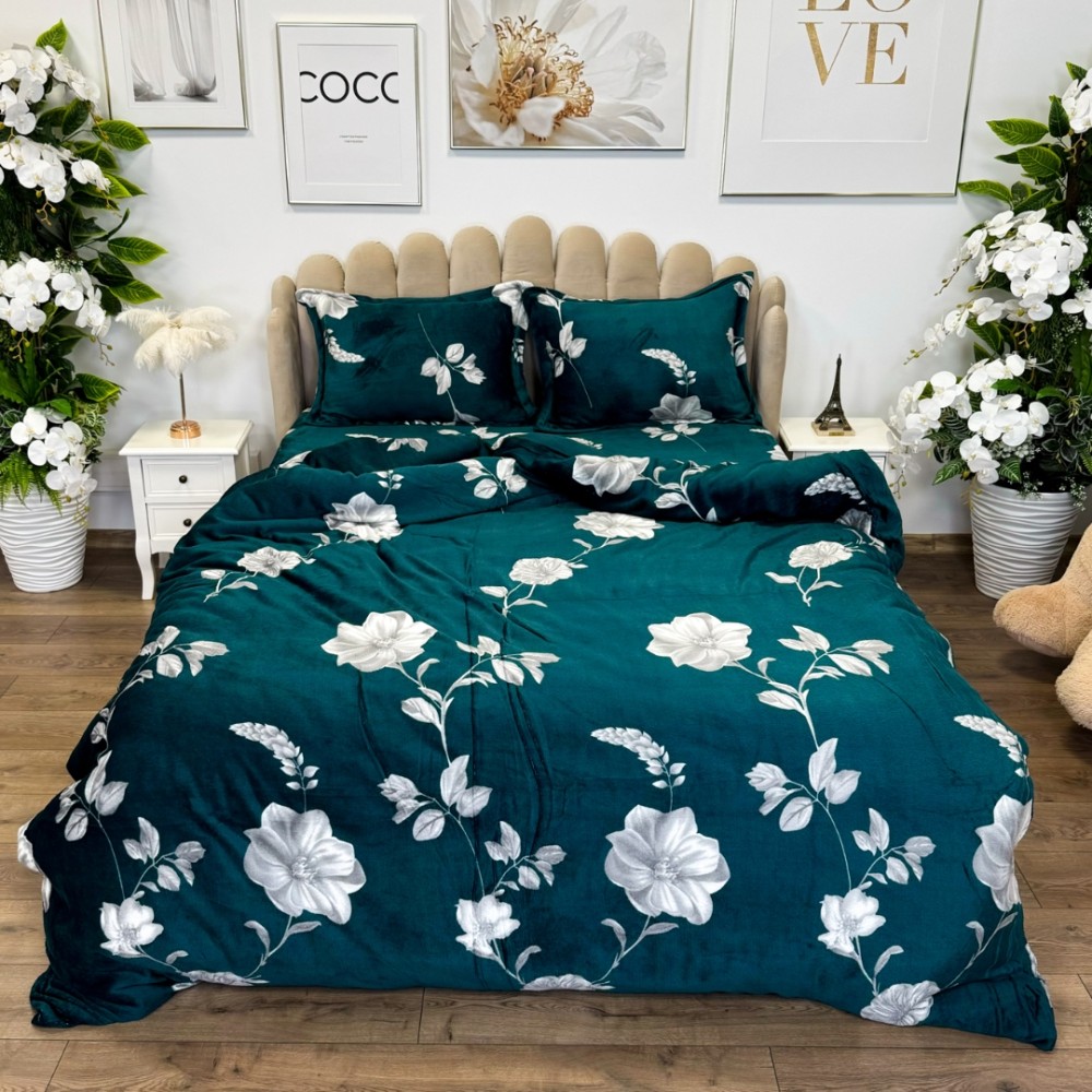 Lenjerie pat dublu, Super Pufoasa COCOLINO, 4 piese, Albastru petrol, flori, cod produs: LEC18