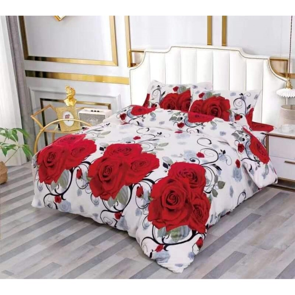 Lenjerie pat dublu, Super Pufoasa COCOLINO, 4 piese, cu ELASTIC, Alb-Rosu, Trandafiri, cod produs: LEC104