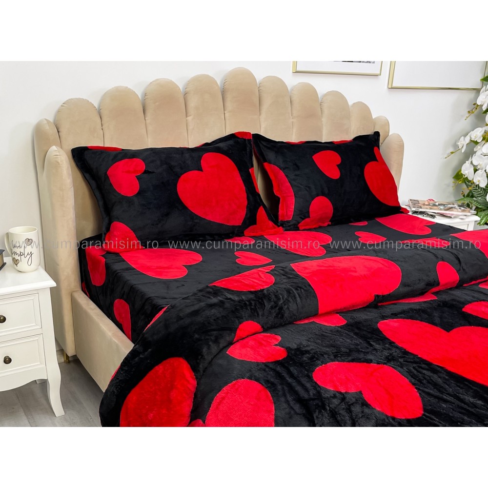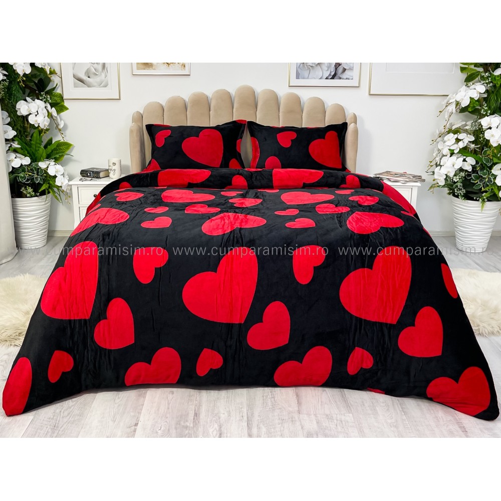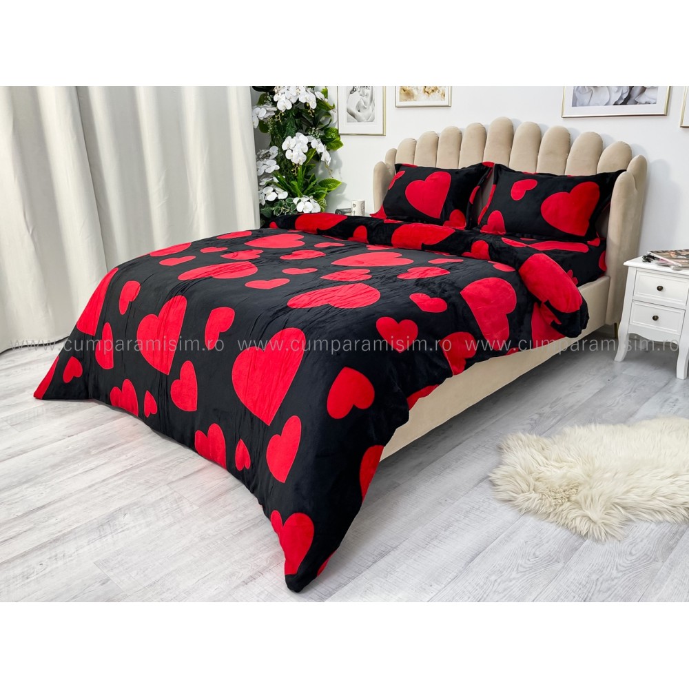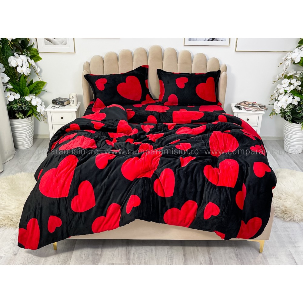 Lenjerie pat dublu, Super Pufoasa COCOLINO, 4 piese, cu ELASTIC, Negru, Roșu, inimioare, cod produs: LEC105