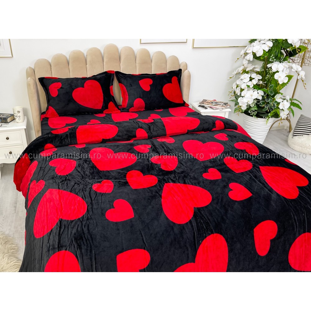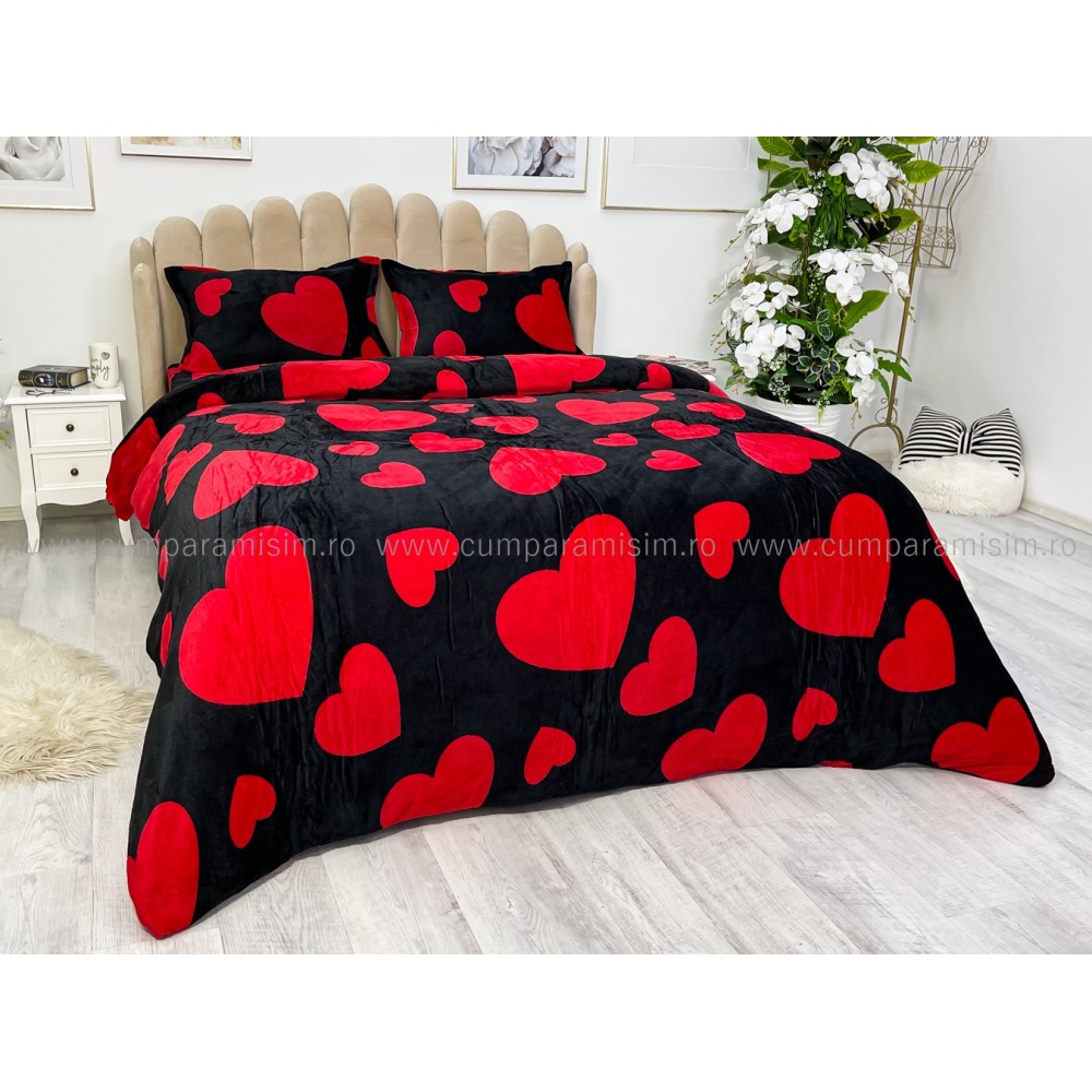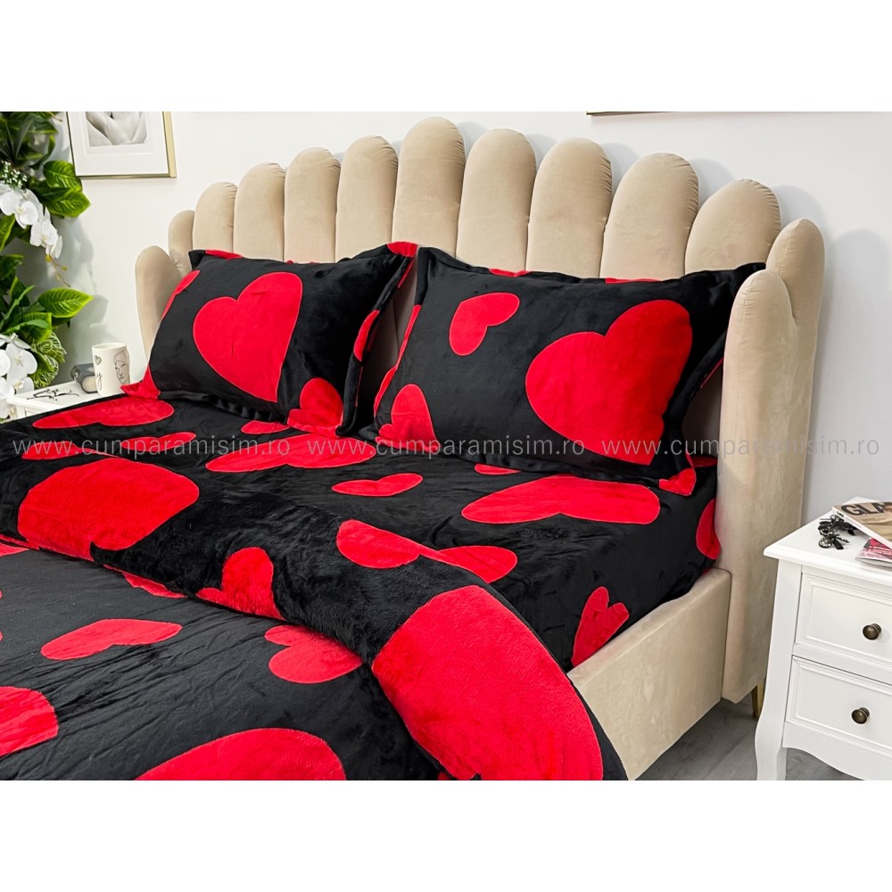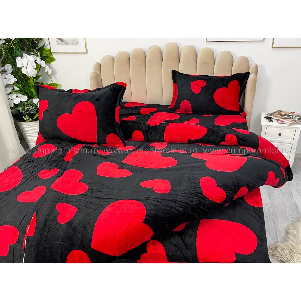 Lenjerie pat dublu, Super Pufoasa COCOLINO, 4 piese, cu ELASTIC, Negru, Roșu, inimioare, cod produs: LEC105