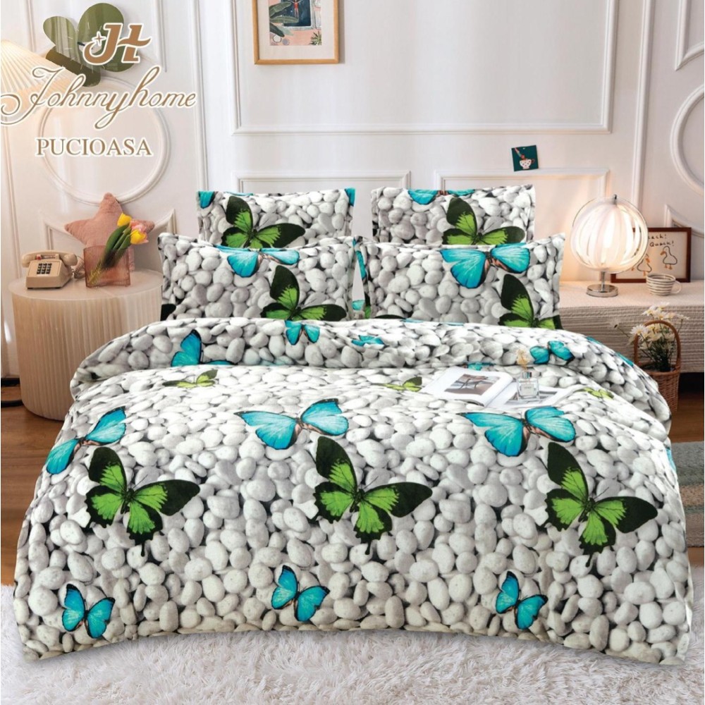 Lenjerie pat dublu, Super Pufoasa COCOLINO, 6 piese, Gri, pietre, fluturi, Johny Home Pucioasa, cod produs: SPR-F08