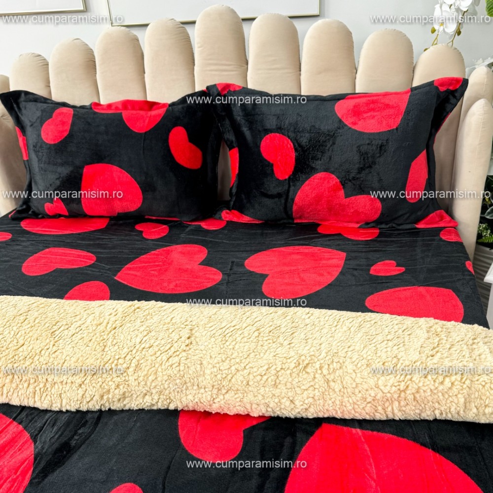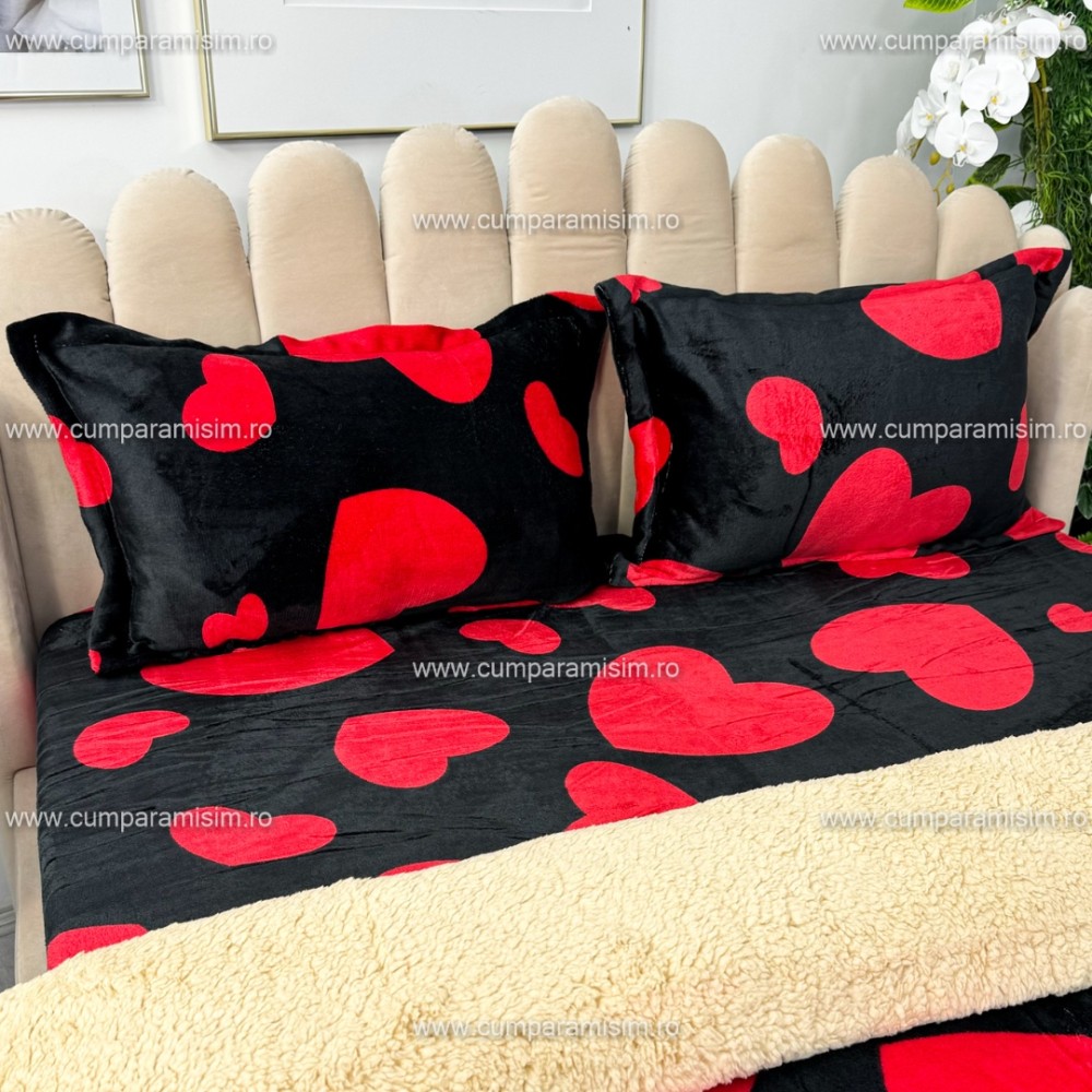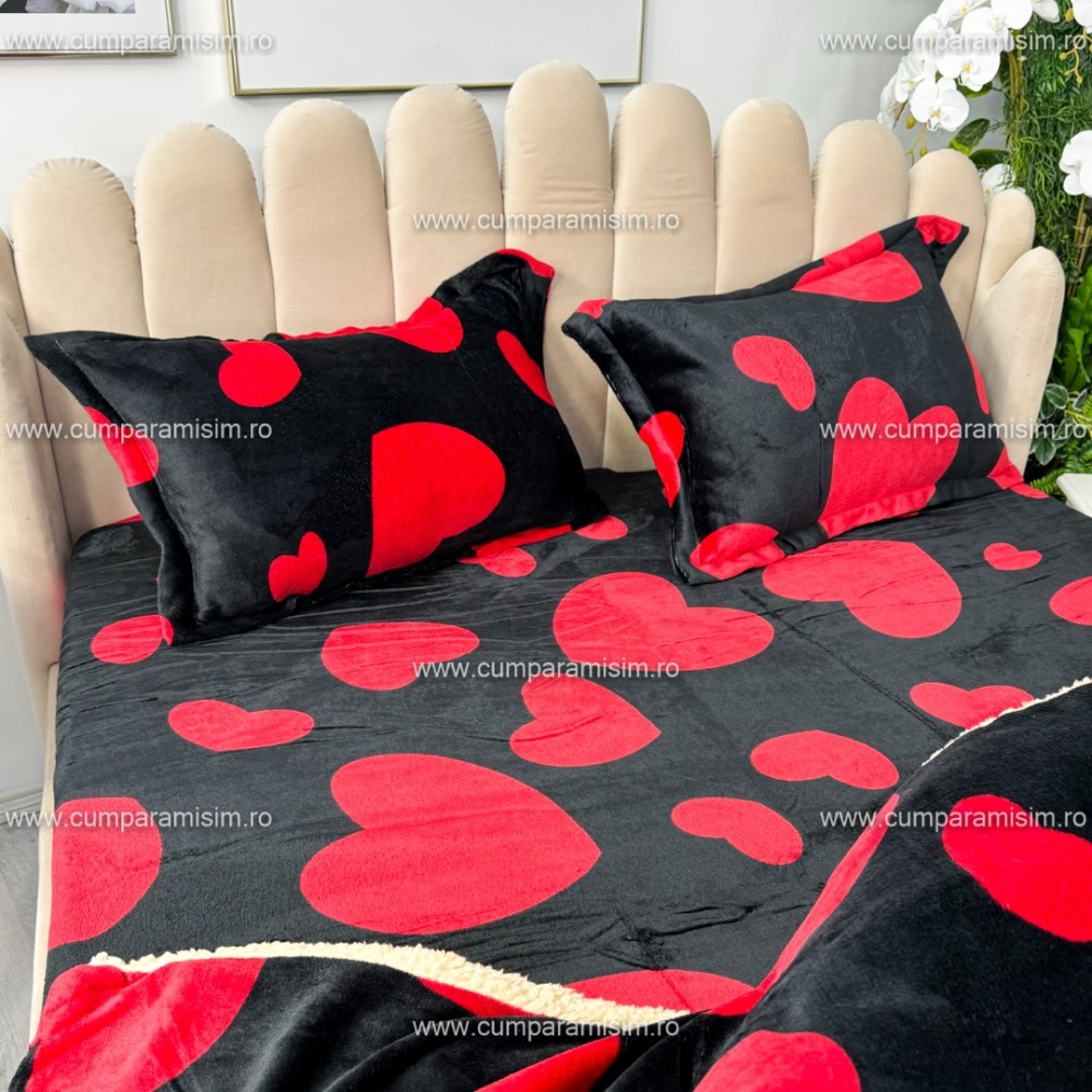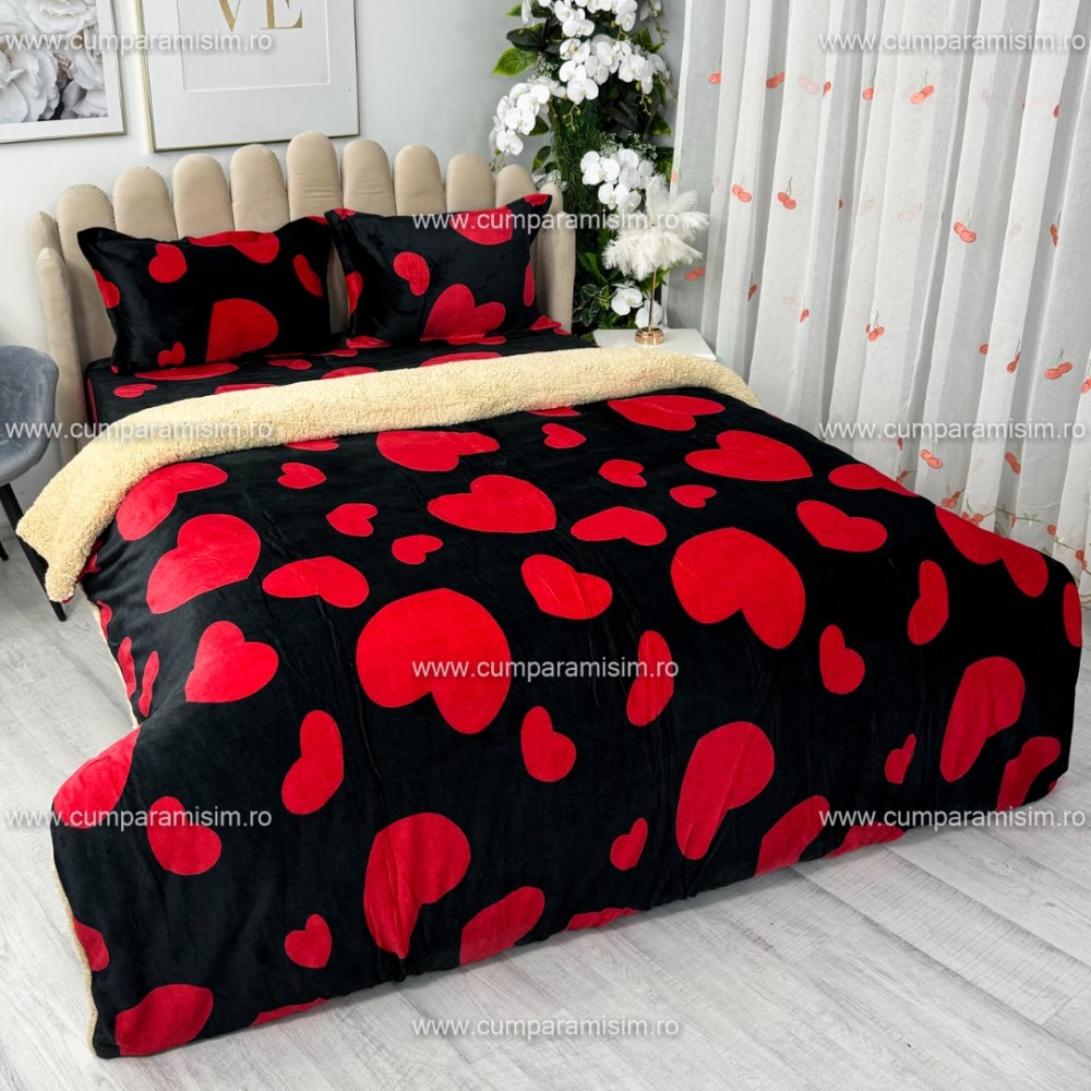 Lenjerie pat dublu, Super Pufoasa COCOLINO cu BLANITA, 4 piese, Negru-Rosu, inimioare, CumparaMisim, cod produs: YAF127