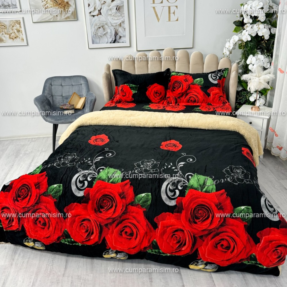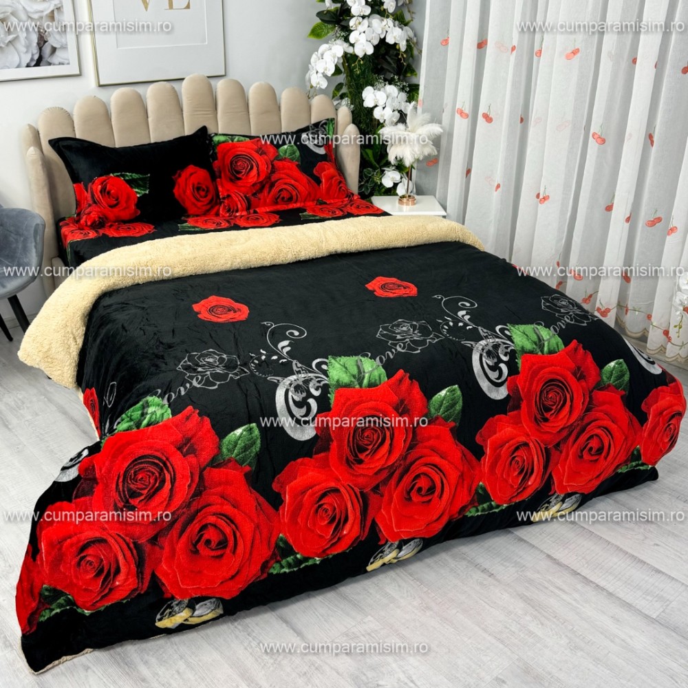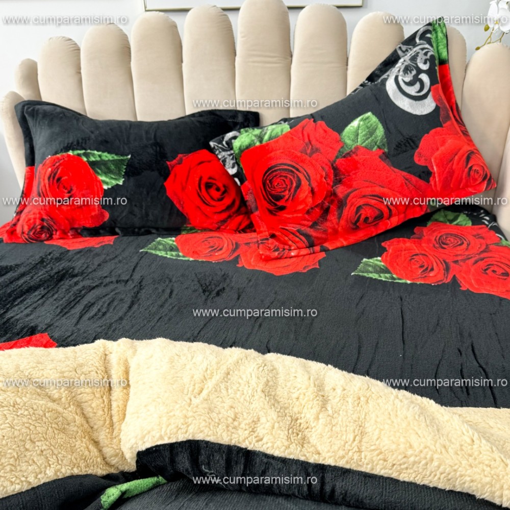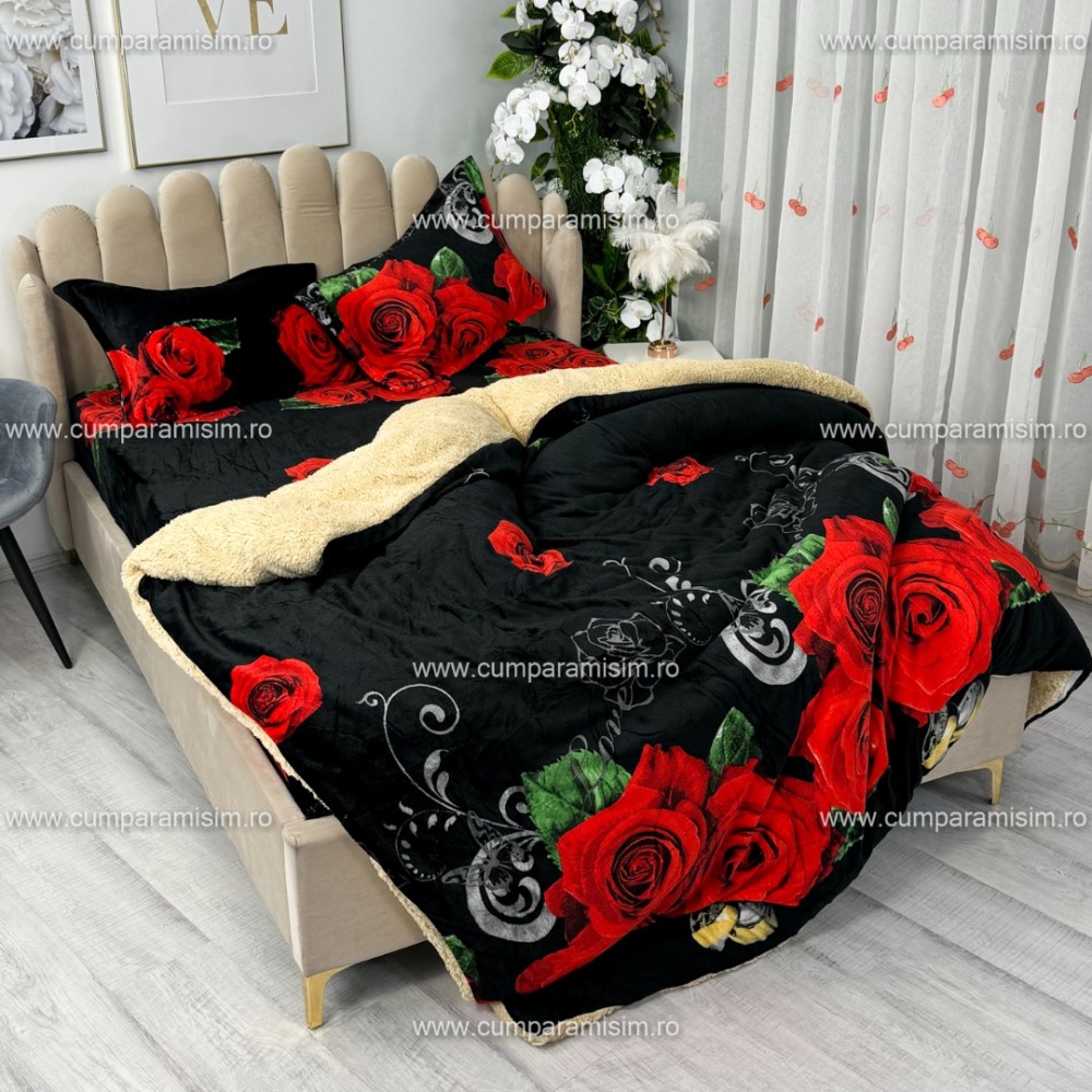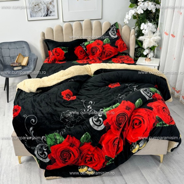 Lenjerie pat dublu, Super Pufoasa COCOLINO cu BLANITA, 4 piese, Negru-Rosu, Trandafiri, CumparaMisim, cod produs: YAF110