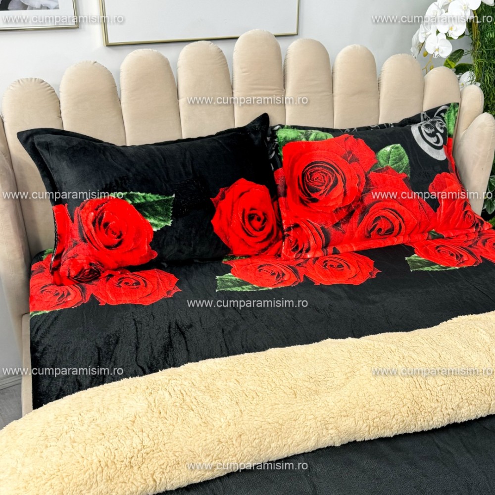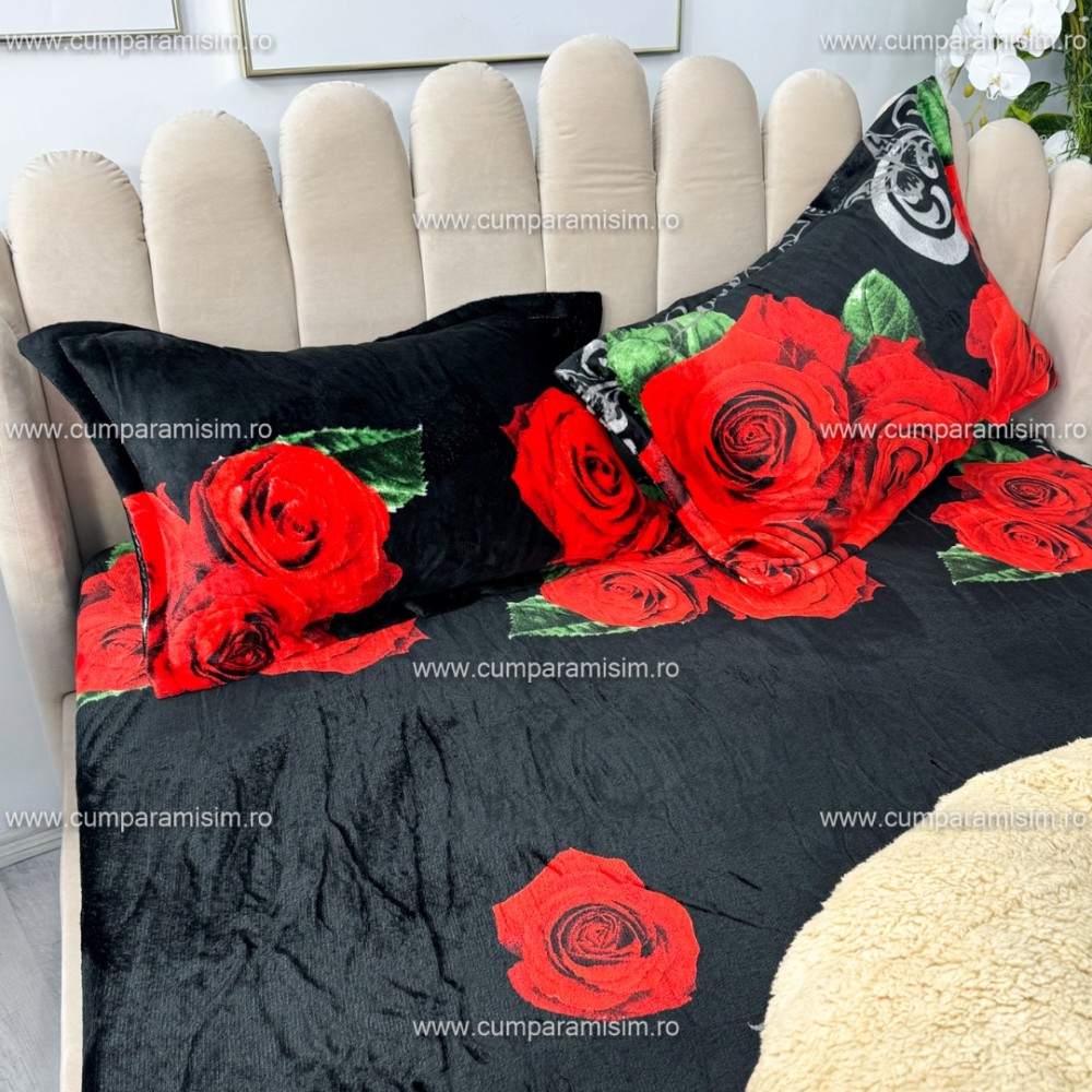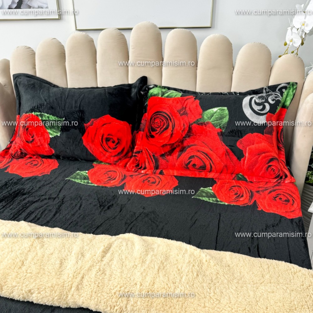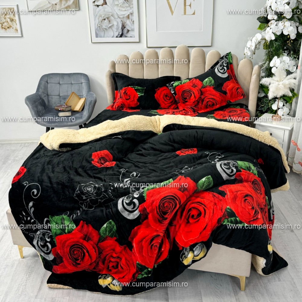 Lenjerie pat dublu, Super Pufoasa COCOLINO cu BLANITA, 4 piese, Negru-Rosu, Trandafiri, CumparaMisim, cod produs: YAF110